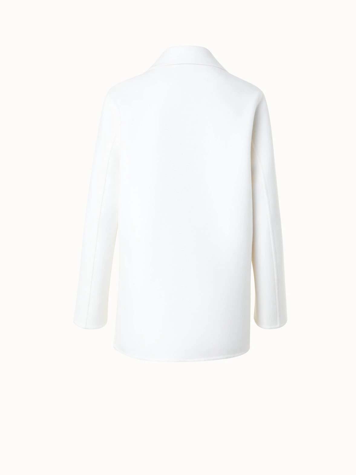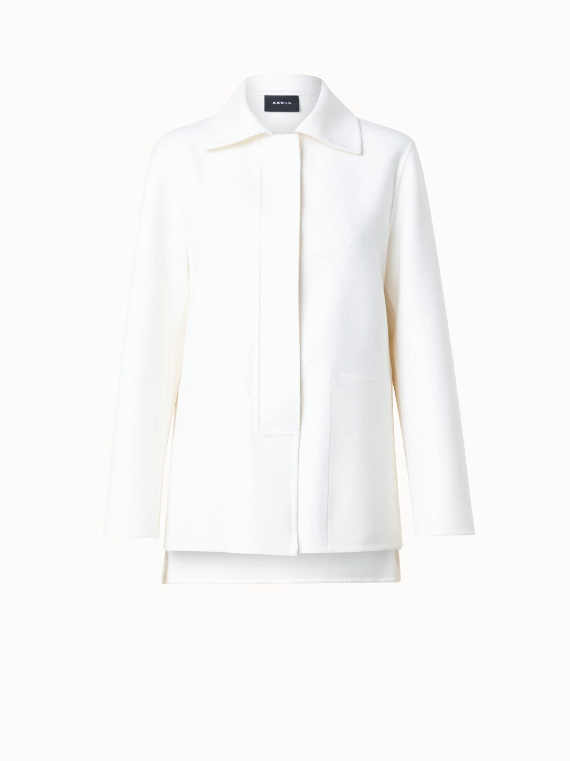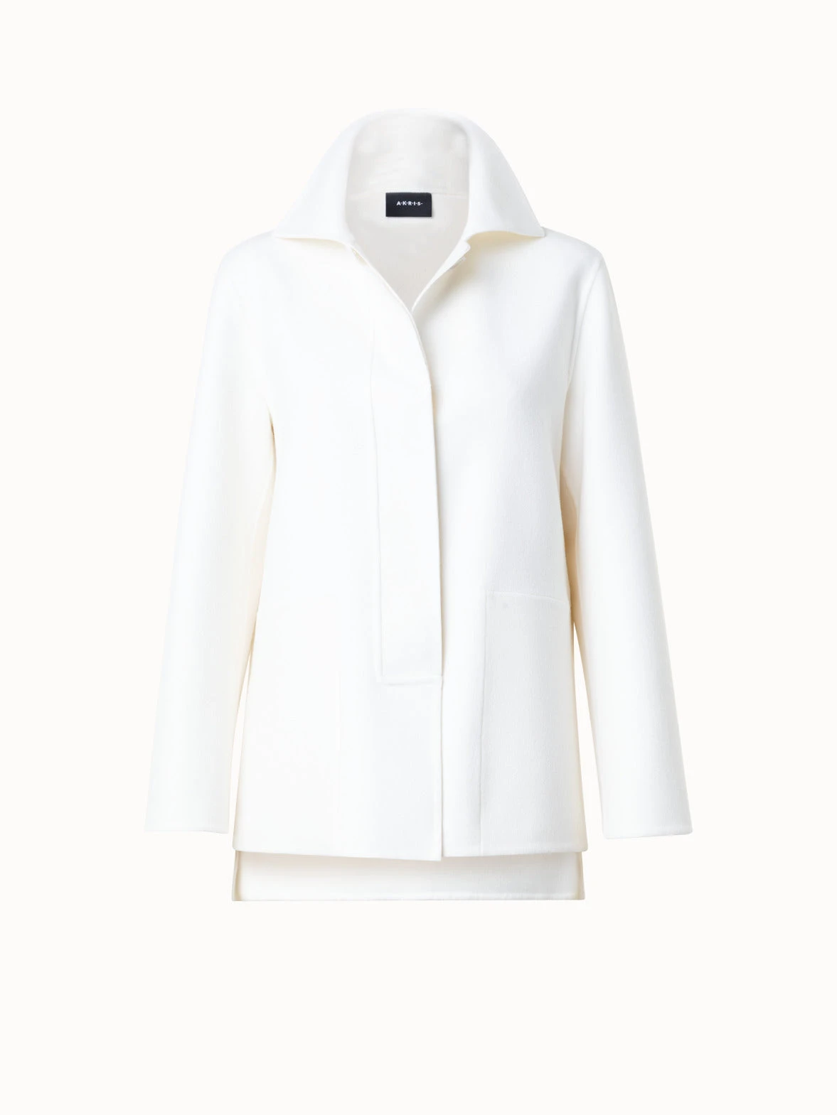 This Akris long jacket Laars is crafted in cashmere double-face, making it an understated staple piece. It features a hidden button closure and shirt collar for a sophisticated appearance. The big seam pockets add practicality and coziness. The longer back ensures you stay comfortable on windy days. Cut for a slightly oversized fit.