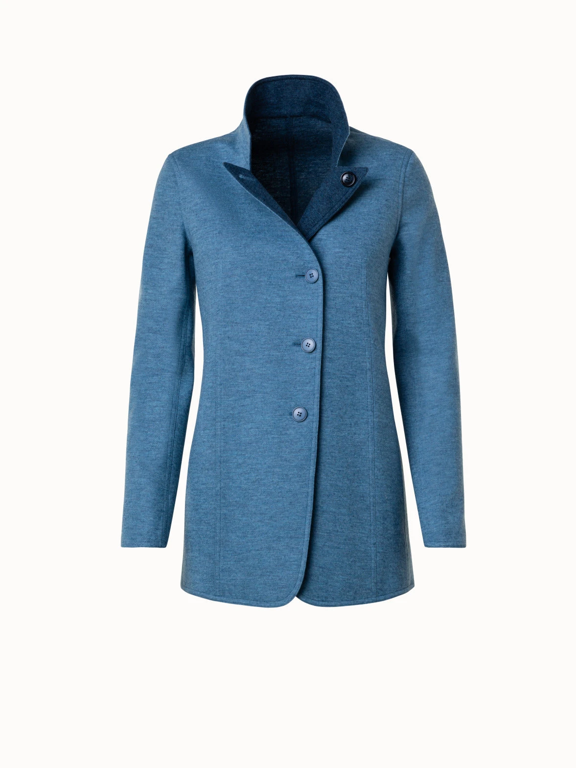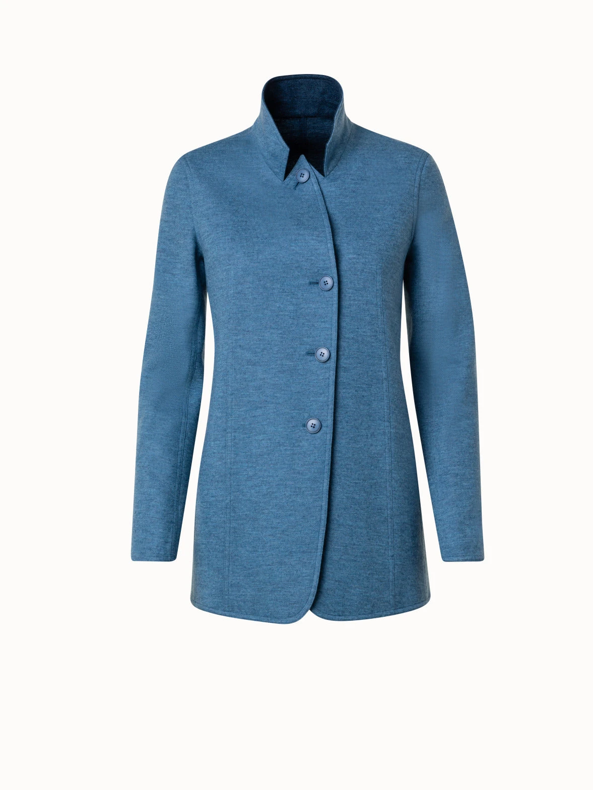 This Akris long jacket Liam is crafted in a comfortable yet elegant cashmere jersey. It features an asymmetrical button closure with the look of an inward folded lapel. The tailored cut creates a sophisticated and flattering silhouette that is underlined by sleek seam pockets.