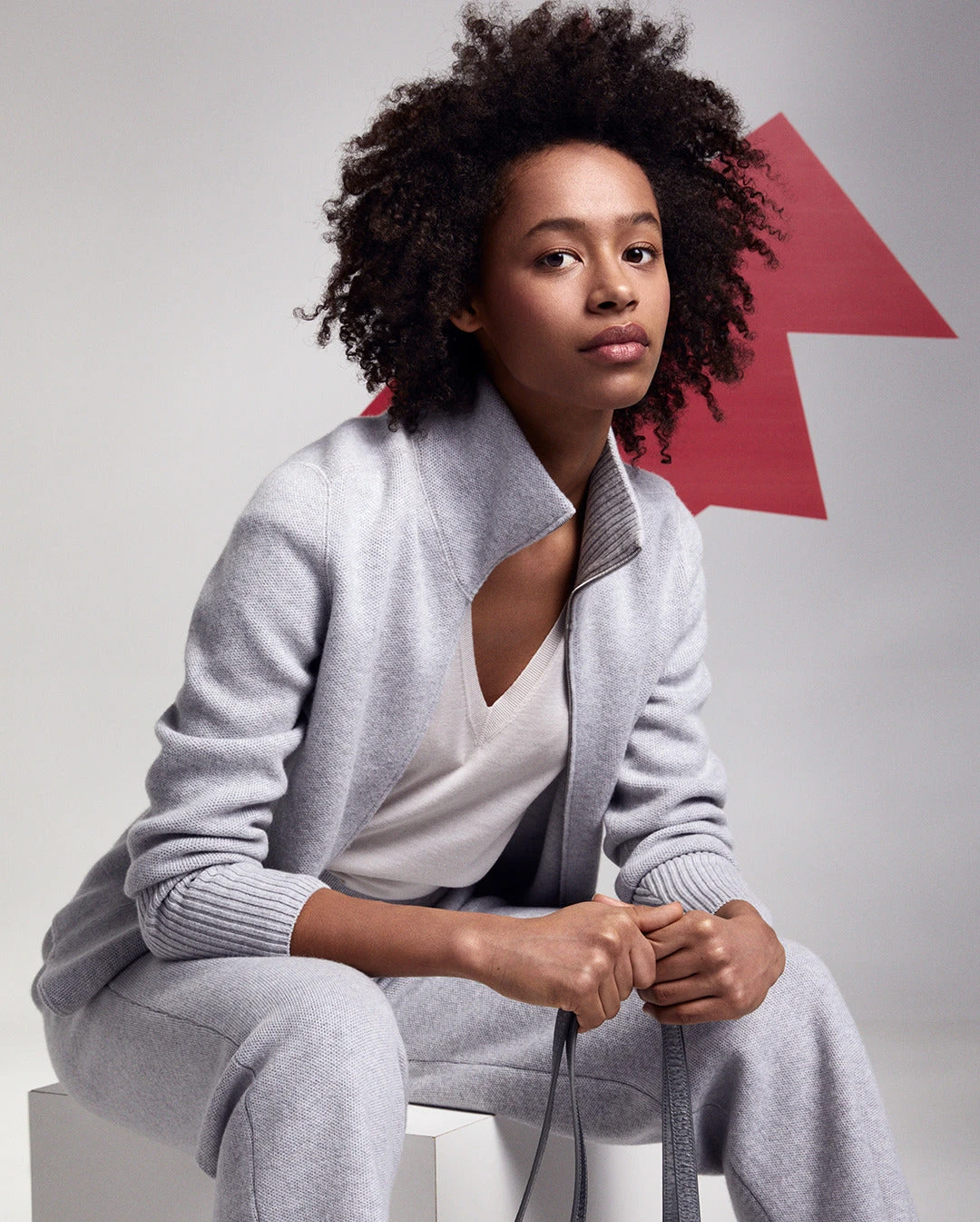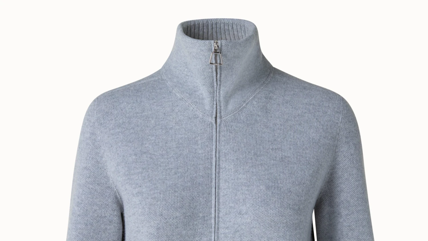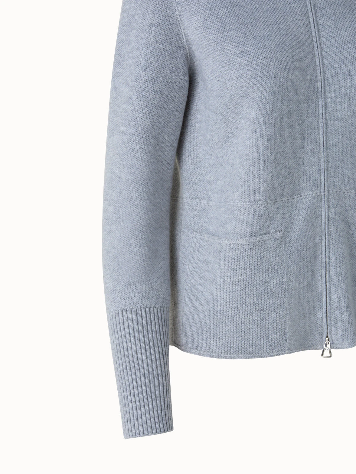 Casual knit cardigan in precious cashmere pique. Features stand up collar, zip closure, pockets and ribbed collar and cuff.