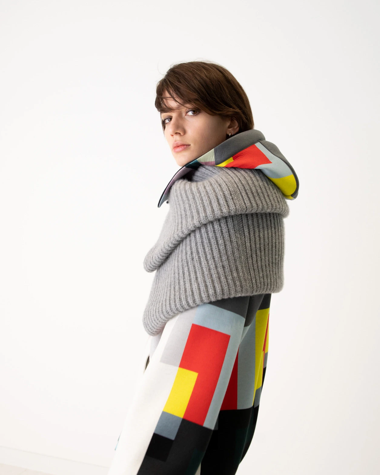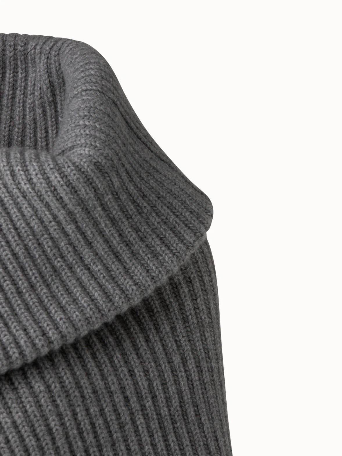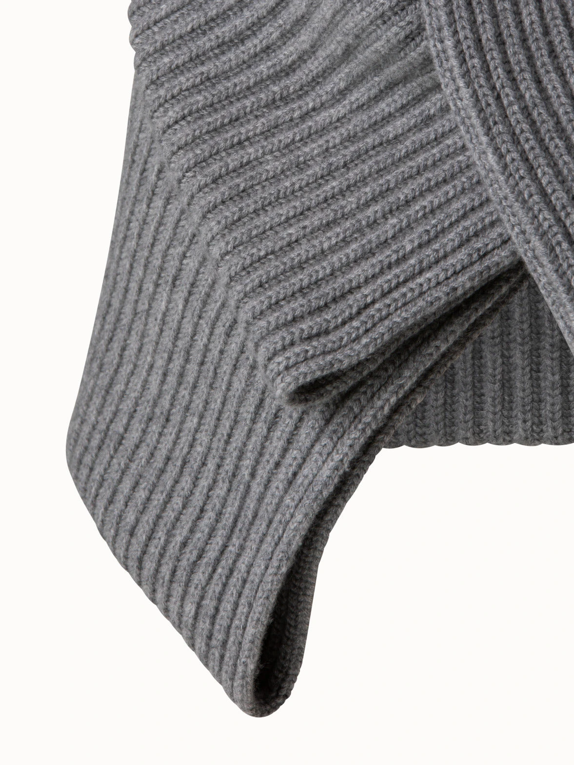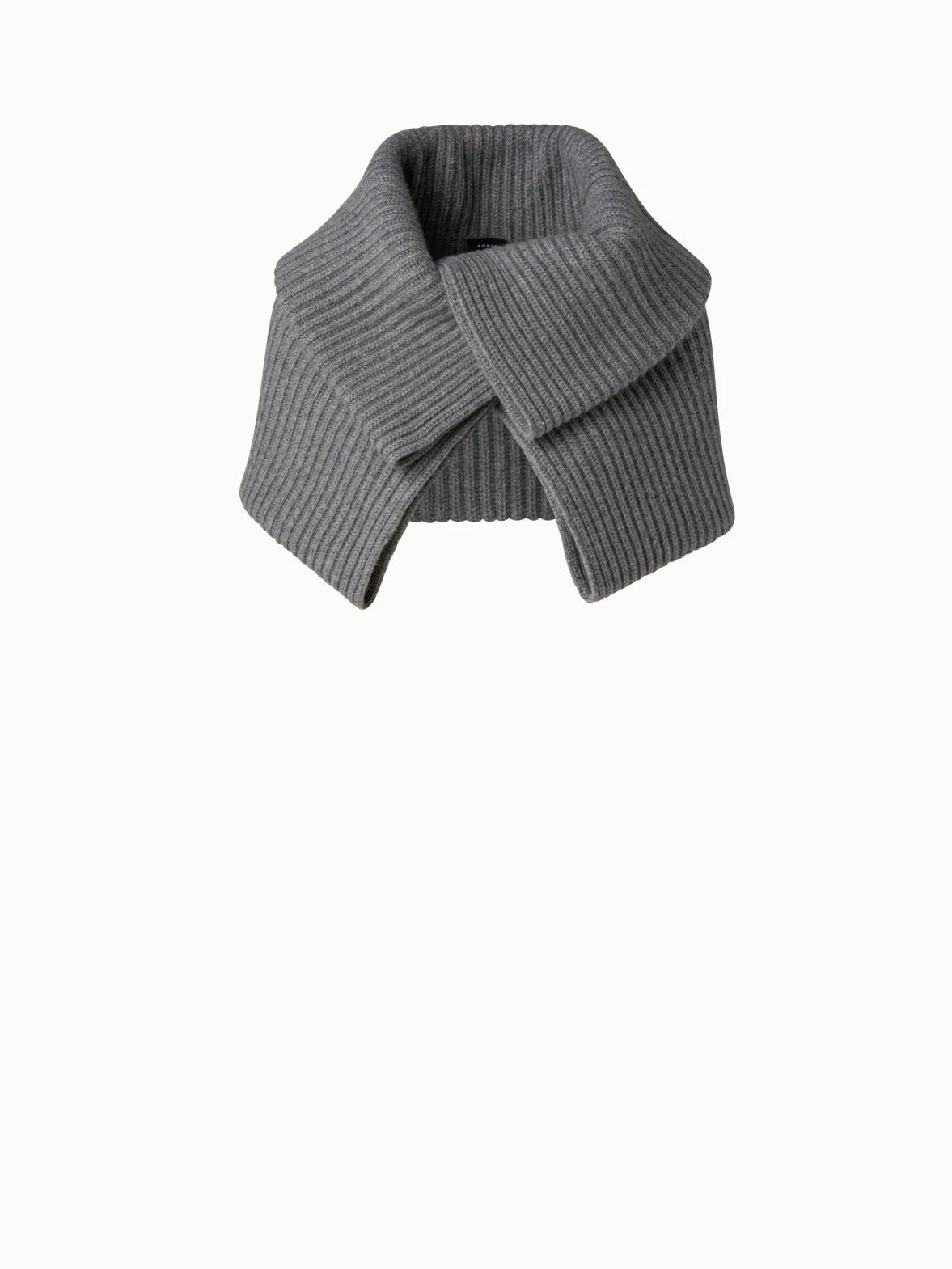 This chunky knit scarf is designed to keep you warm and cozy when the temperatures drop. It is crafted in soft ribbed cashmere with a cardigan stitch. Closes with a hook.