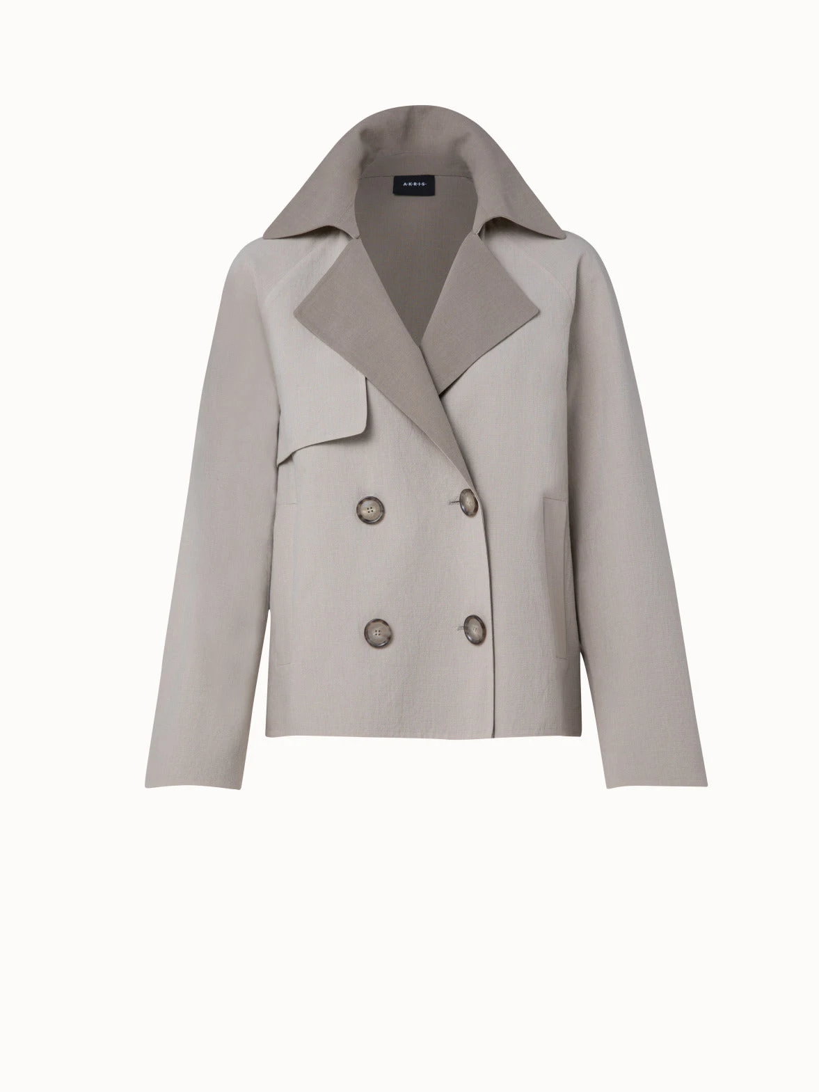 This Akris jacket Mira is a new take on the much-loved trenchcoat. Crafted in cotton double-face, it is perfect for spring and summer days while receiving a subtle two-tone look. The double-breasted closure, storm flap on the back, and boxy fit give it the appearance of a cropped coat.