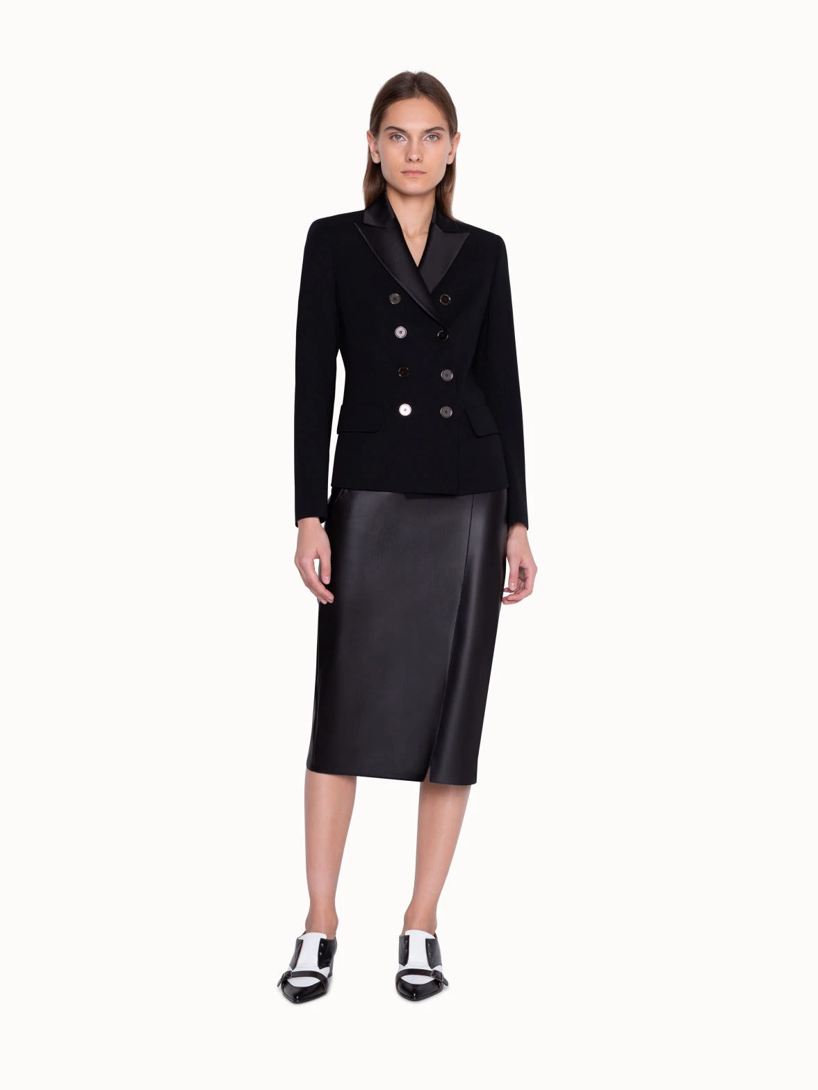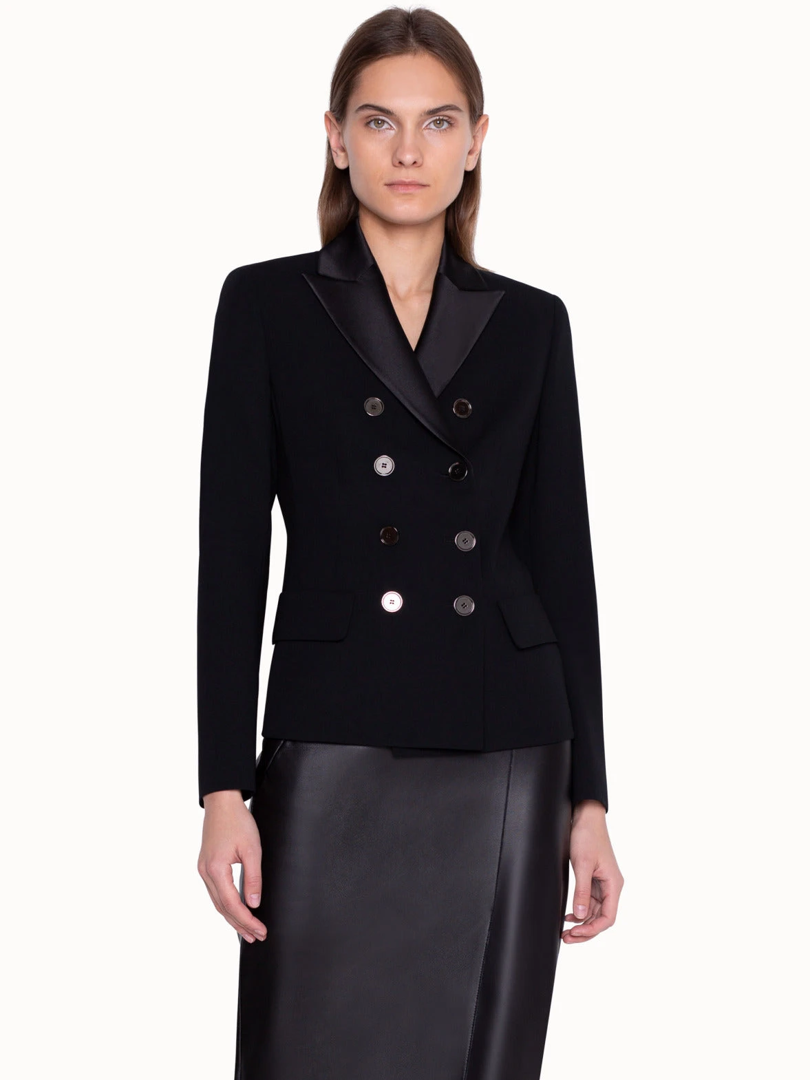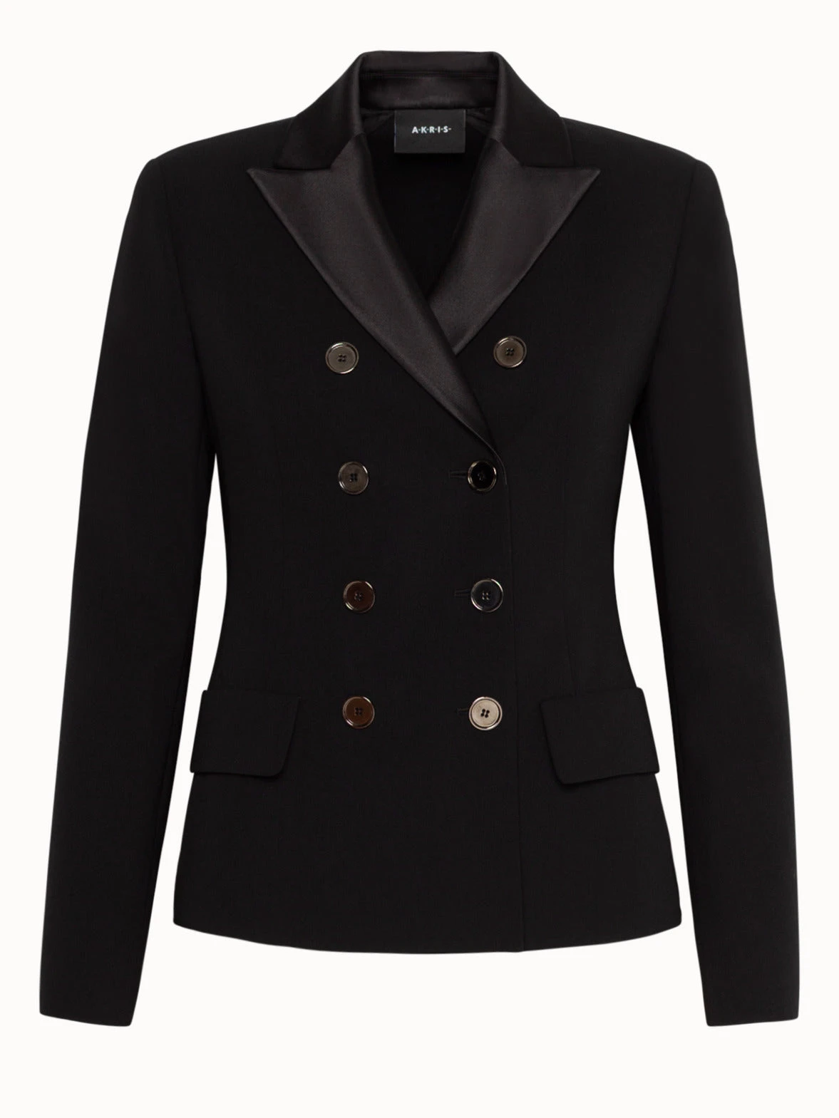 Make a statement in this elegant and timeless women’s blazer. Designed in double-face from the finest wool, this double-breasted black designer women’s blazer features a collar made of satin. Wear it with the matching black trousers or an Akris skirt and an elegant Anouk handbag made of black calfskin.