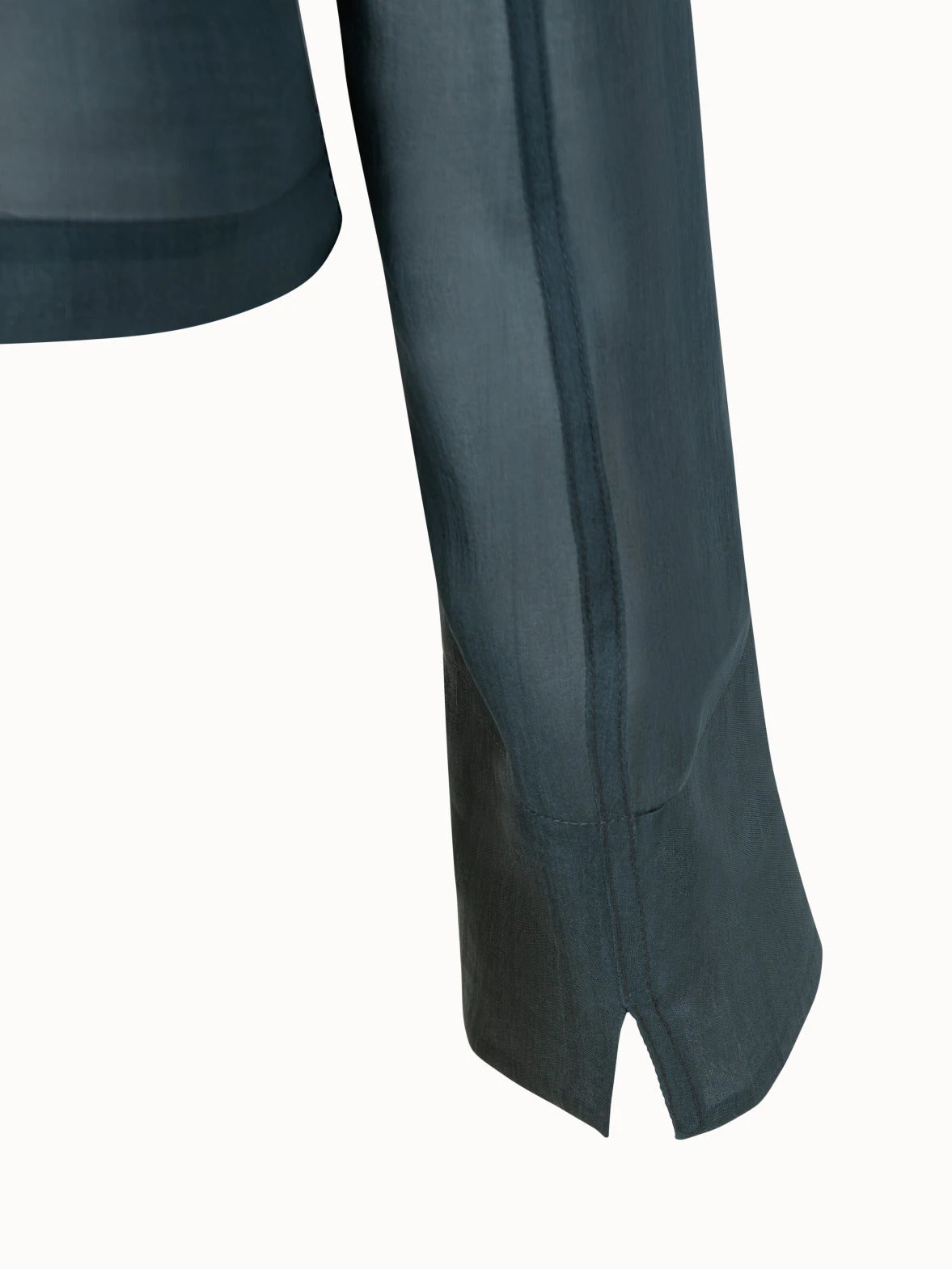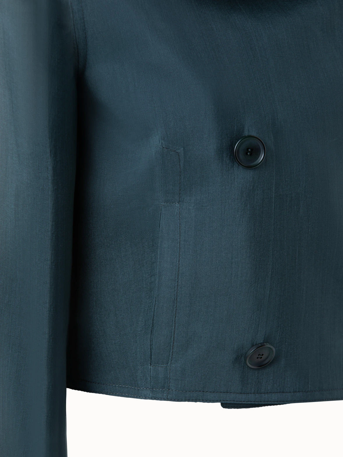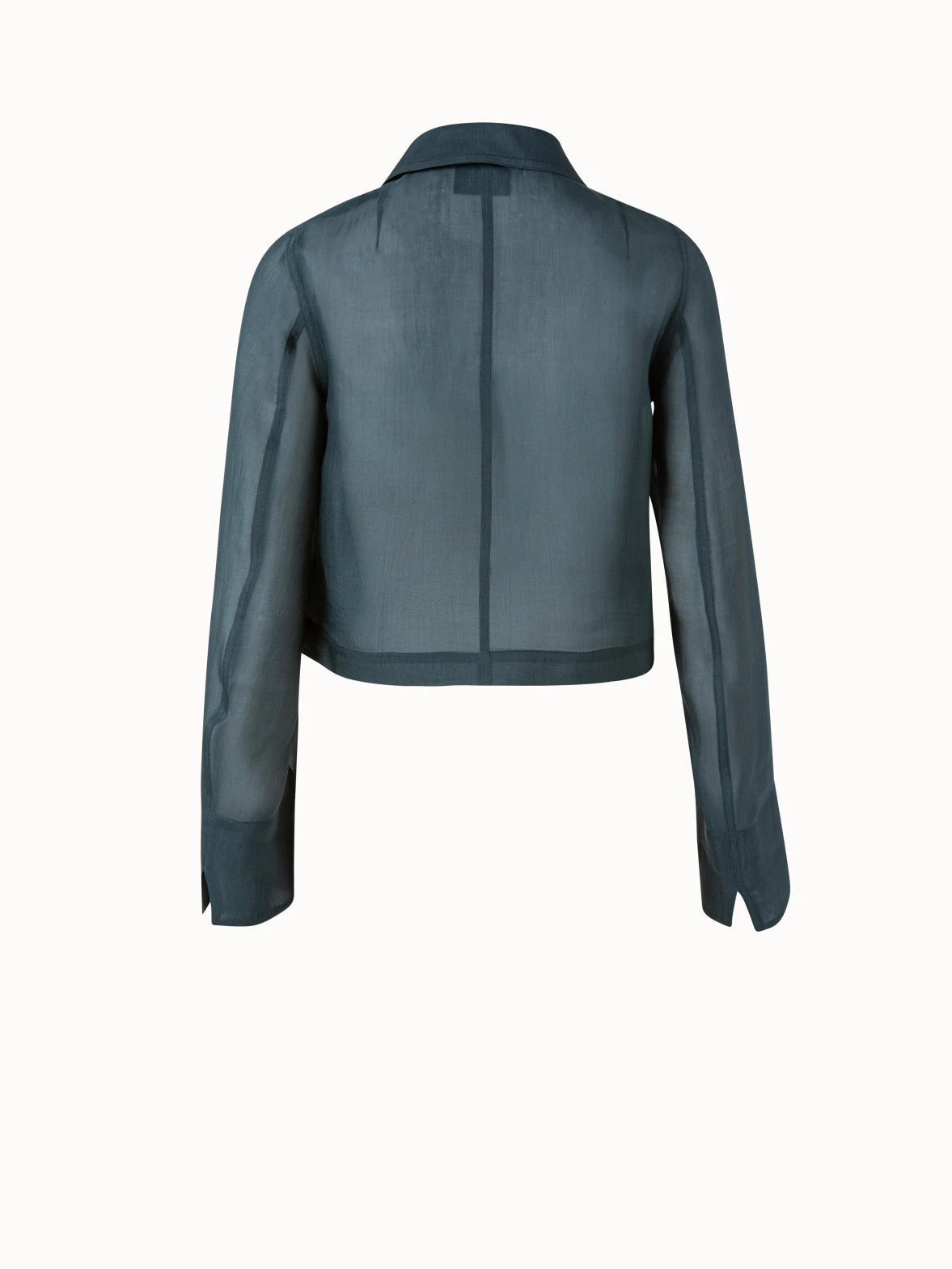 This ultrachic evening jacket is made from a semi-transparent silk organza. The double breasted style is cropped with a shirt collar.
