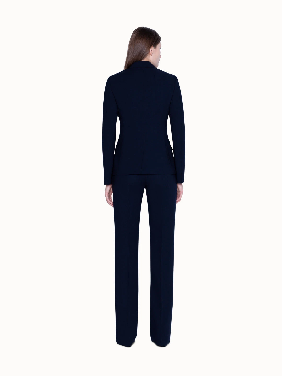 A versatile classic. This double breasted jacket in cool wool and stretch for comfort even in long meetings has a peak lapel. Wear it to work as a business smart pant suit with the matching pant. Combine it with the iconic Akris Ai bag in navy leather to complete your statement look.