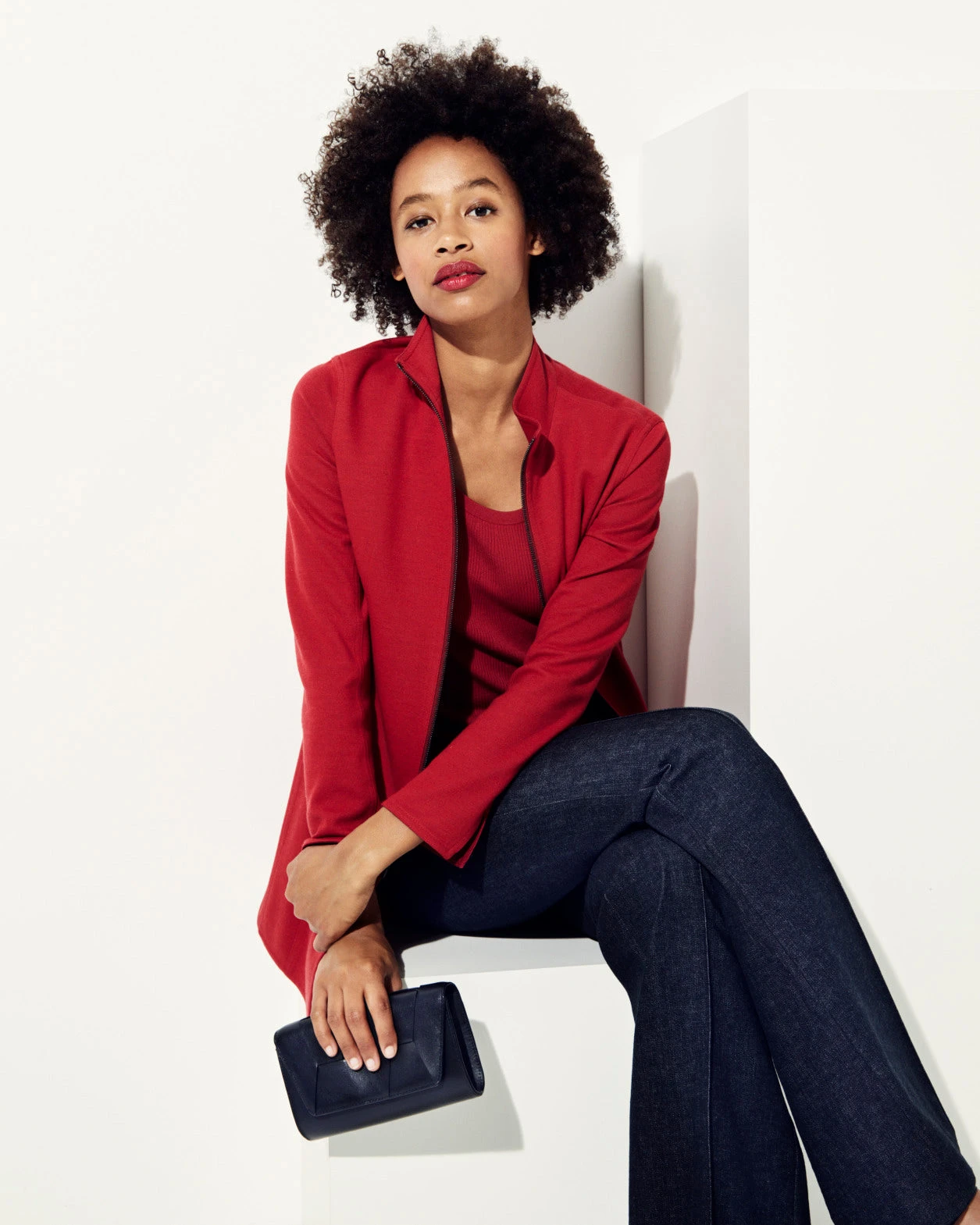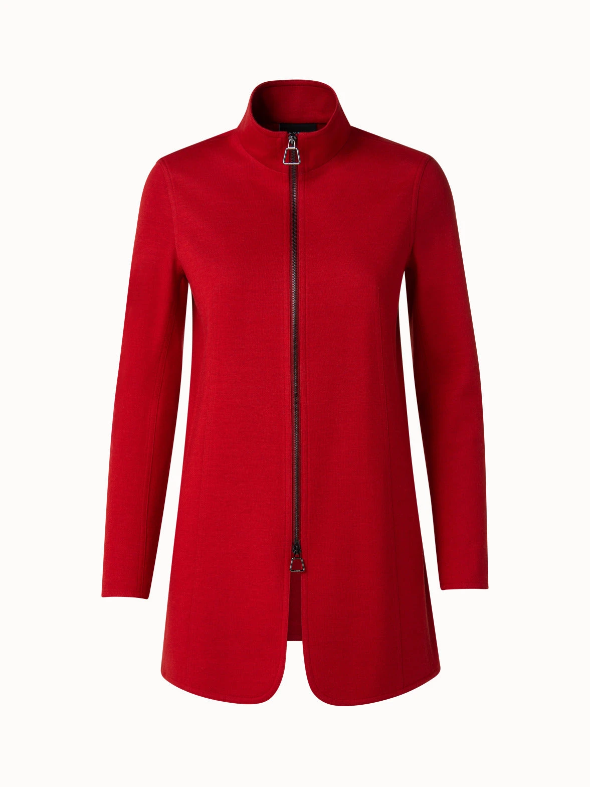 Our cashmere jersey double face is pure, unmatched luxury. This straight, long, zip front jacket has a relaxed feel, almost like knitwear. The sleek design has a stand up collar and seam pockets, making it ideal for traveling to casual workwear.