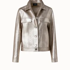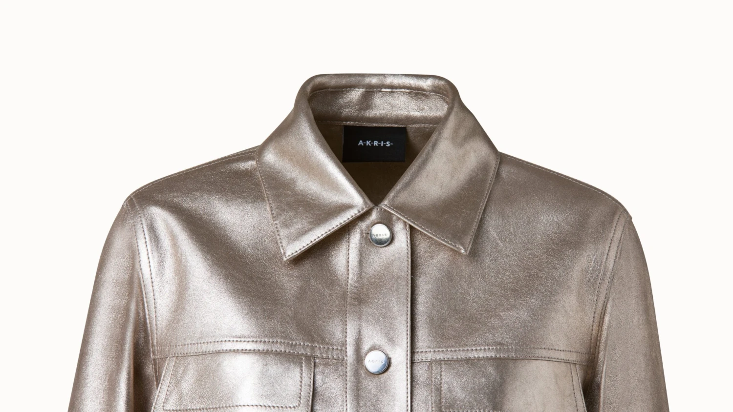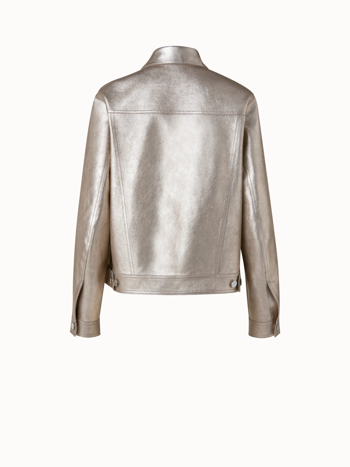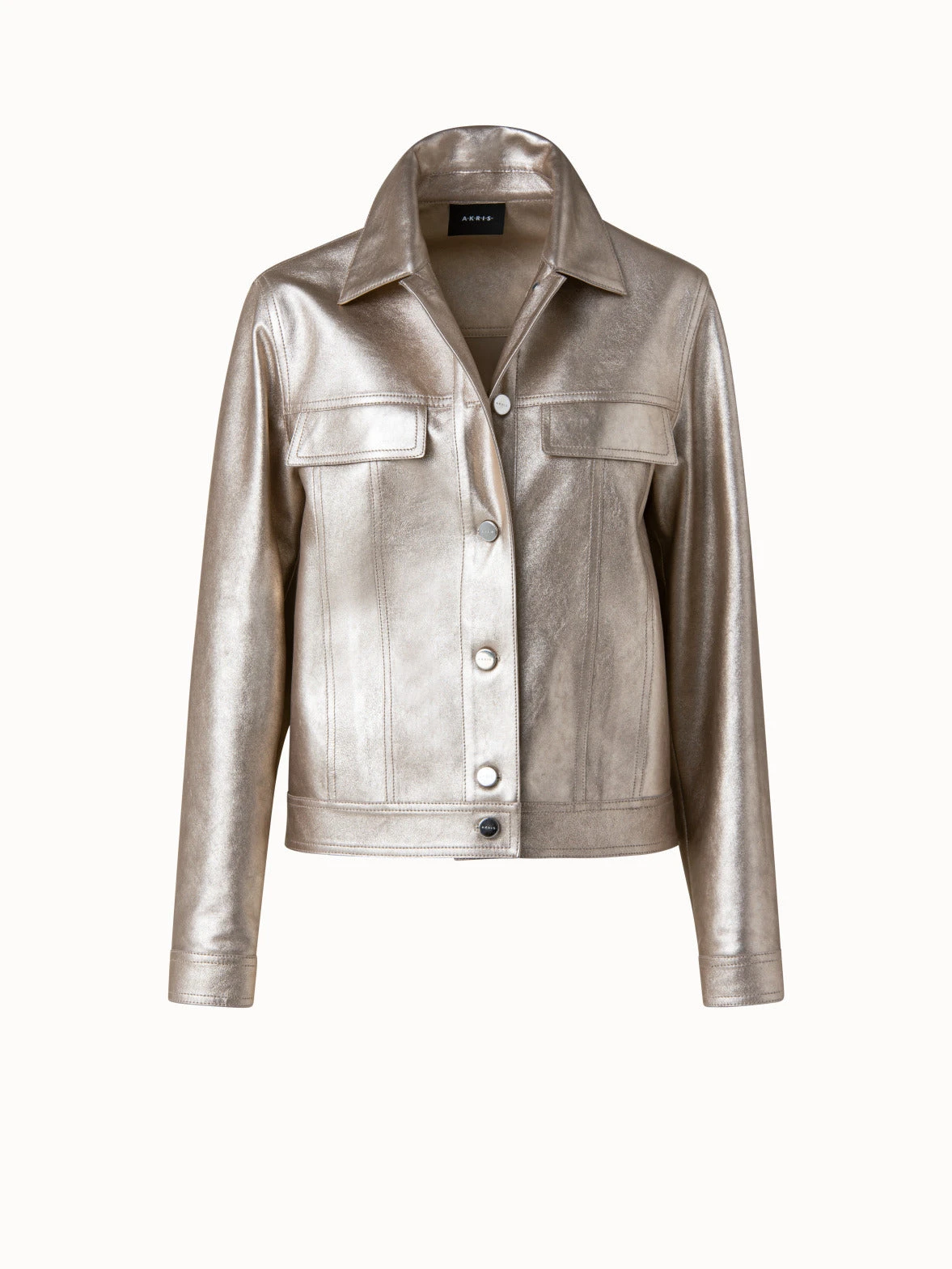 The Gemini jacket in metallic gold lamb nappa leather is the must-have jacket of the season. This style is cut in a timeless jean jacket silhouette featuring flap pockets and button closure and the buttery soft leather will mold to your body. Drape over your shoulders to Instantly modernize an evening look.