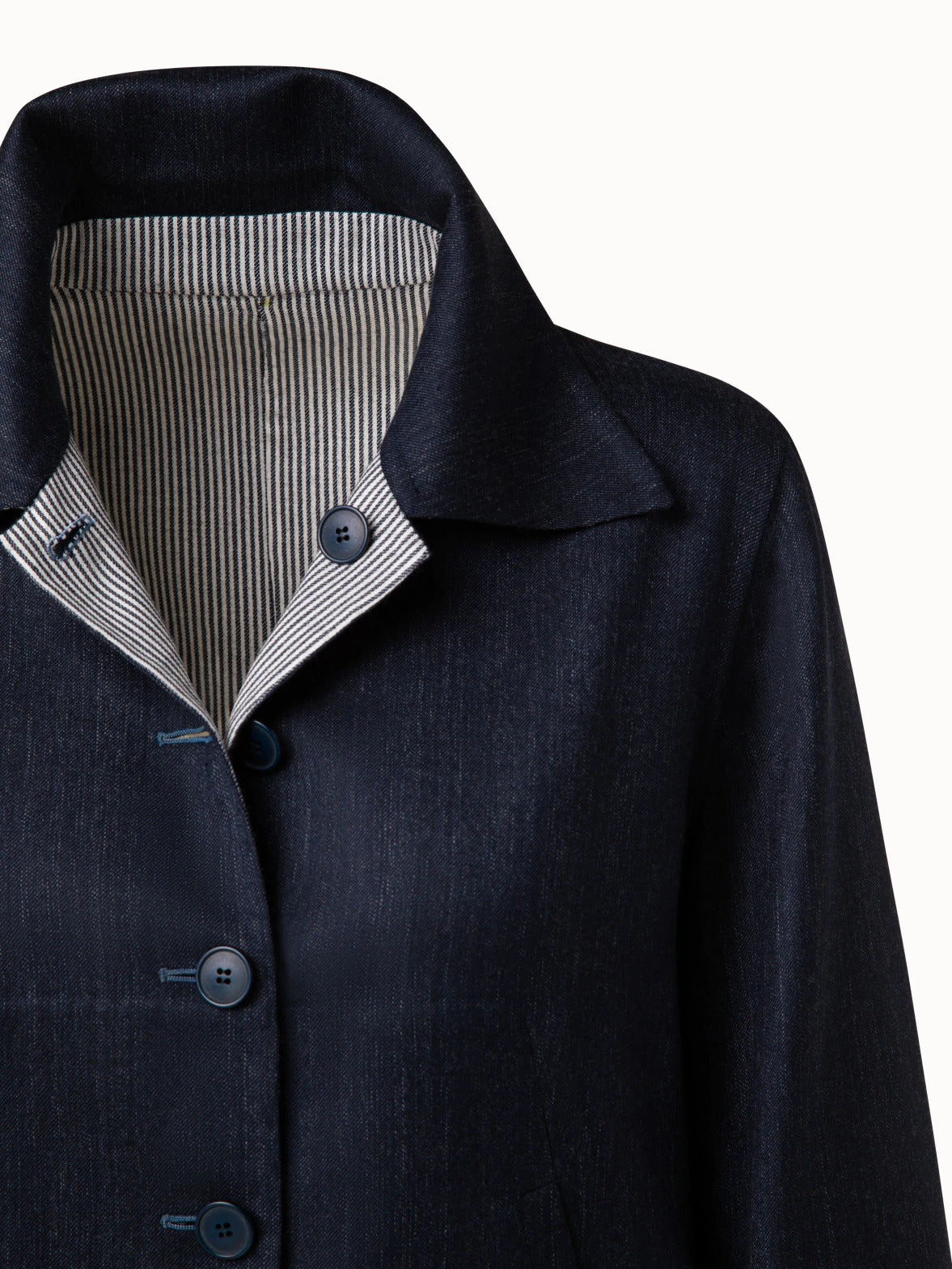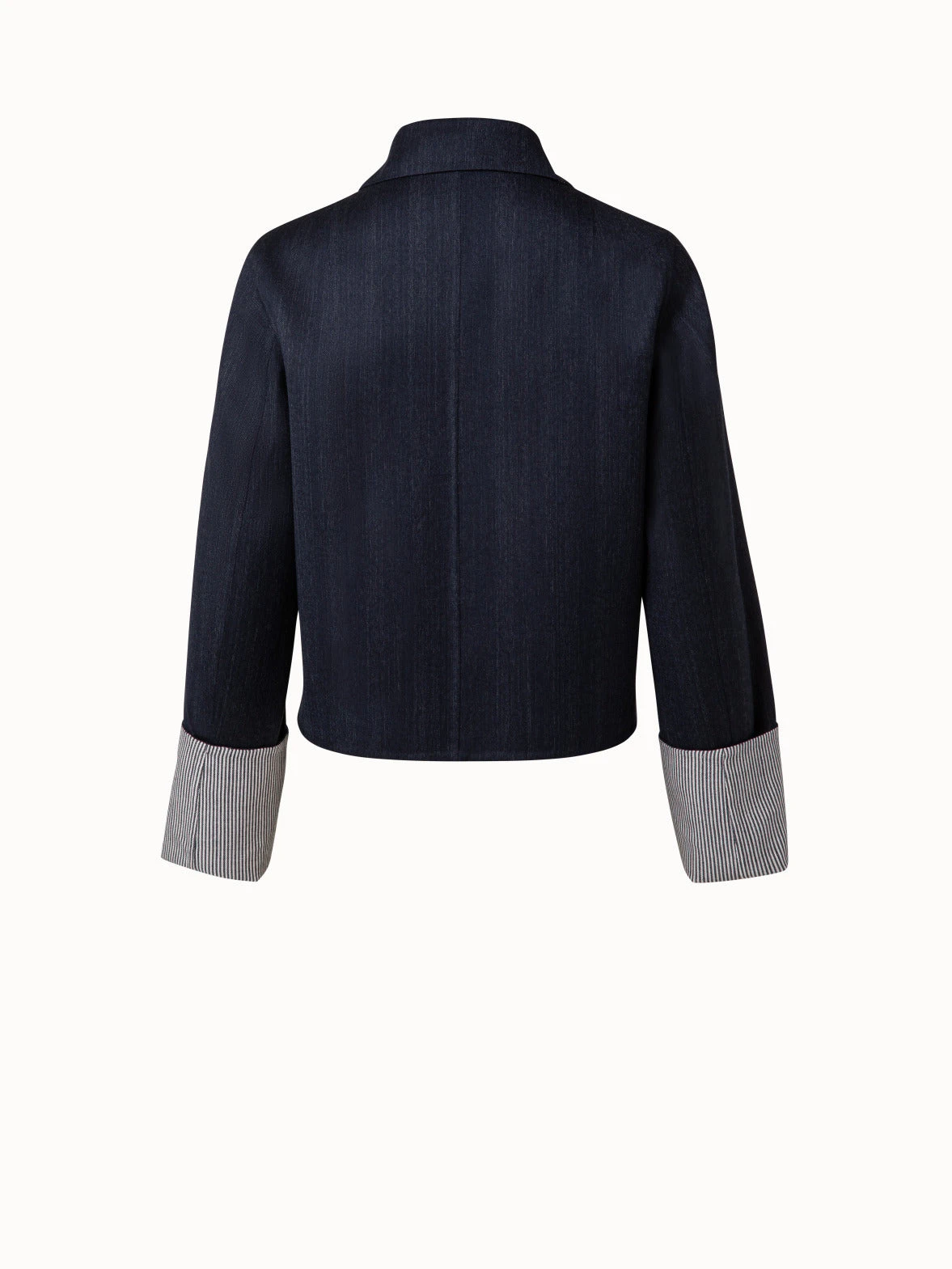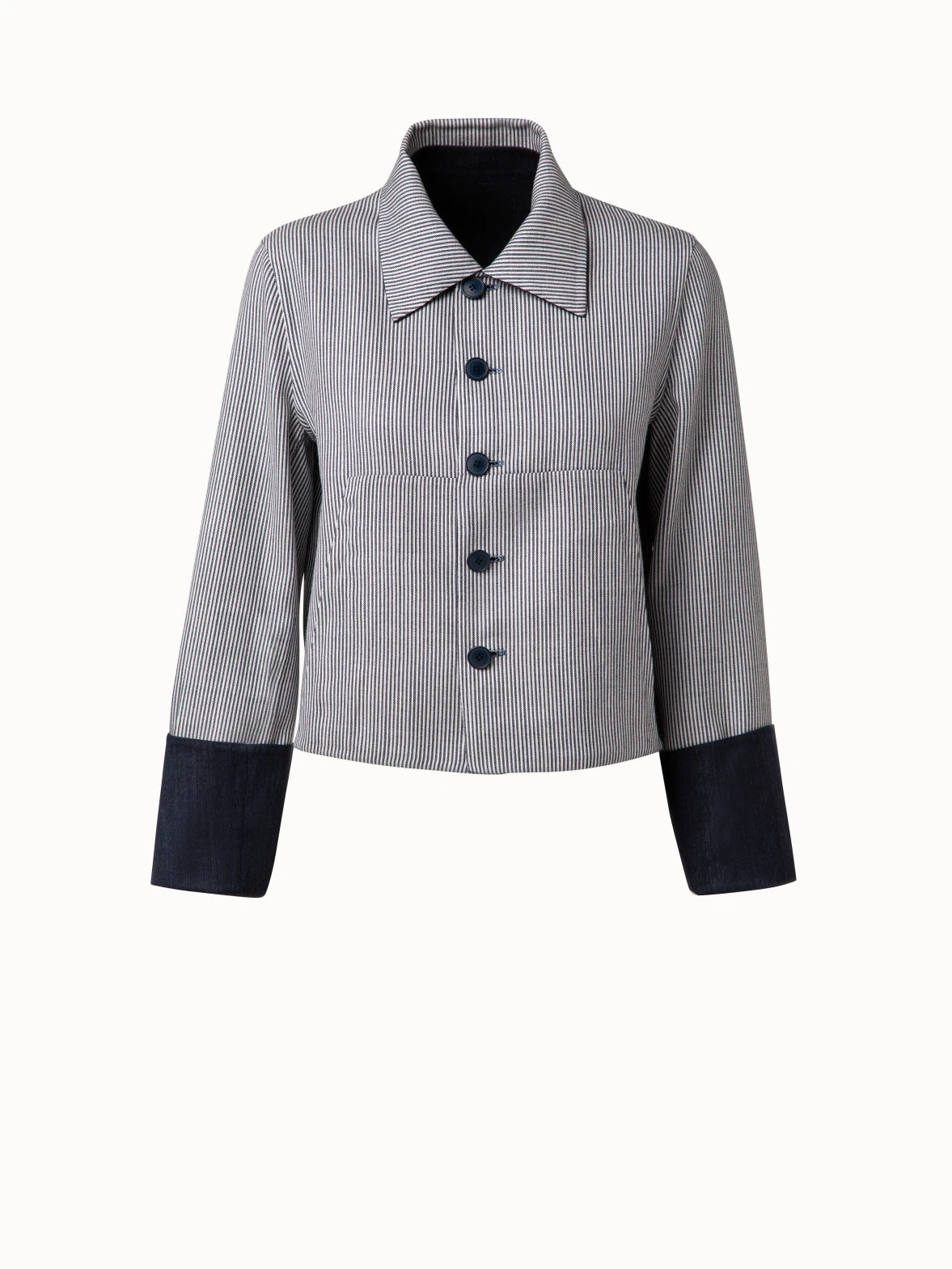 This Akris jacket Leland is created to be fully reversible. It is crafted in wool double-face with stripes on one side. The other side will show on the underside of the collar and on the sleeves that are cut to be worn with a cuff. Features a button closure and pockets.