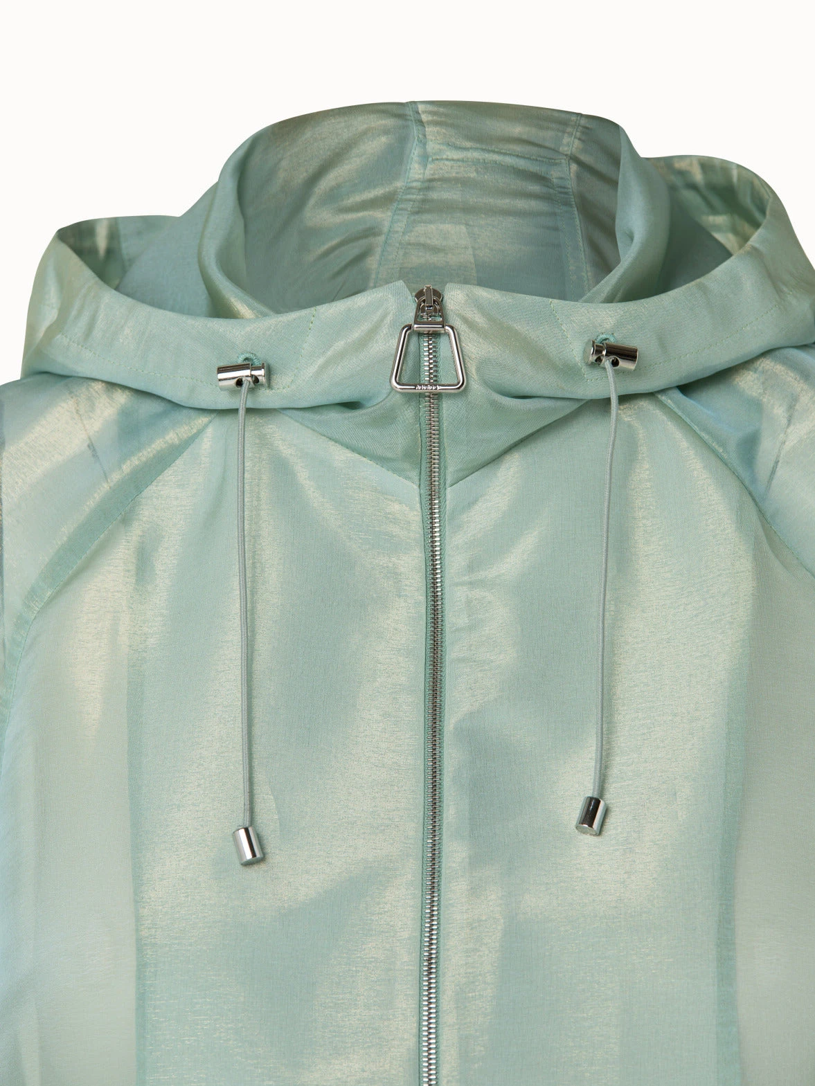 This Akris Grazielle blouson jacket is made from silk techno iridescent organza. It has a voluminous silhouette with raglan sleeves and patched pockets that are emphasized by a drawstring at the hem. It features a stand-up collar, a concealed hood, and front zip fastening. The ideal versatile option to dress up or down and a light layering piece for spring and summer.