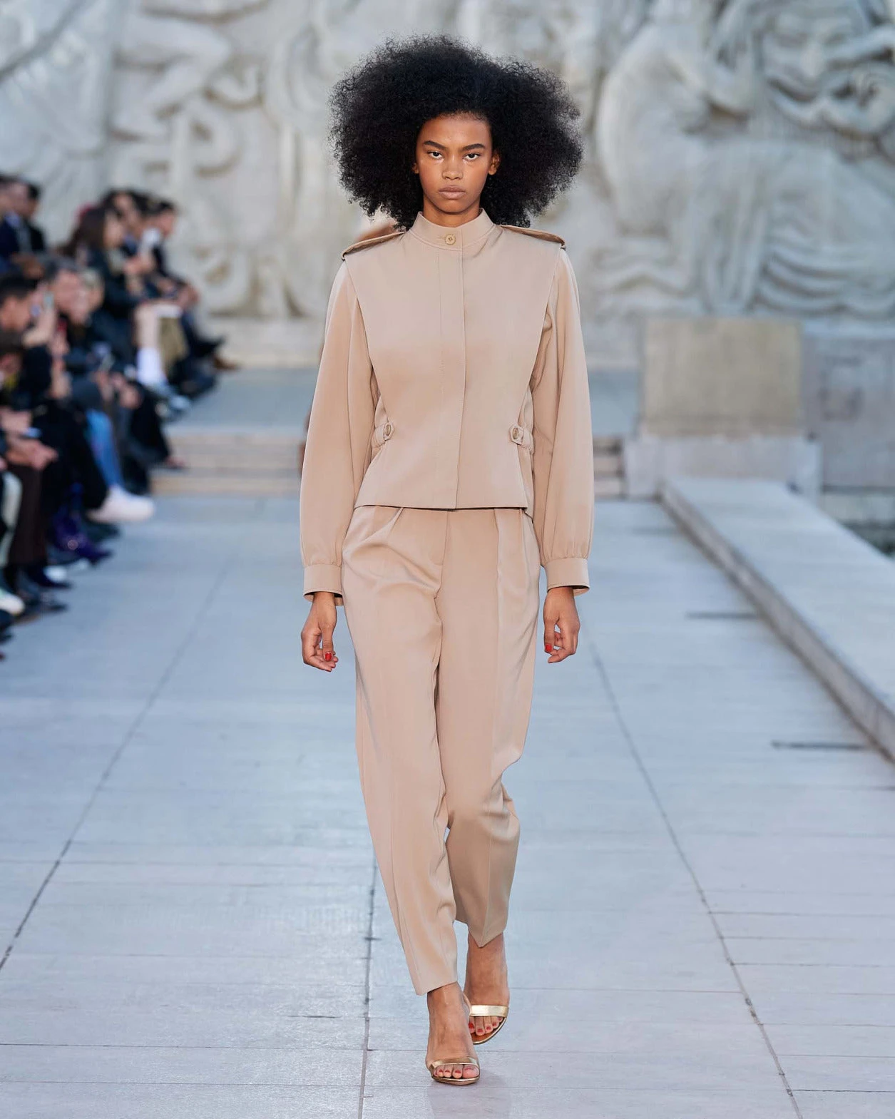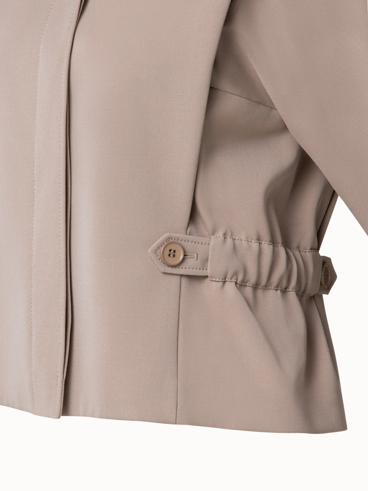 As part of the 100 year anniversary of the house, the Akris jacket Gregory is a revival of a vintage silhouette by creative director Albert Kriemler from the 1980s. This military-inspired style is crafted in wool gabardine, making it versatile for every occasion. The body is cut for a strong shoulder that is accentuated by tabs and a taken-in waist through a buttoned side tab that subtly gathers the fabric. A mock neck, covered button closure, and cuffed sleeves complete this sleek style.