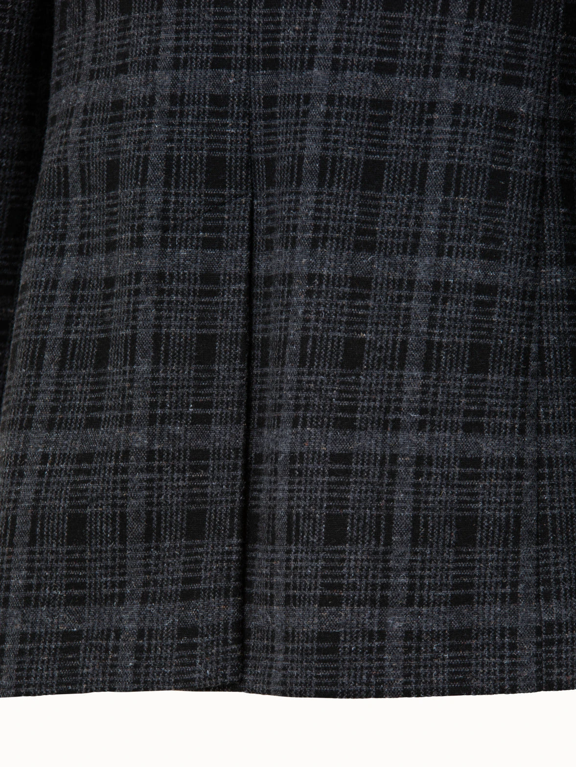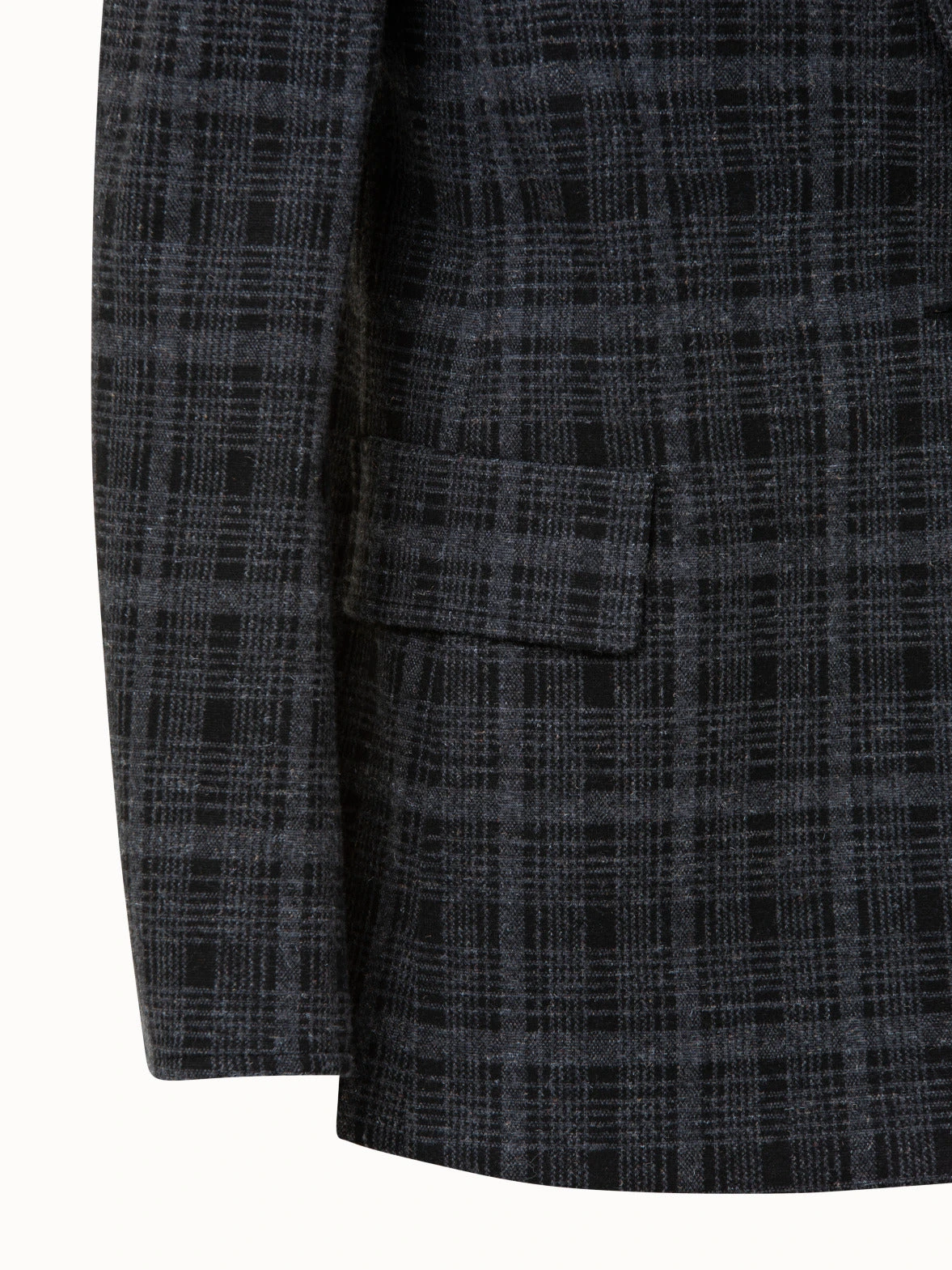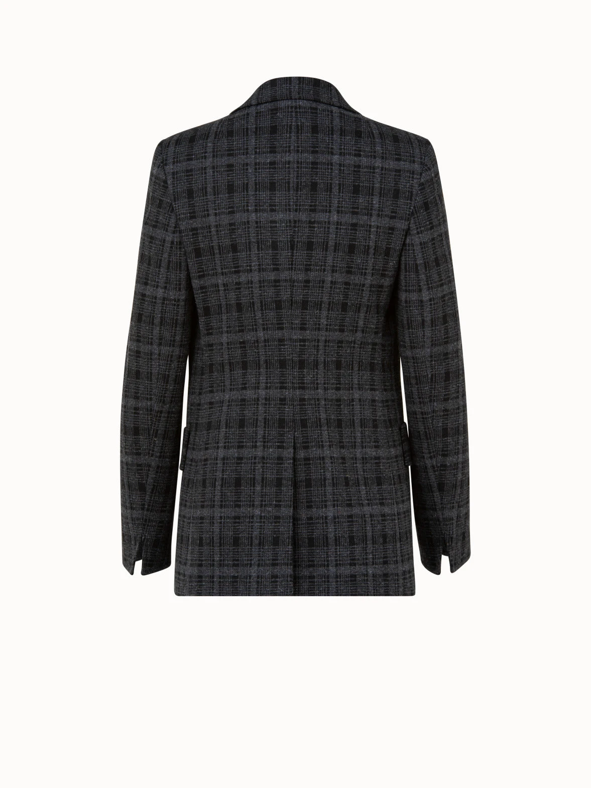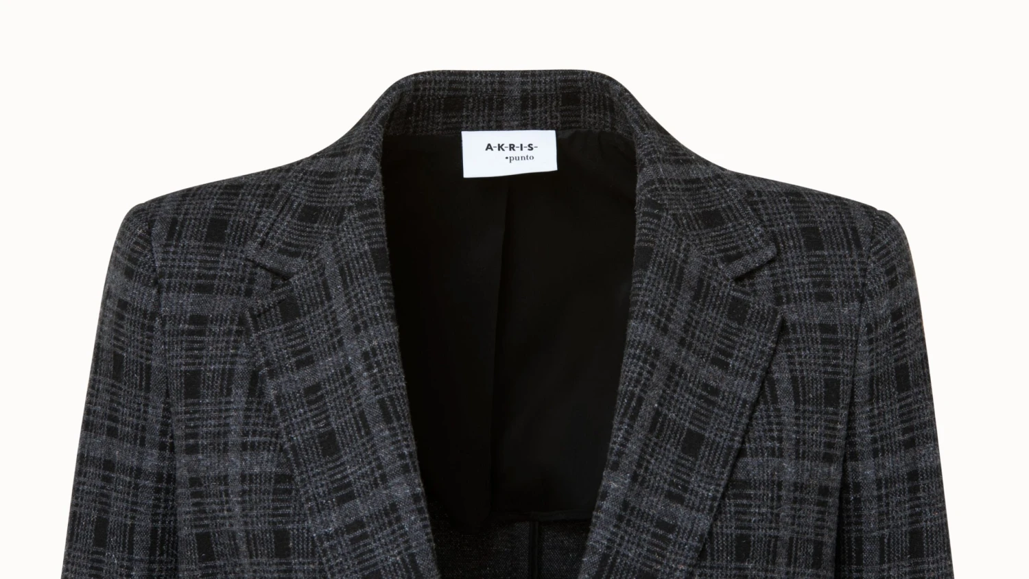 This style was borrowed from “his” wardrobe to create a cool Boyfriend blazer this season. The single-breasted style with elongated lapel and single-button closure has been crafted from a wool jersey in a timeless multi-hued grey tartan check. Match yours to slim-leg pants or a pair of jeans.