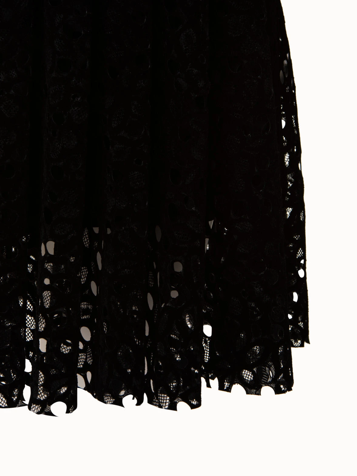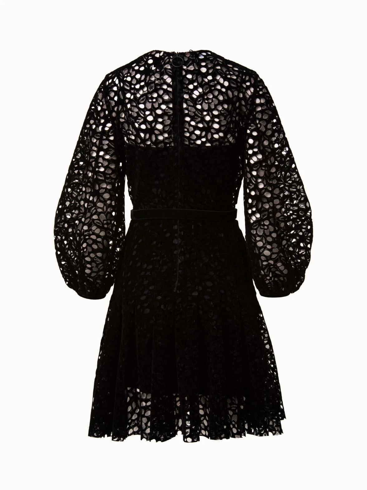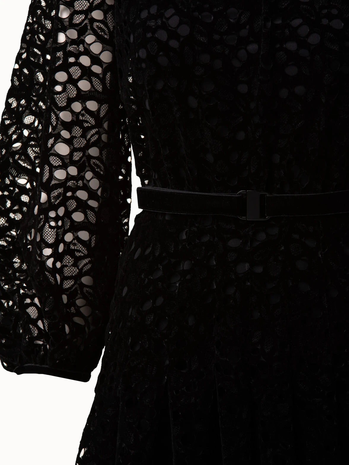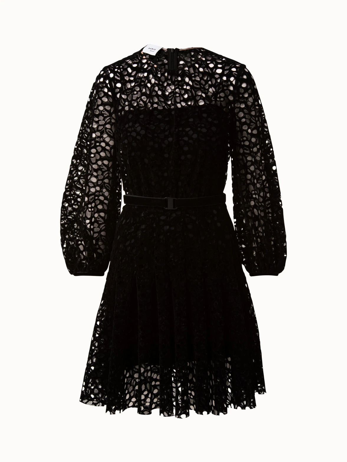This Akris punto dress will make you stand out at the next occasion. It is crafted in semi-transparent velvet lace with a pattern inspired by butterfly wings. The youthful silhouette is created with a knee-length flared seamed pleat skirt, fitted waist, and airy bishop sleeves. Closes with a back zip. Includes a belt and slip dress.