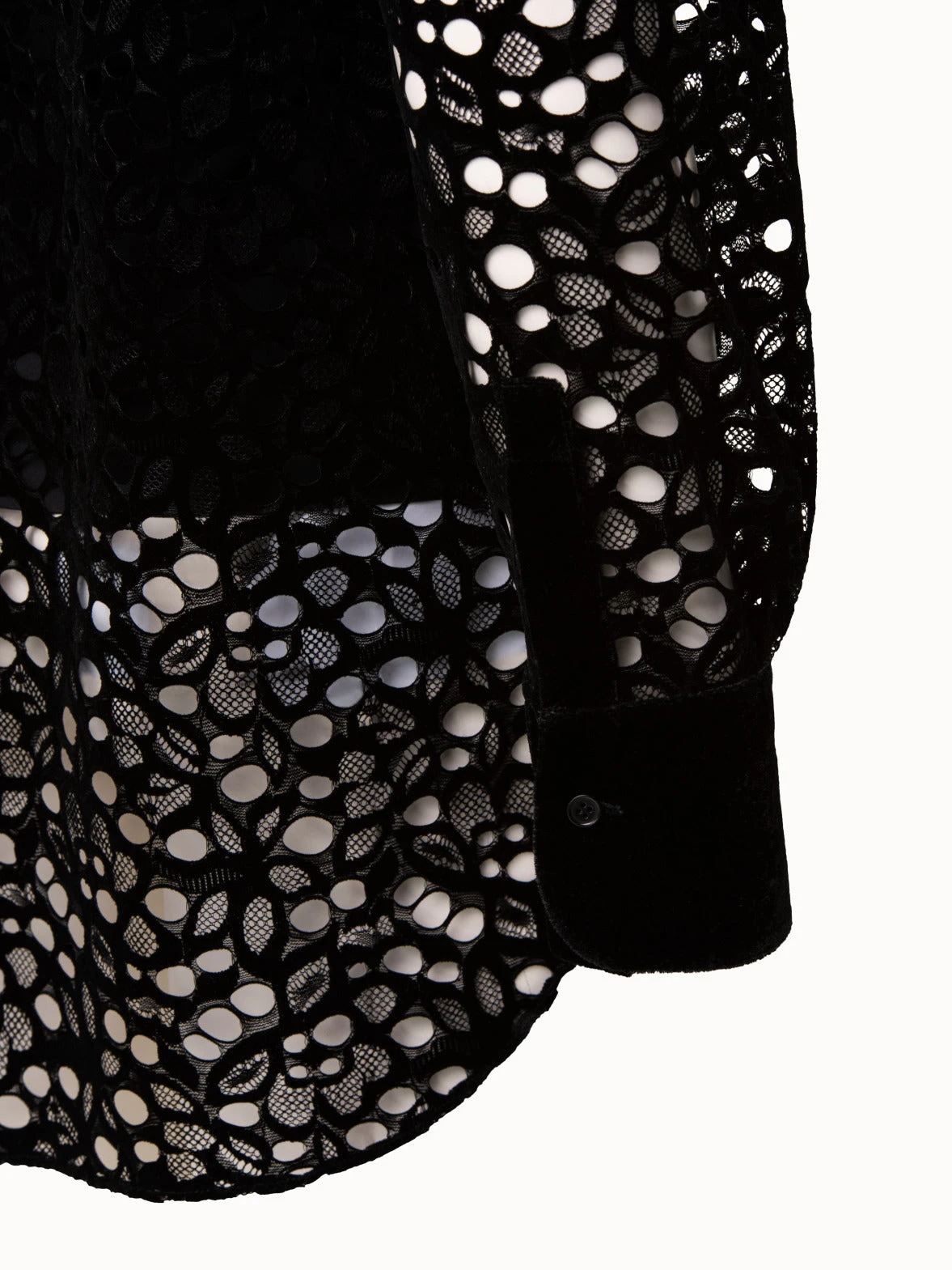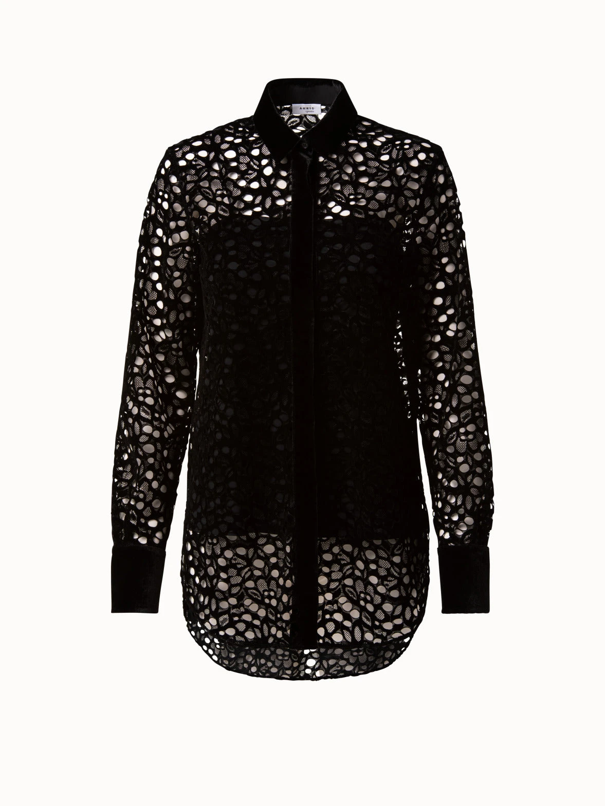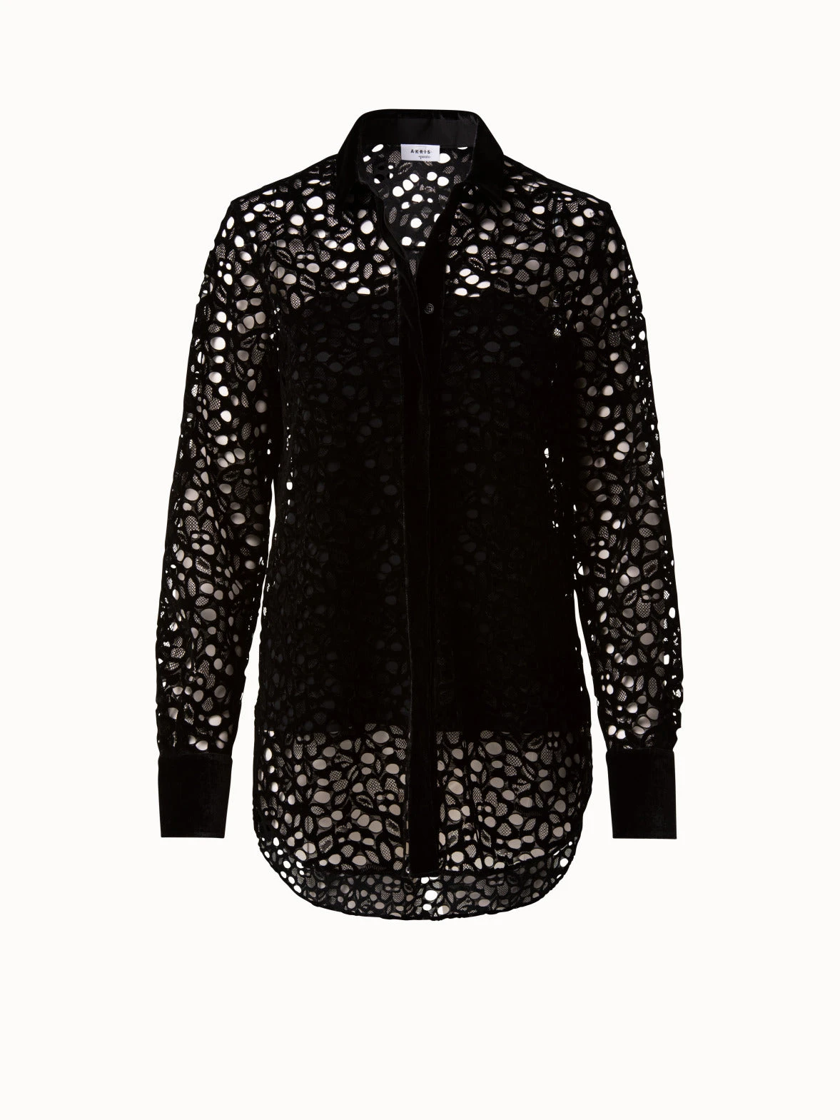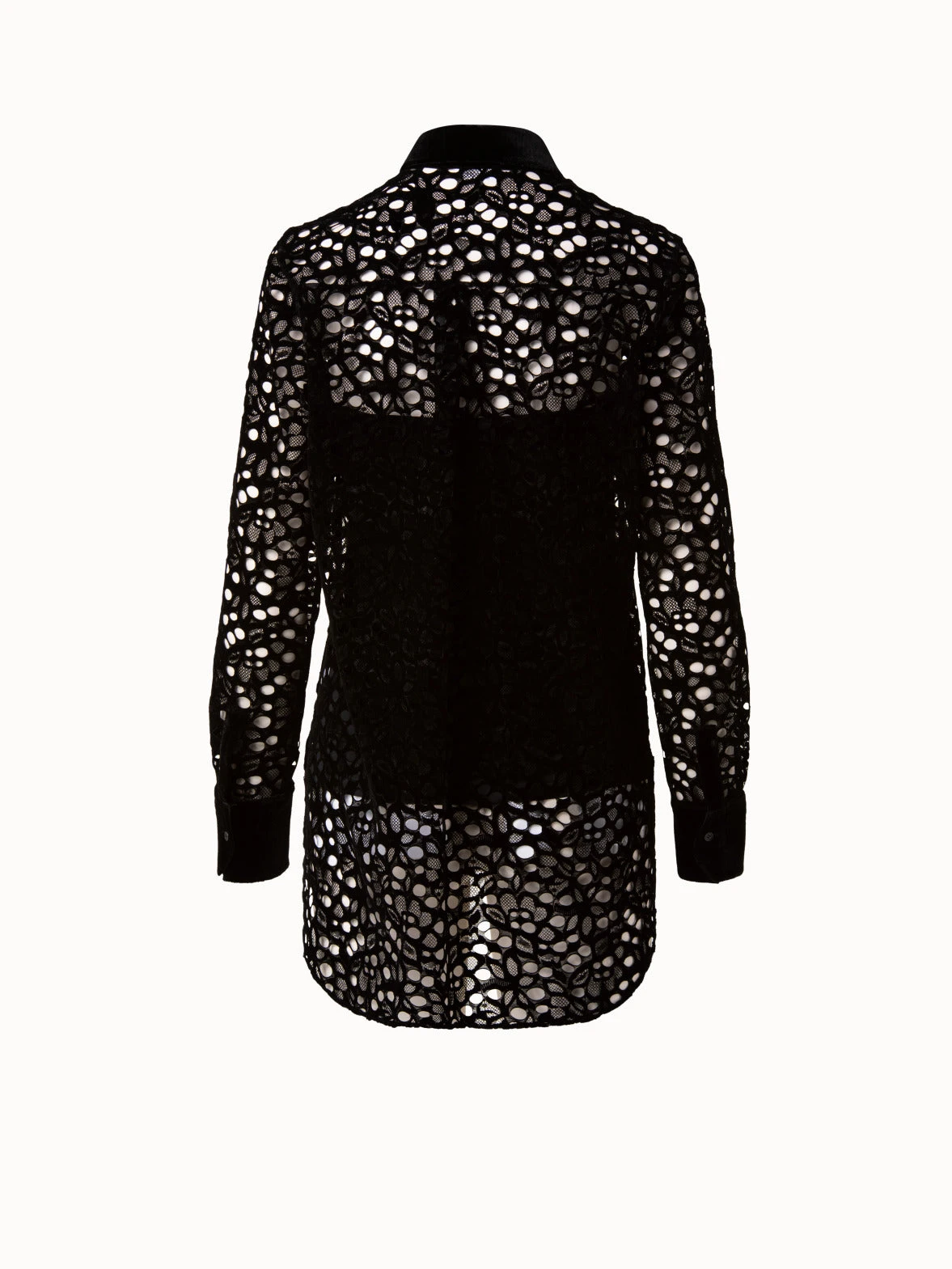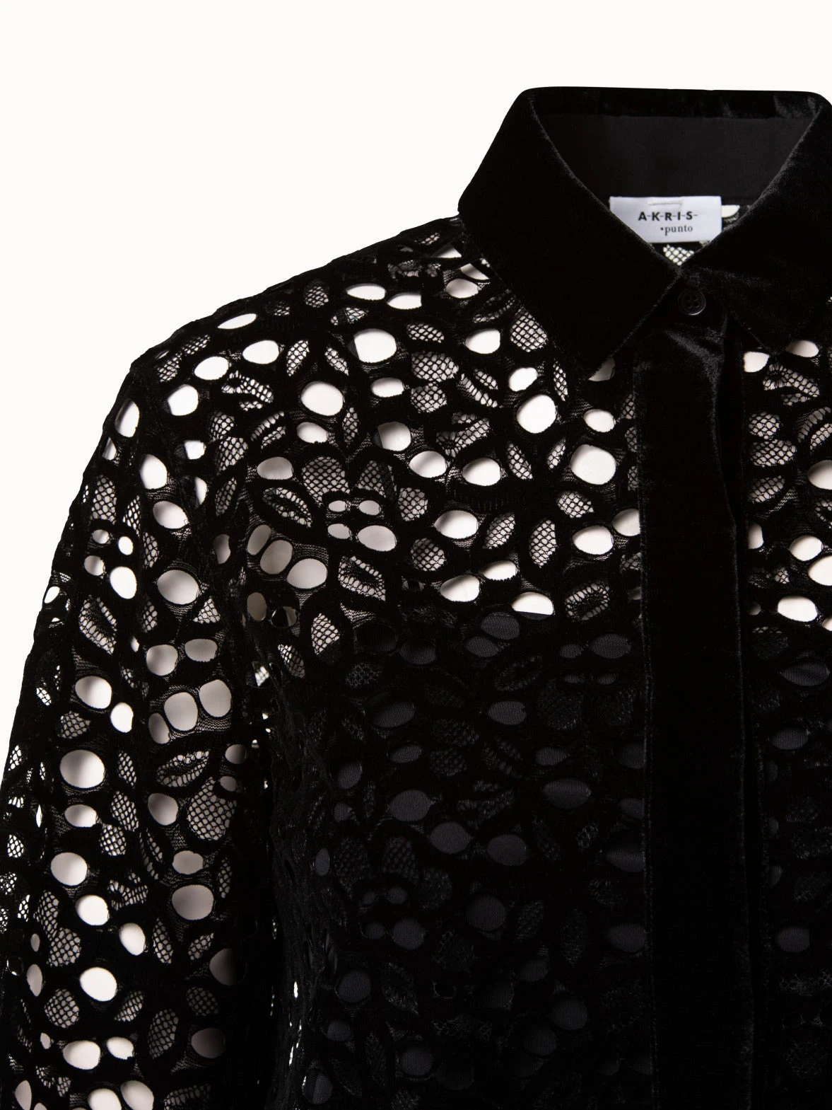 This Akris punto tunic blouse is crafted in a unique velvet lace that features a pattern inspired by butterfly wings. It features a velvet kent collar and concealed front button closure. The elongated back hem completes the elegant look. Includes a slip top.