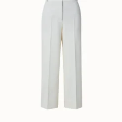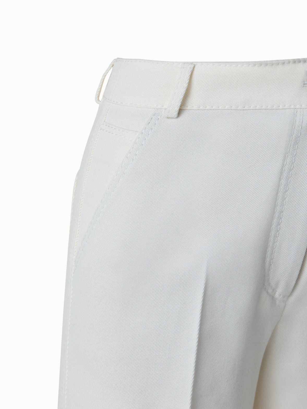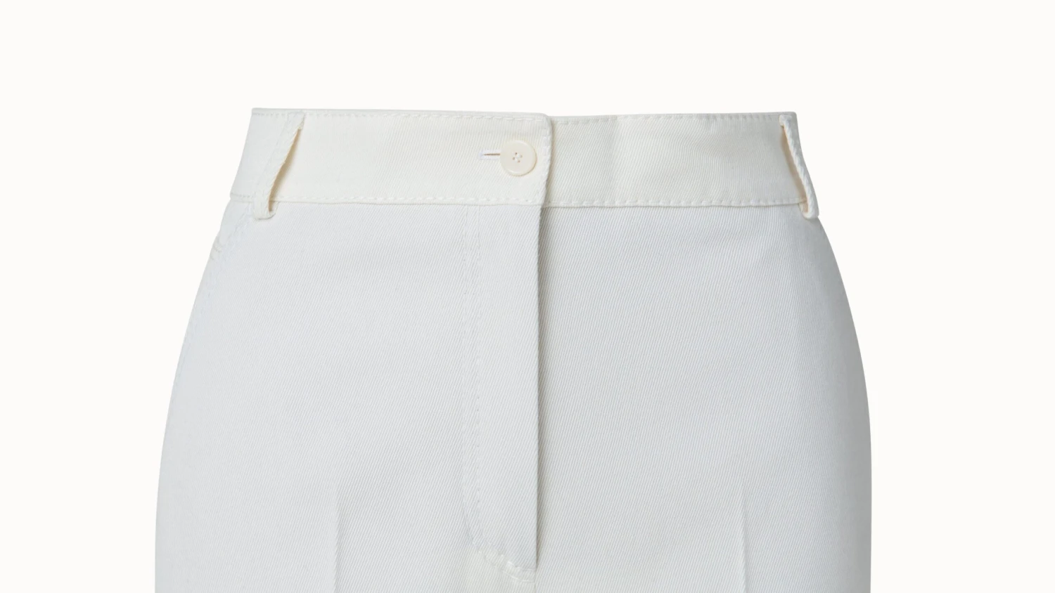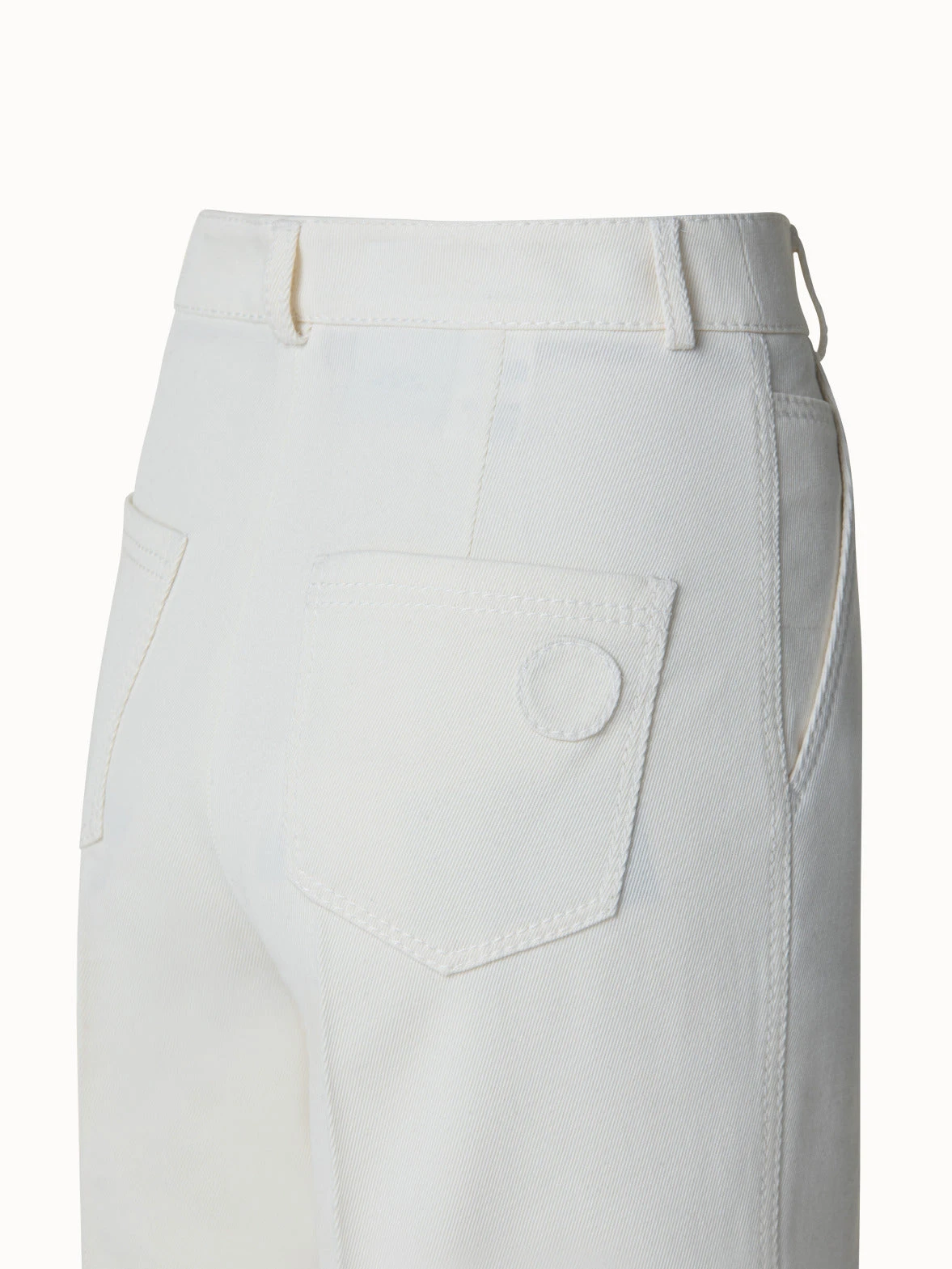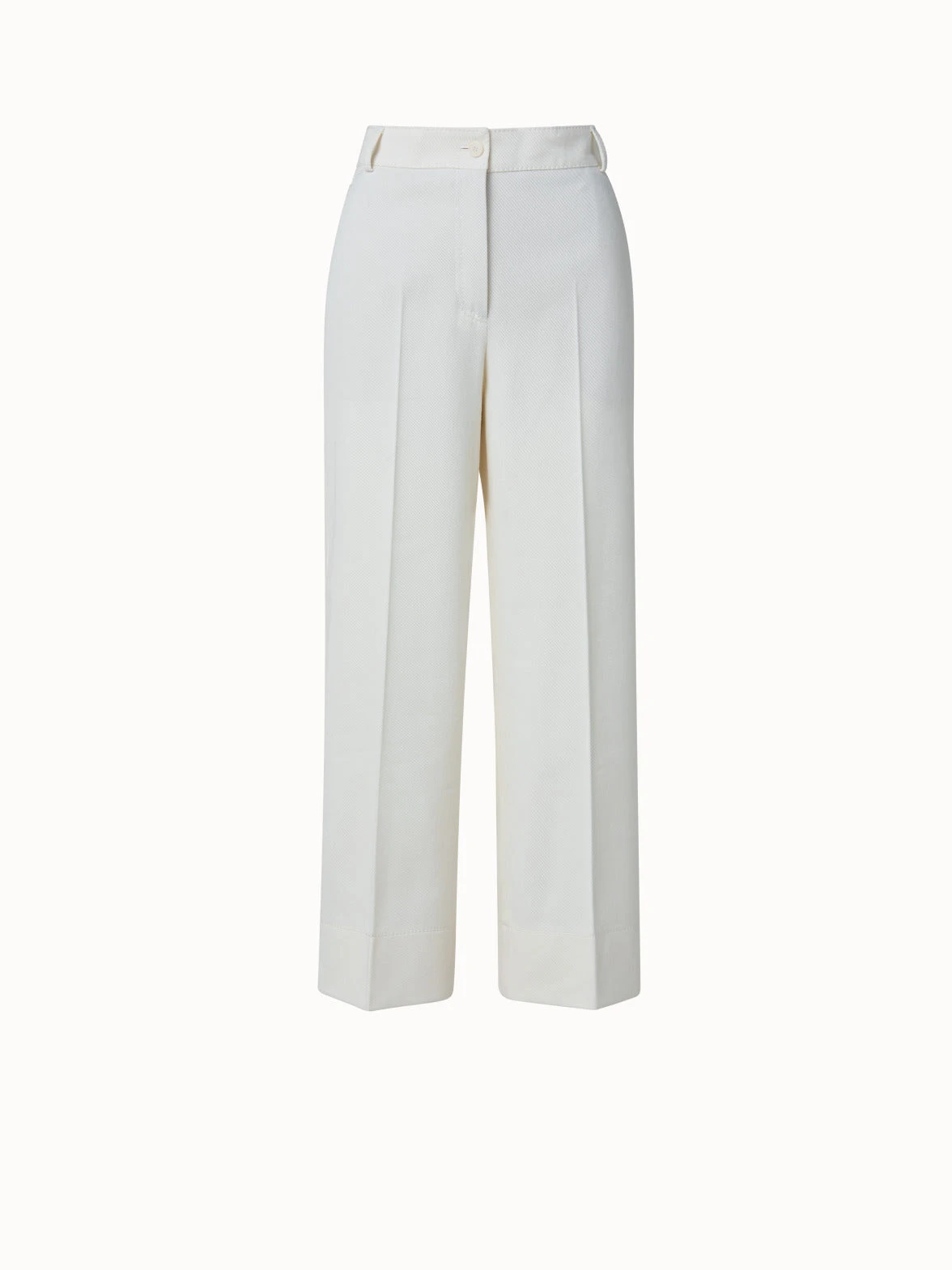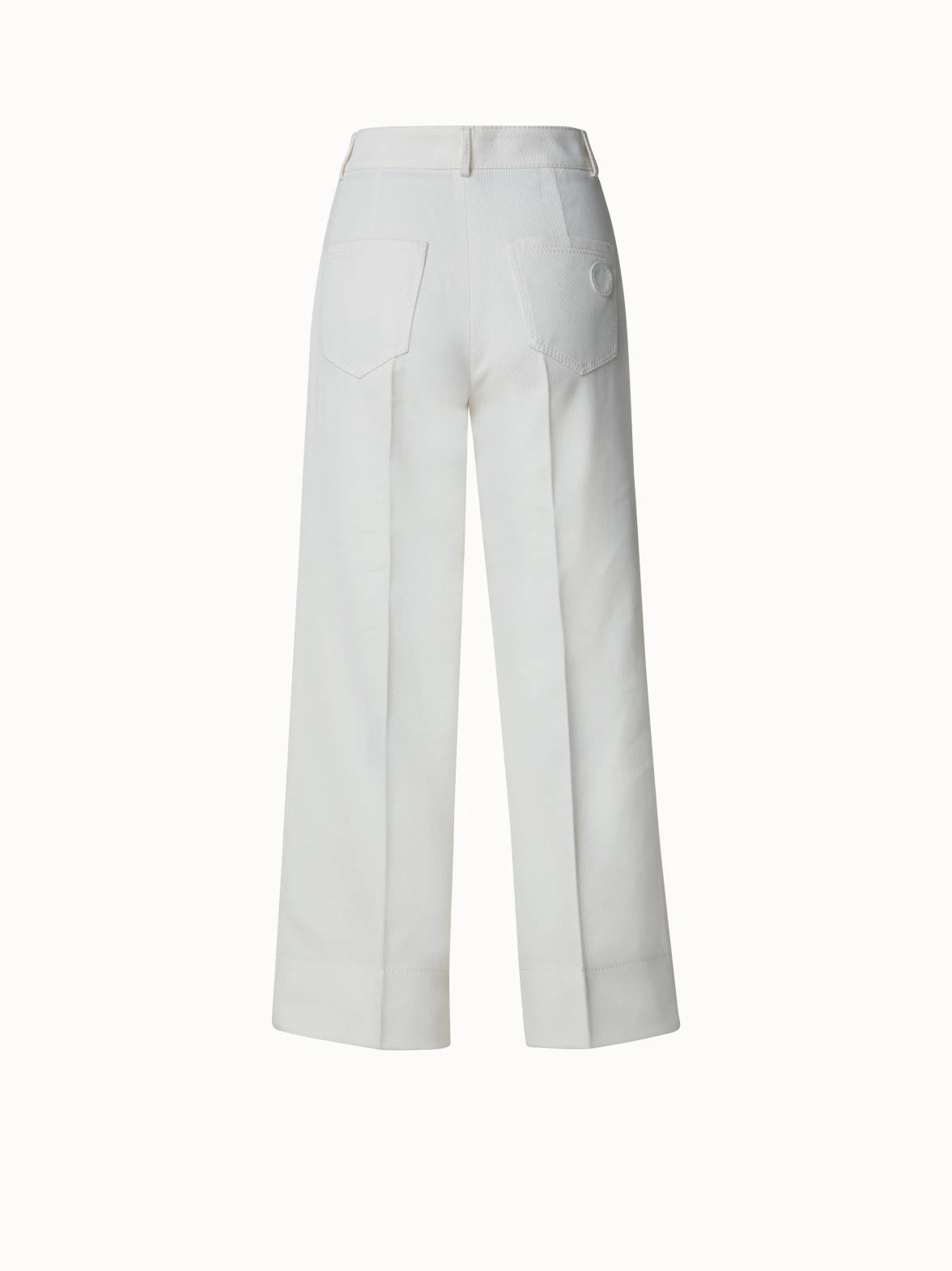 Chiara pants in cotton denim stretch are cut to sit high on the waist. They have straight, cropped legs with stitched front and back crease, and classical 5 denim pockets with Punto signature dot patch at the back pocket. Style yours with a white shirt.
