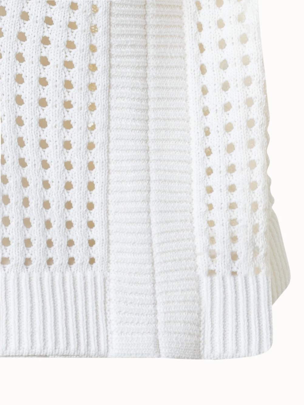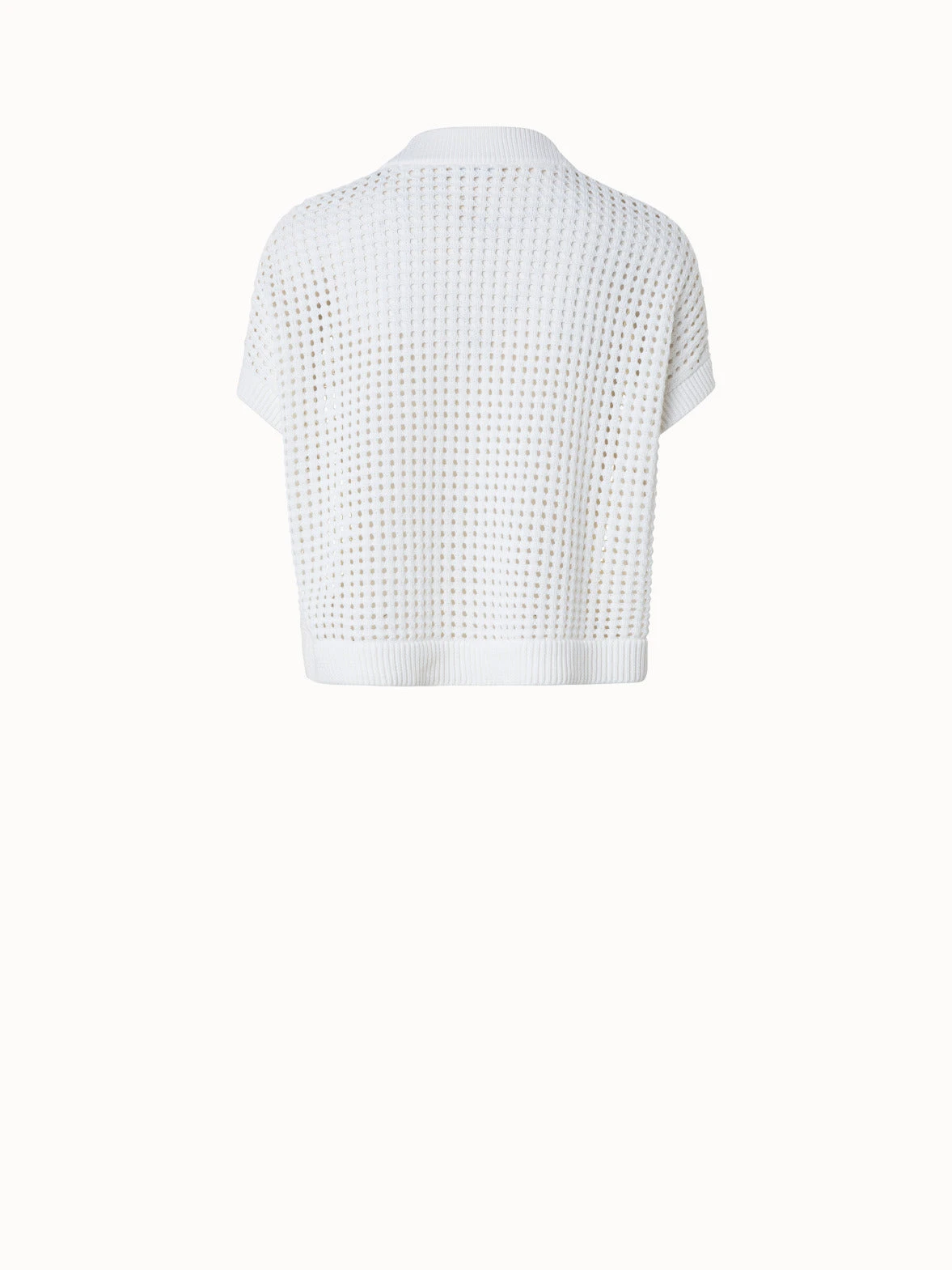 This Akris punto knit pullover is crafted in a chunky cotton dot mesh that creates a comfortable style with sensual transparency. It features a low V-neck and dropped shoulders with cap sleeves. Cut for a boxy fit.