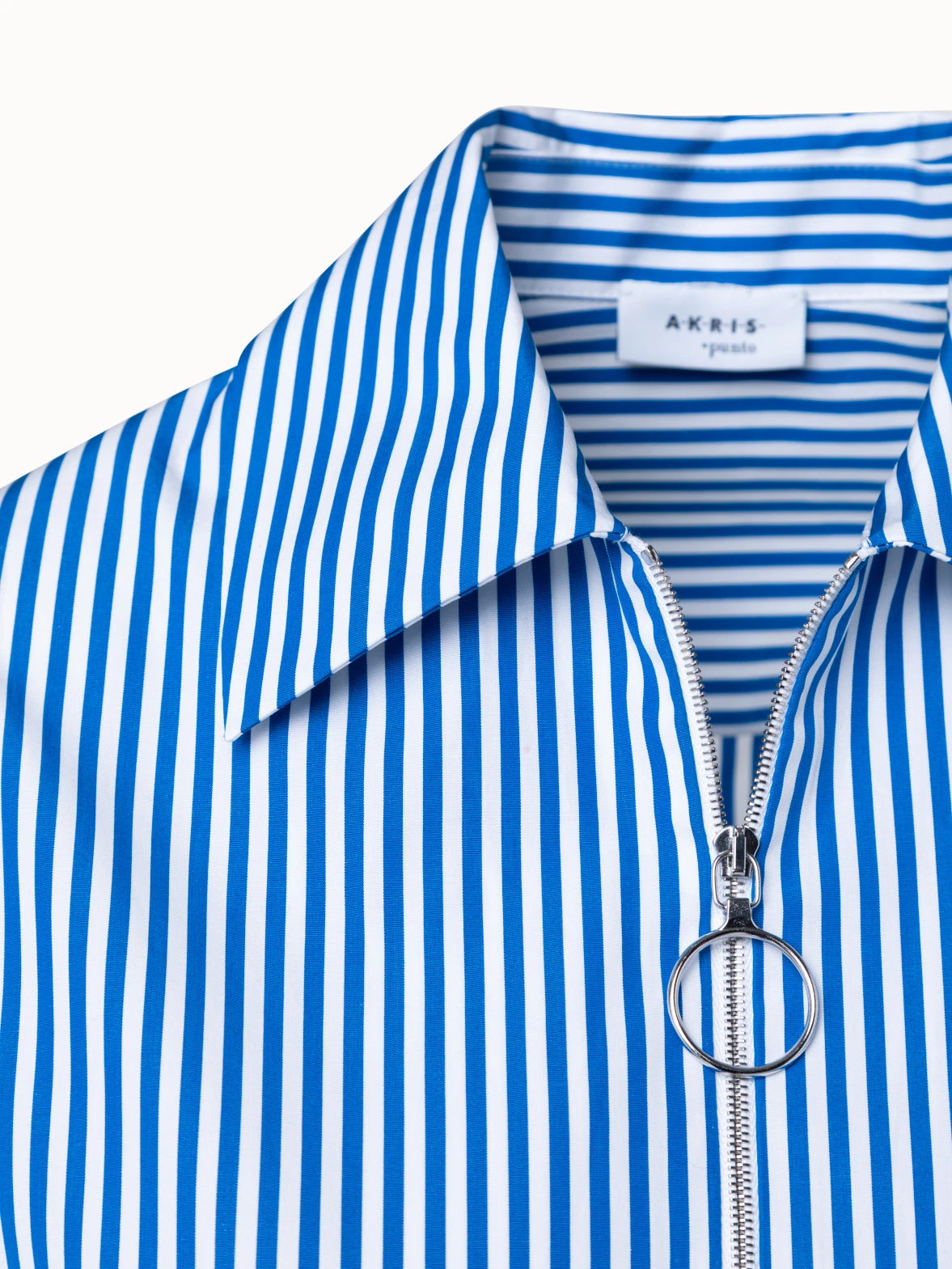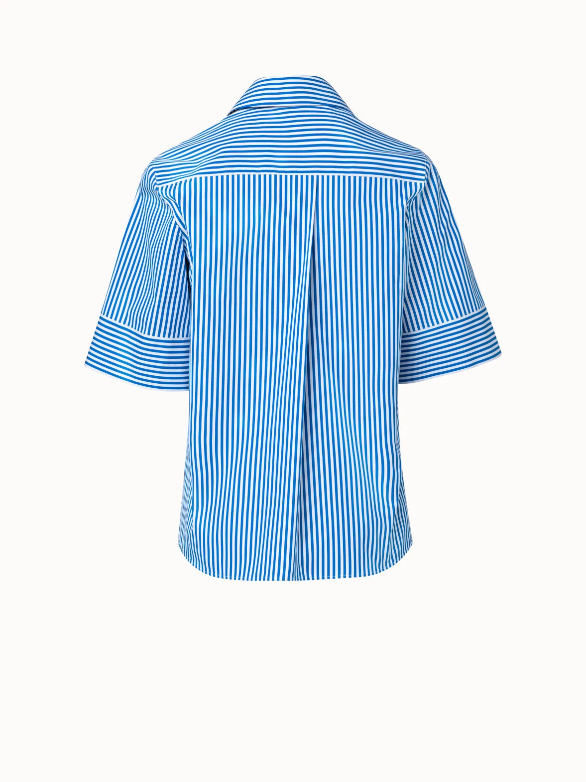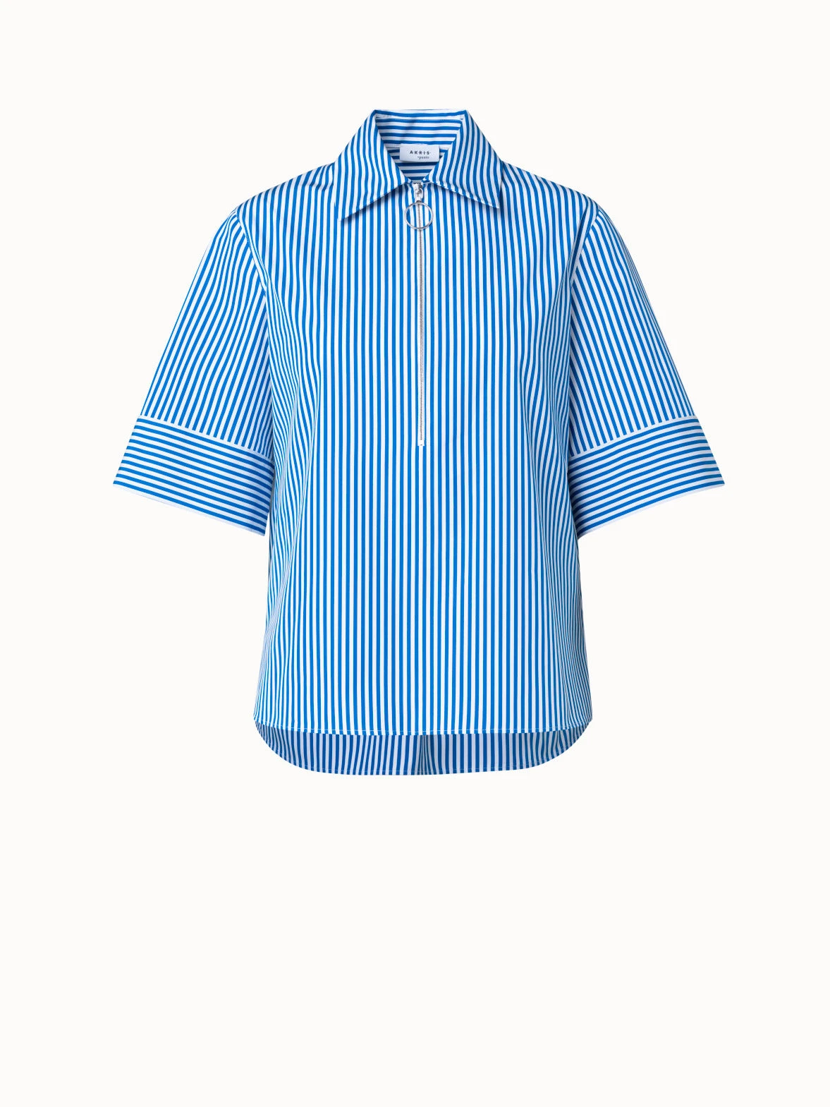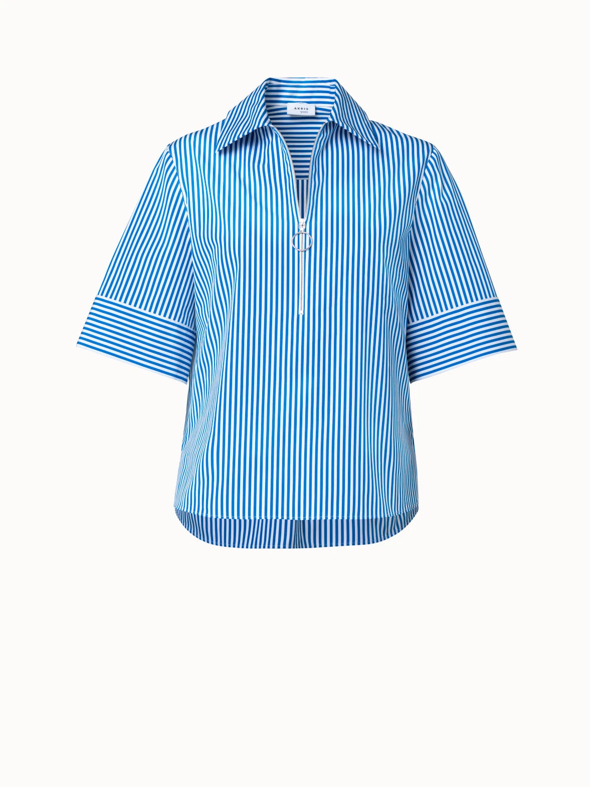 This Akris punto blouse is crafted in striped cotton poplin. It is cut in an A-line silhouette that is accentuated by the back pleat. Half sleeves create airy volume. Features a spread collar and half zip.