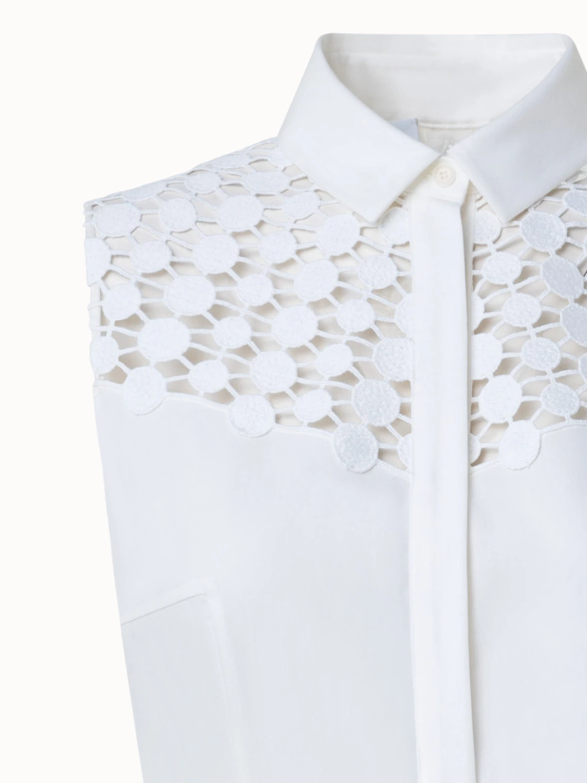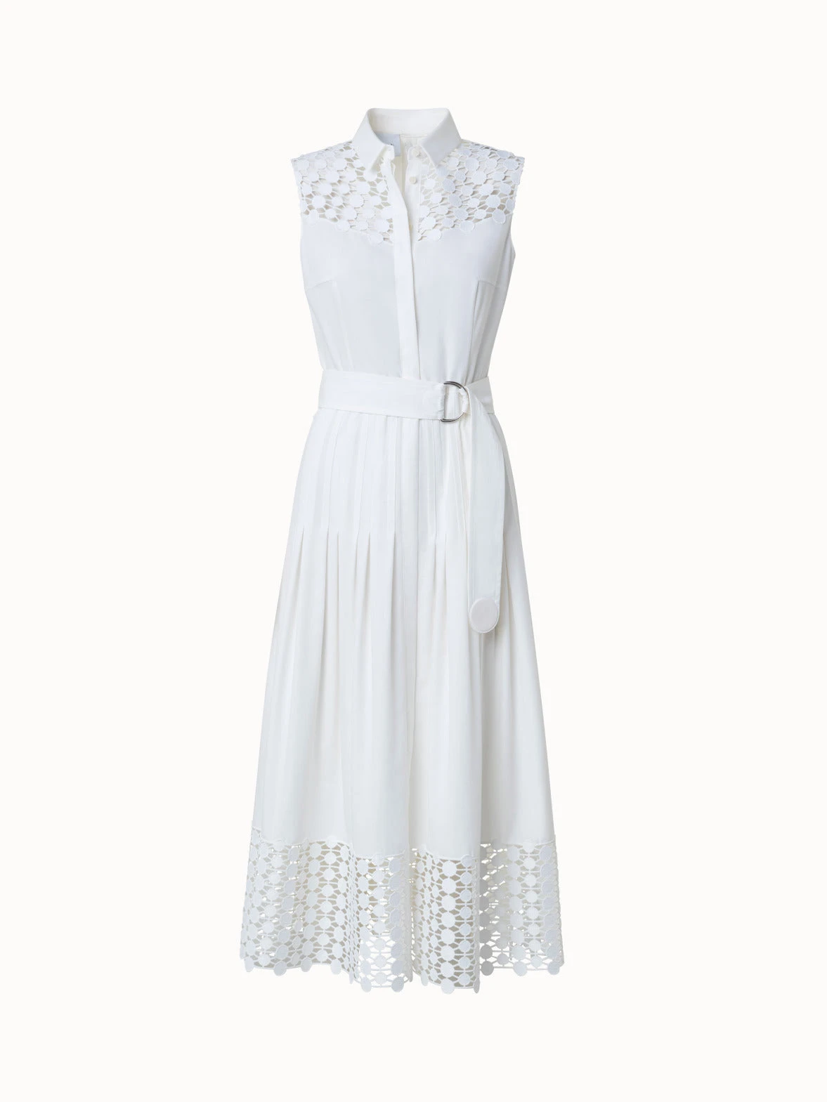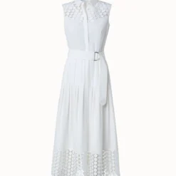 This Akris punto midi dress is crafted in cotton poplin with kaleidoscope dot guipure embroidery at the bottom hem and chest that creates an elegantly airy look and feel. This sleeveless A-line silhouette features a kent collar and a concealed button closure. The included belt accentuates the waist.