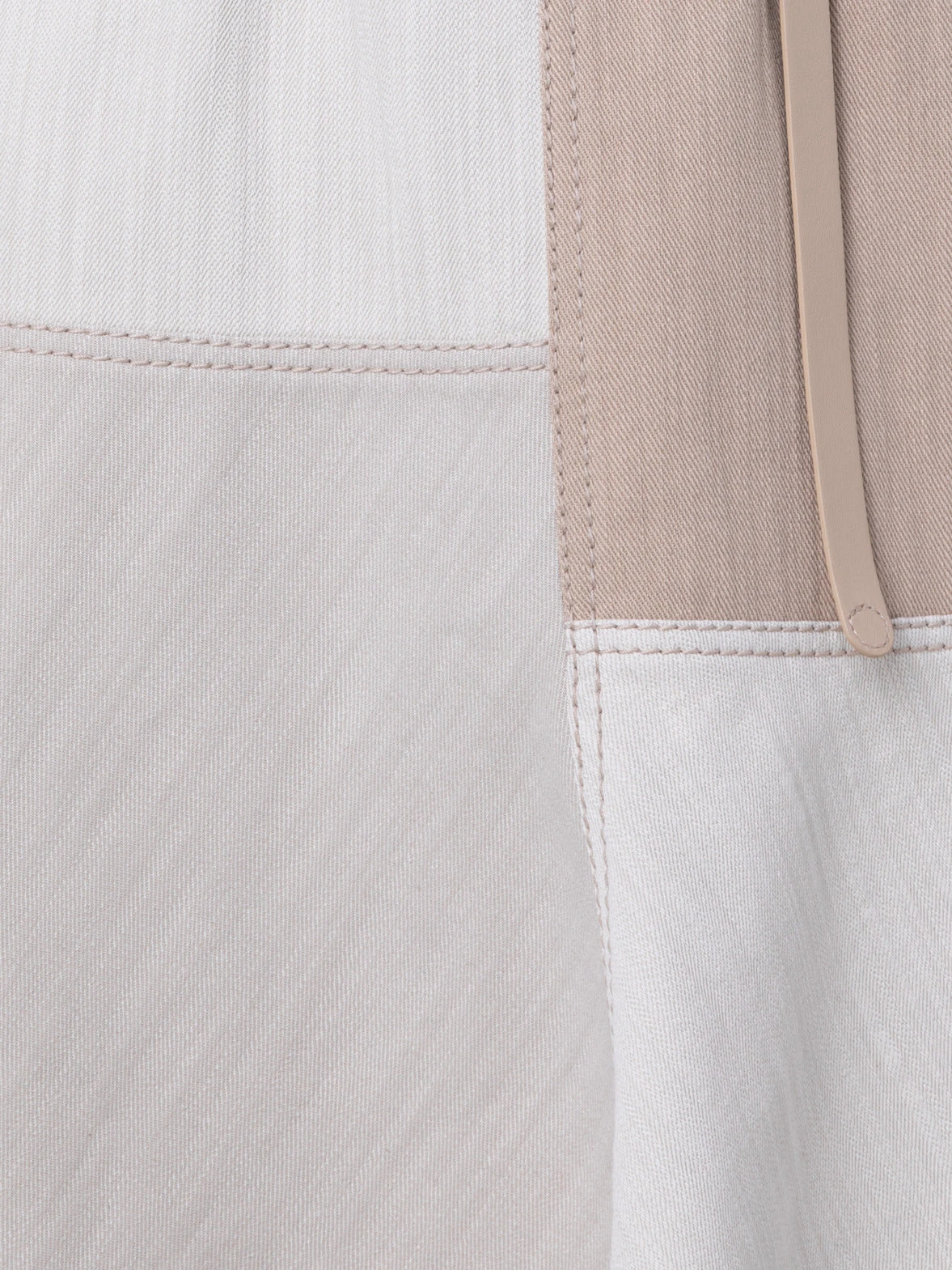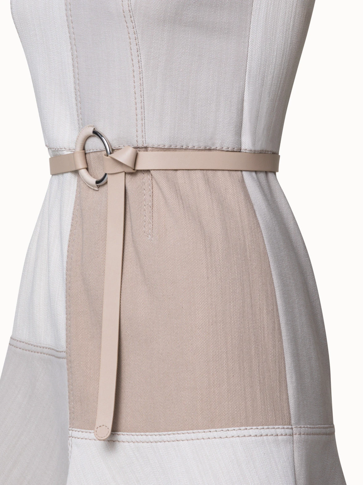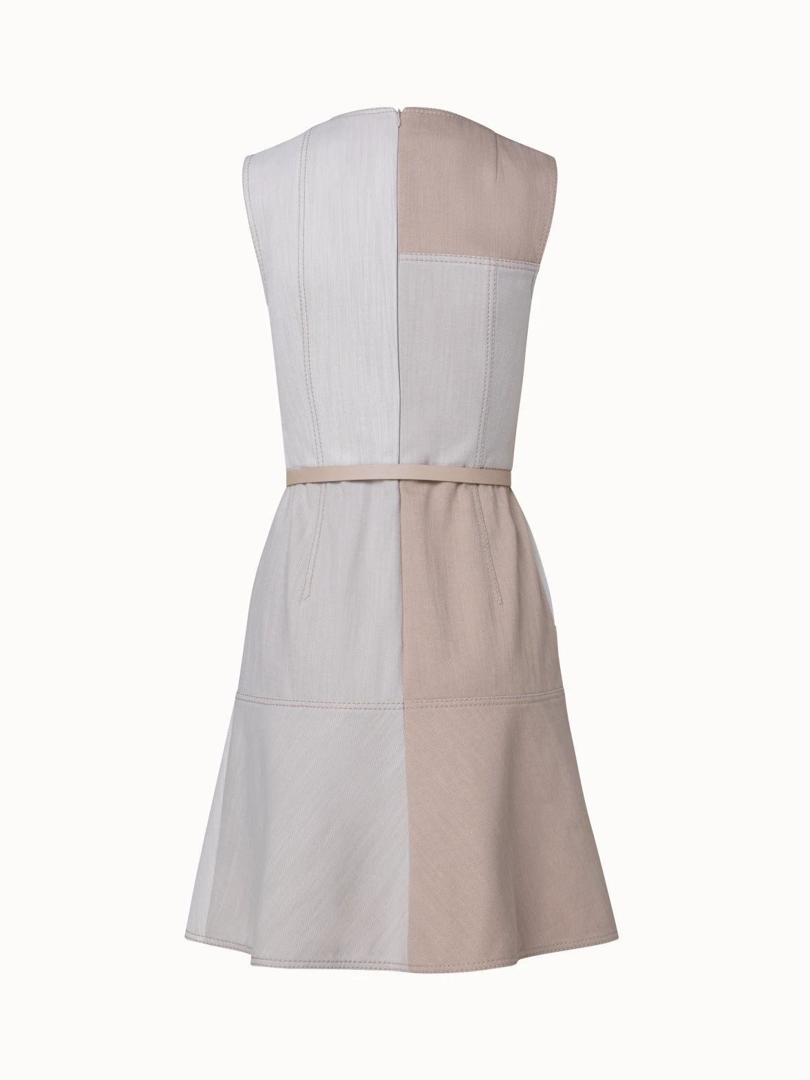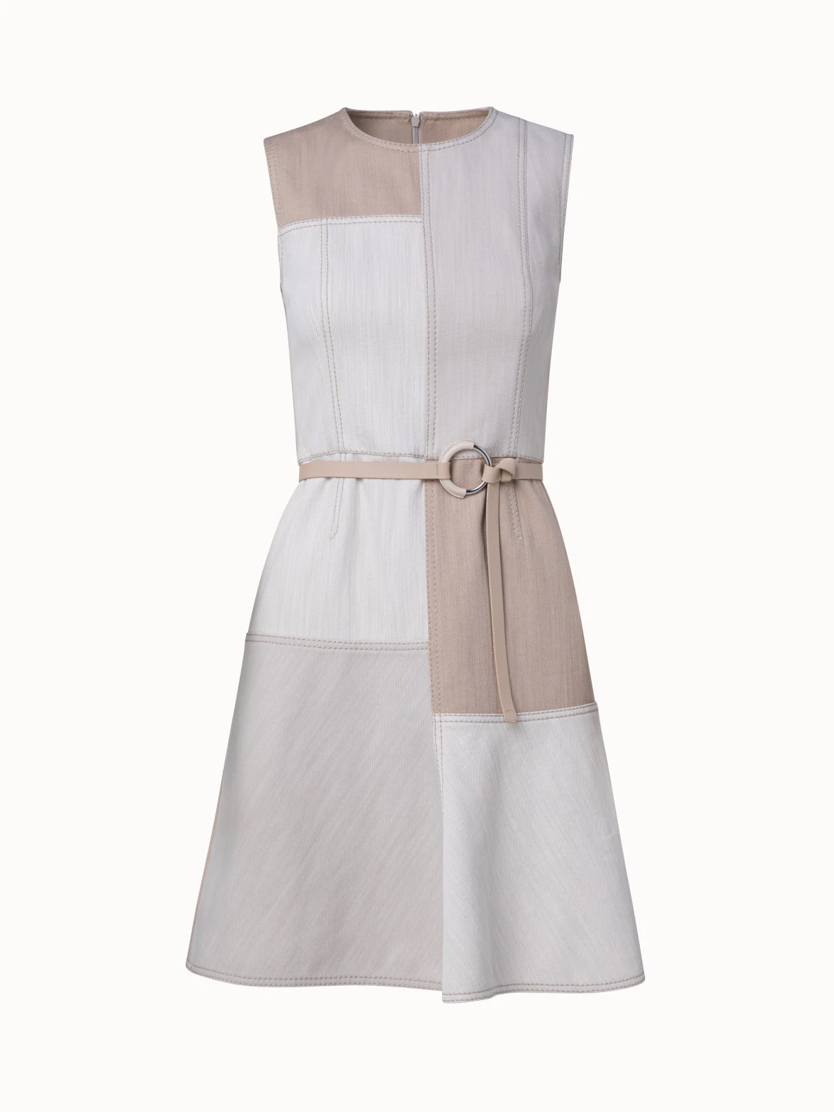 This Akris punto dress is crafted in a soft, washed denim patchwork that creates a casual and comfortable style. The included belt accentuates the waist above the semi-circle, knee-length skirt. Closes with a back zip.
