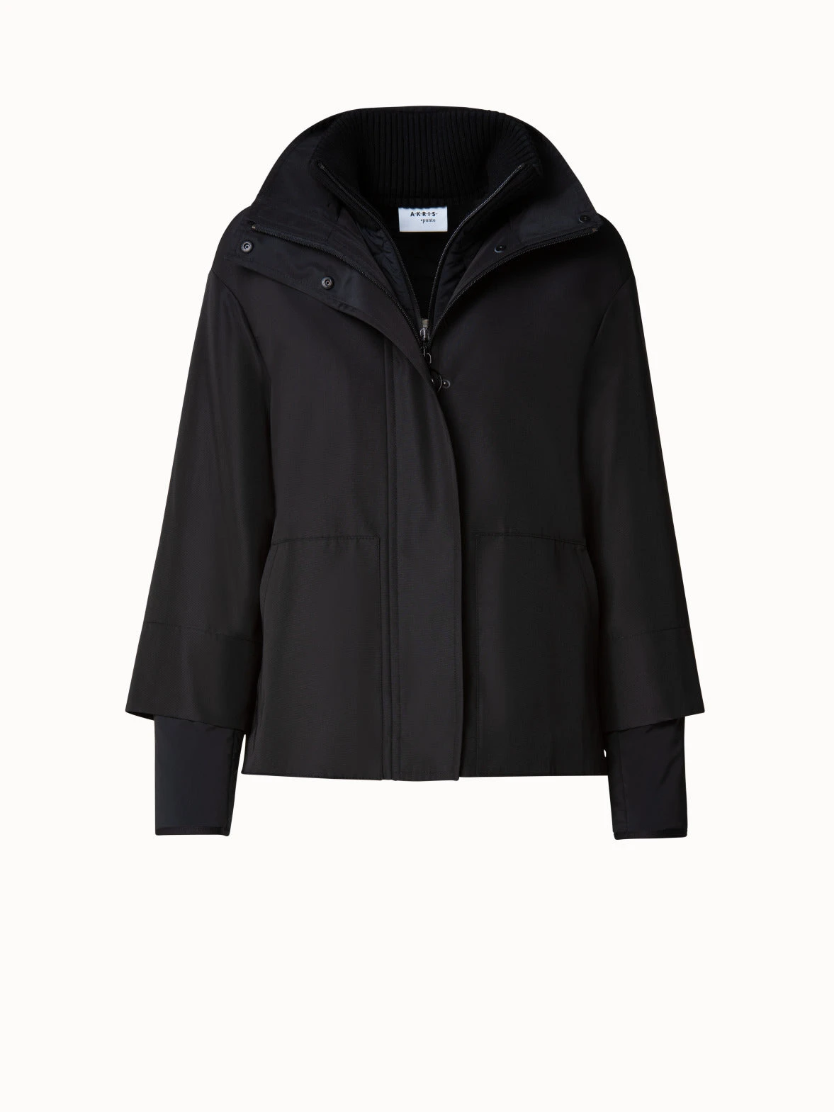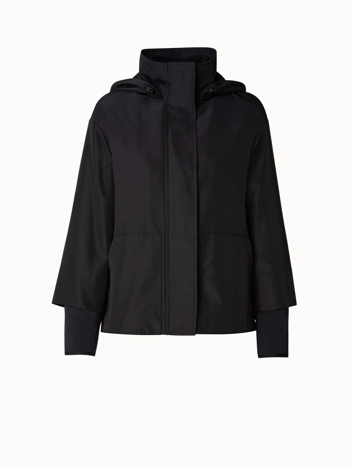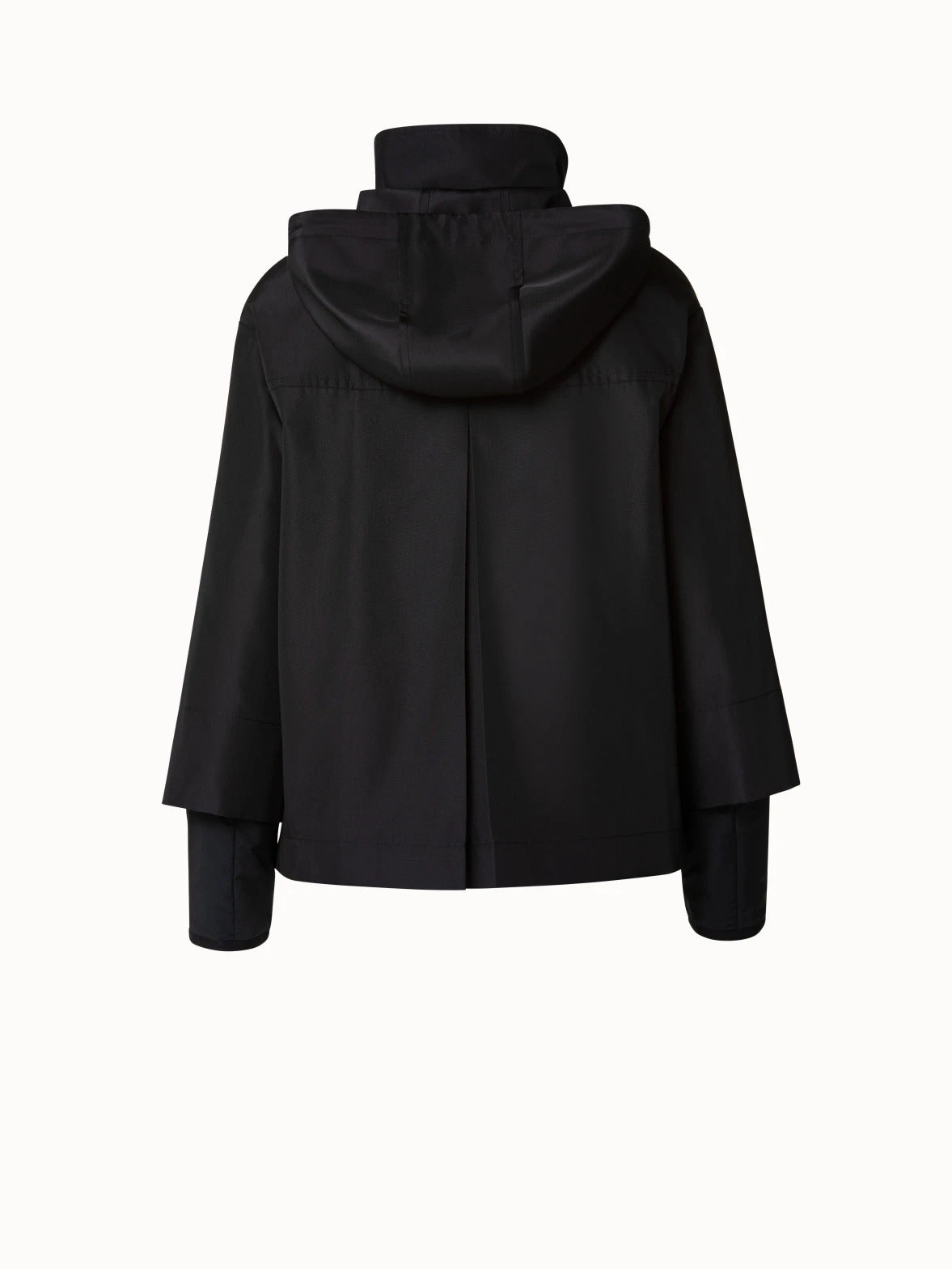 Water repellent a-line nylon jacket with detachable hood. Stand up collar, front zip & button closure, patch pockets, dropped shoulder, back box pleat, and 3/4 sleeve.