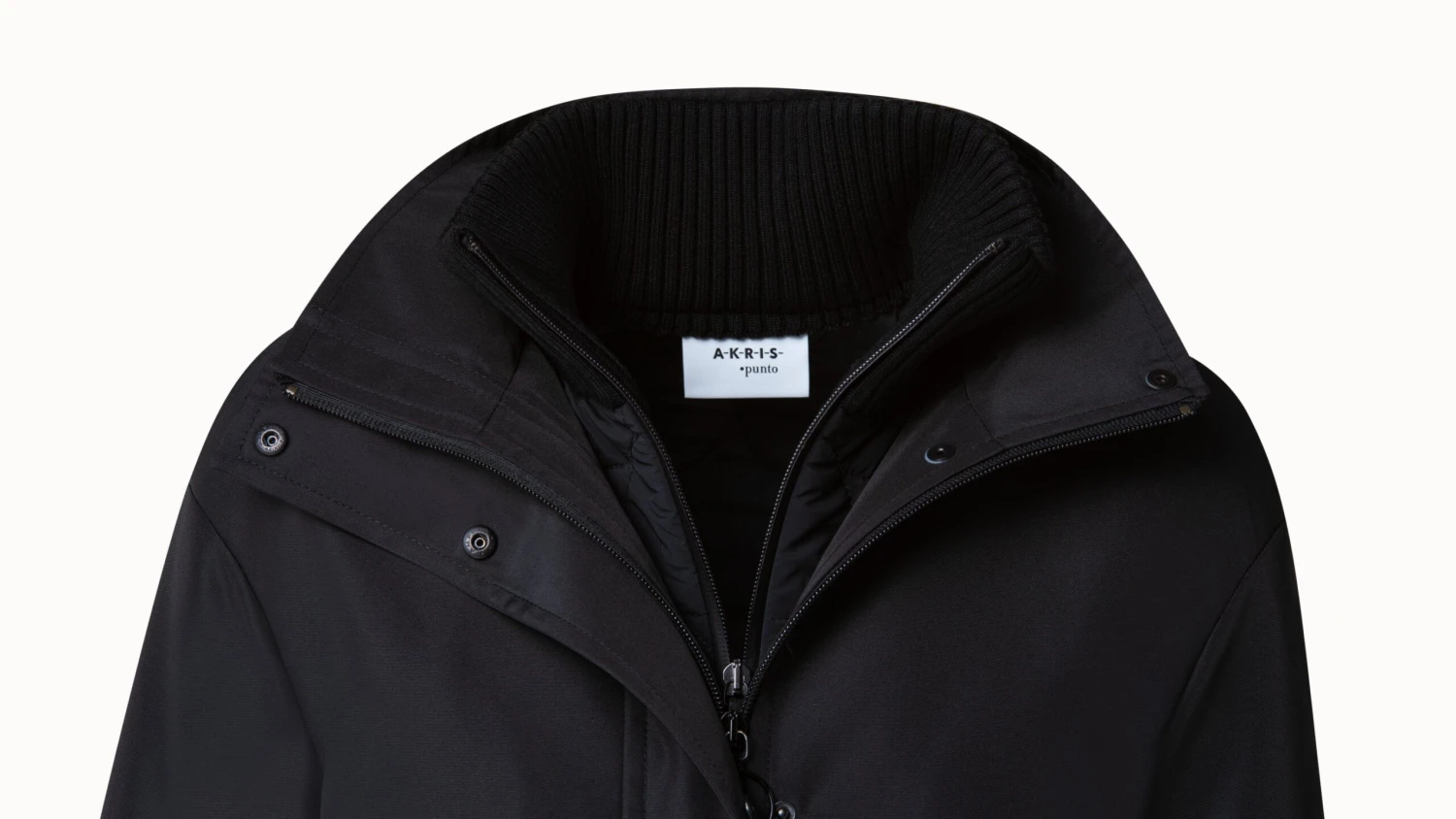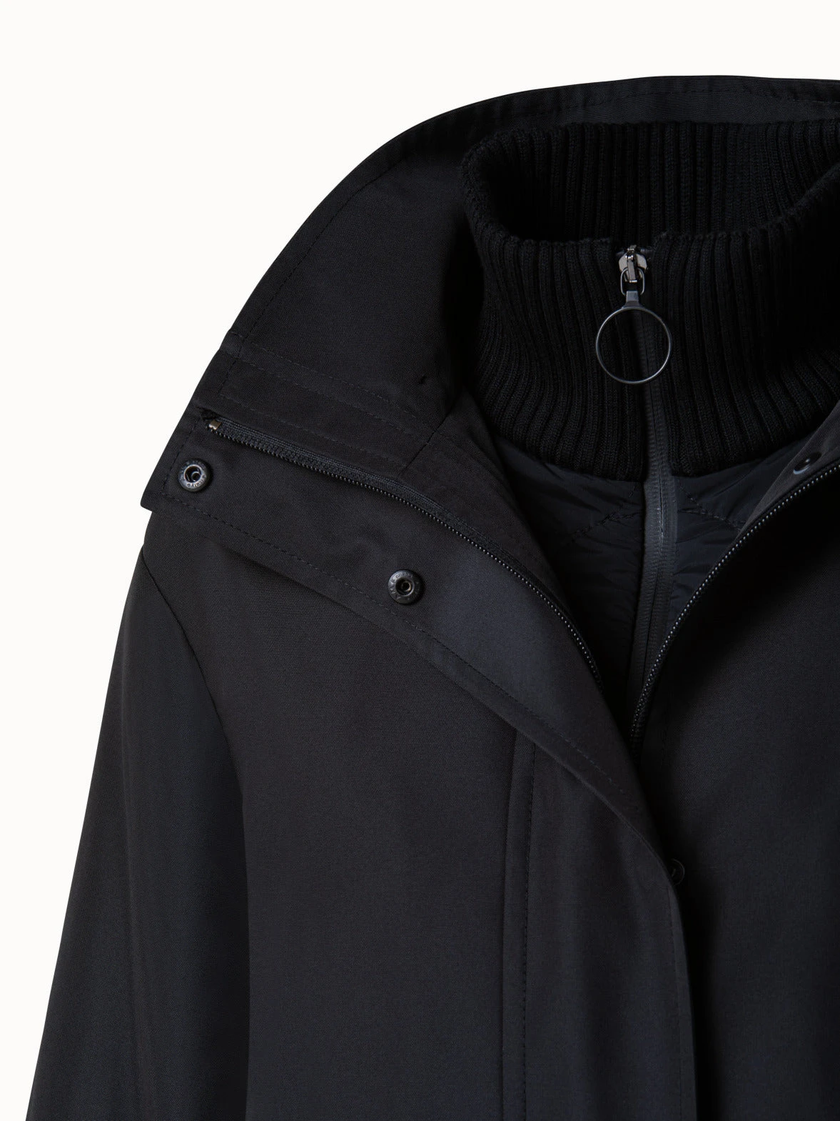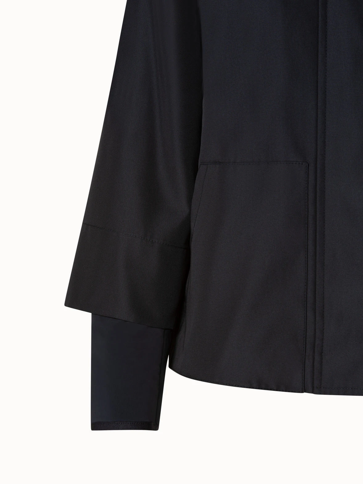 Water repellent a-line nylon jacket with detachable hood. Stand up collar, front zip & button closure, patch pockets, dropped shoulder, back box pleat, and 3/4 sleeve.