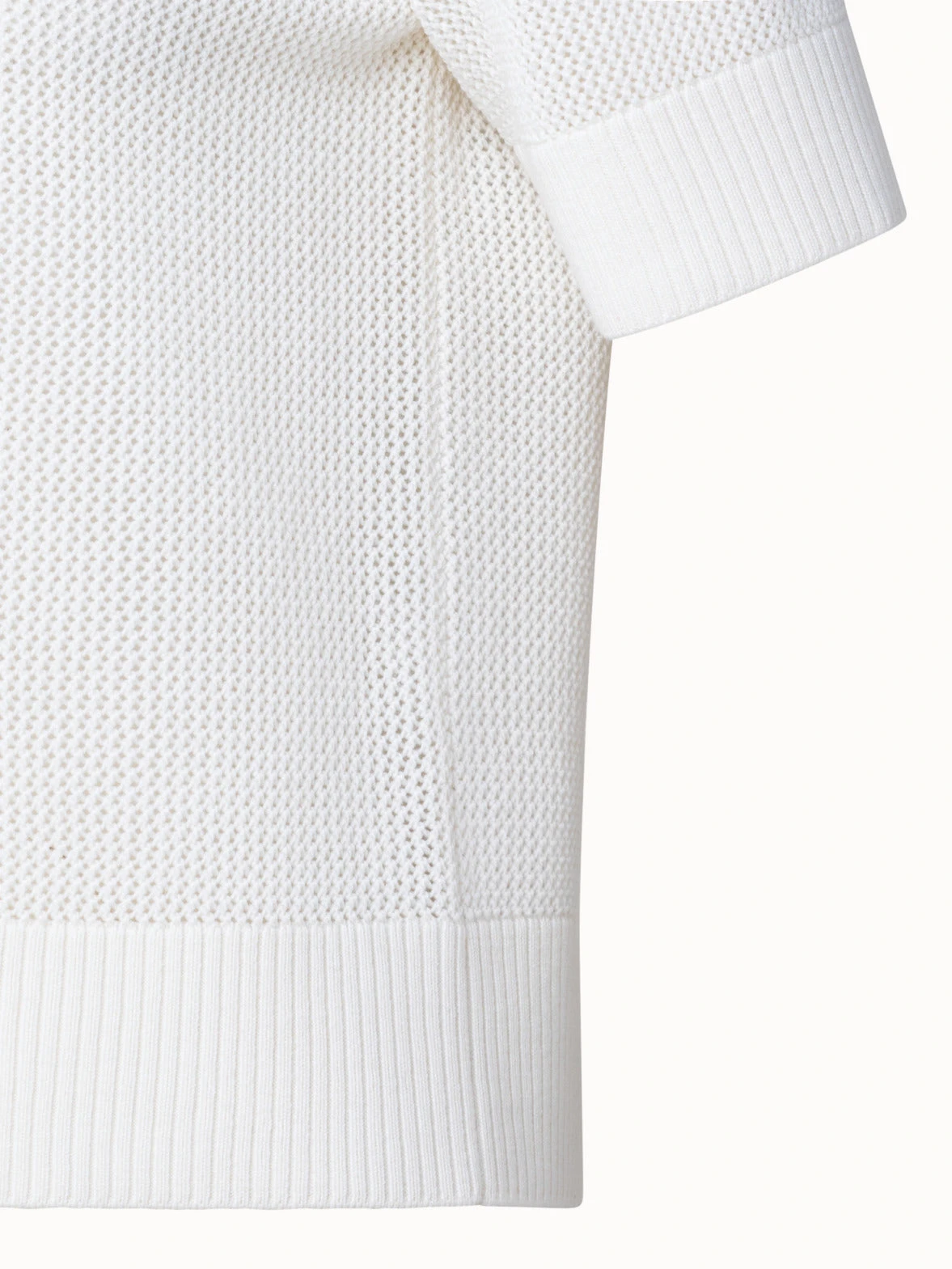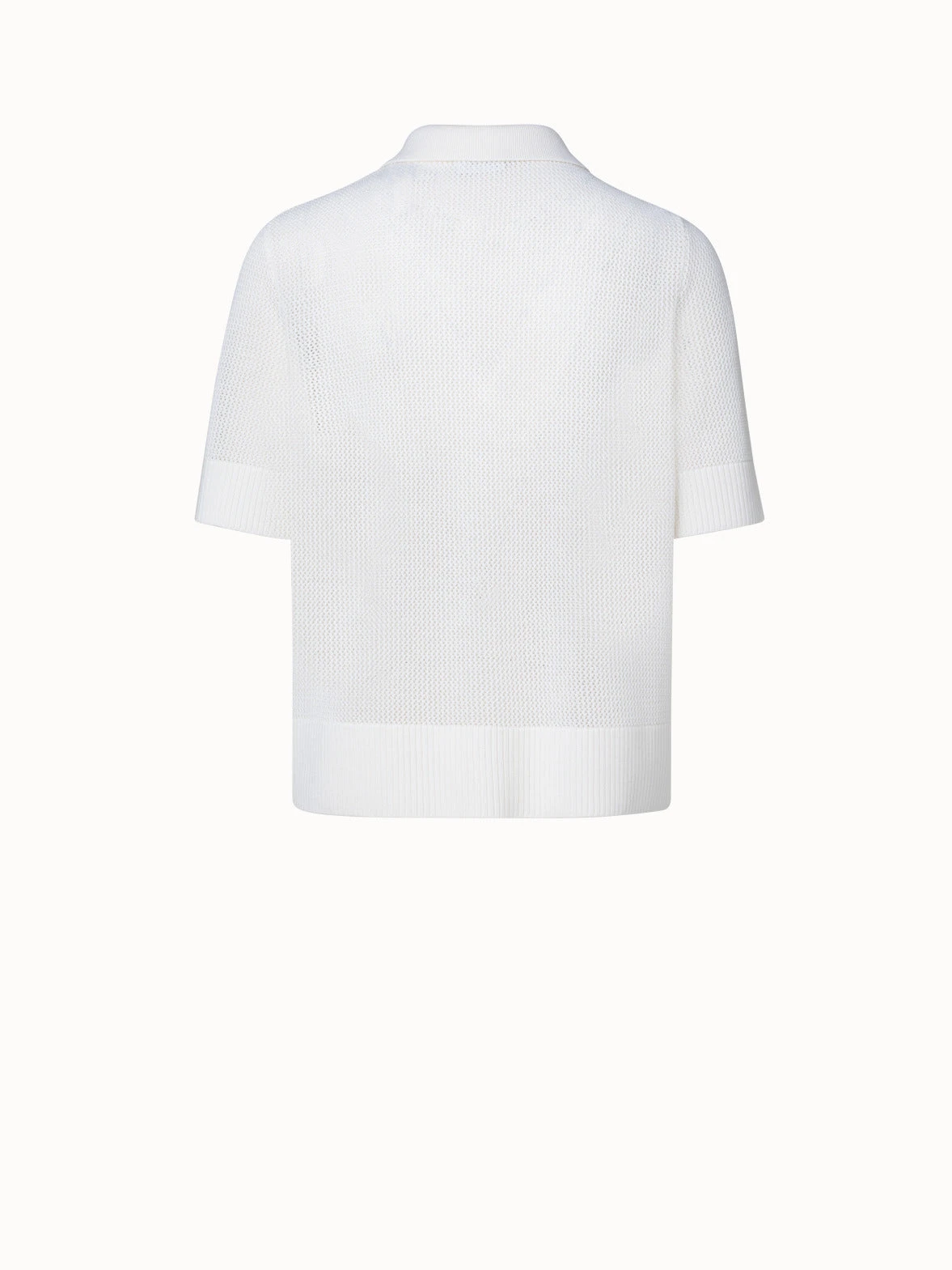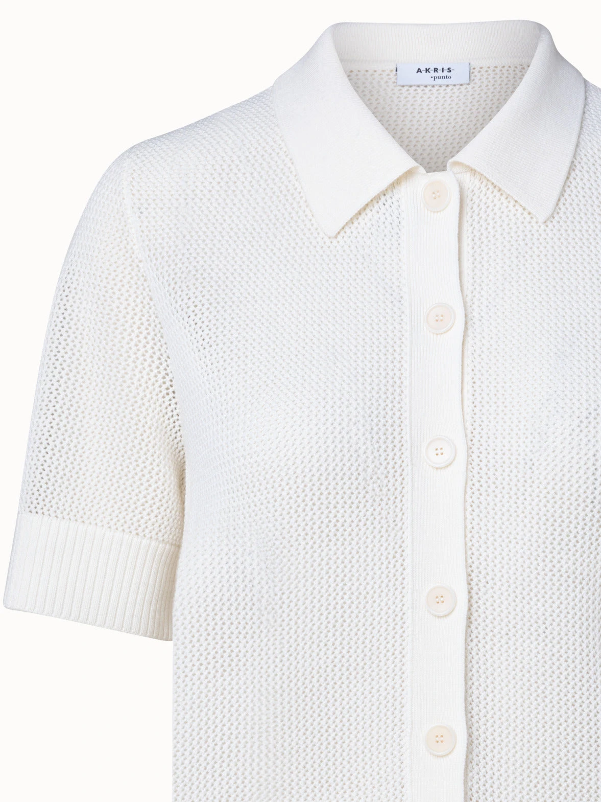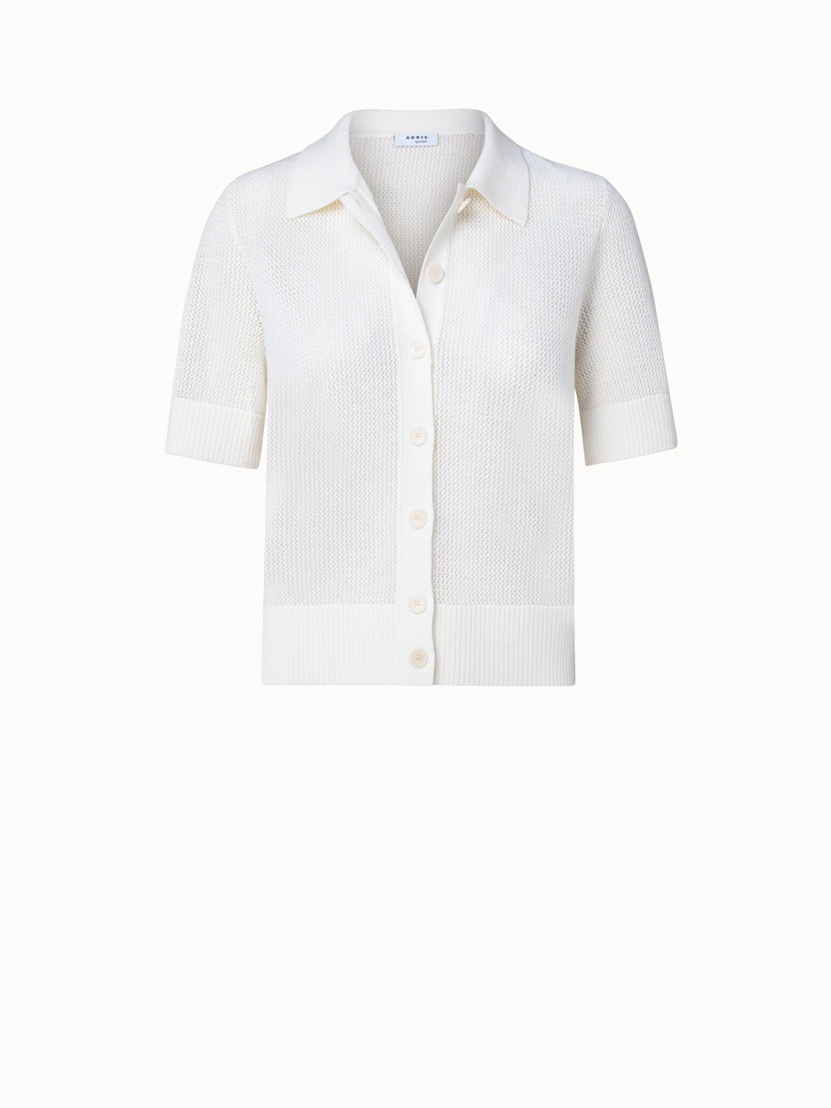 This Akris punto short sleeve cardigan is a perfect addition to any spring or summer wardrobe. Crafted in a merino wool crochet knit, it easily regulates temperature while creating a semi-transparent look. The boxy fit and spread collar make for a flattery silhouette that allows for versatile styling. Closes with buttons on the front.