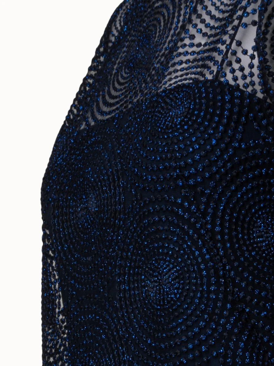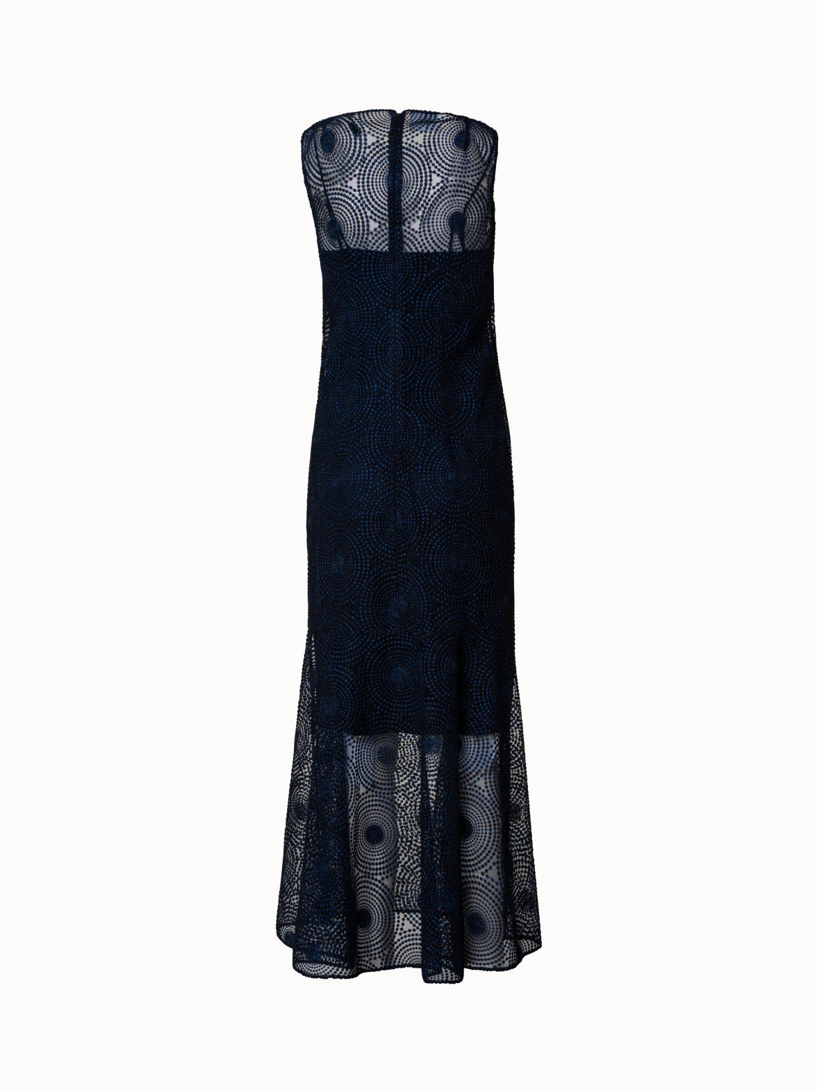 This Akris punto midi dress is crafted in metallic 3D dot embroidery on tulle, creating a shimmering lightweight silhouette with beautiful movement. It features a straight cut with a flared skirt. Side slits enable easy movement. Closes with a back zip. Includes a slip dress.