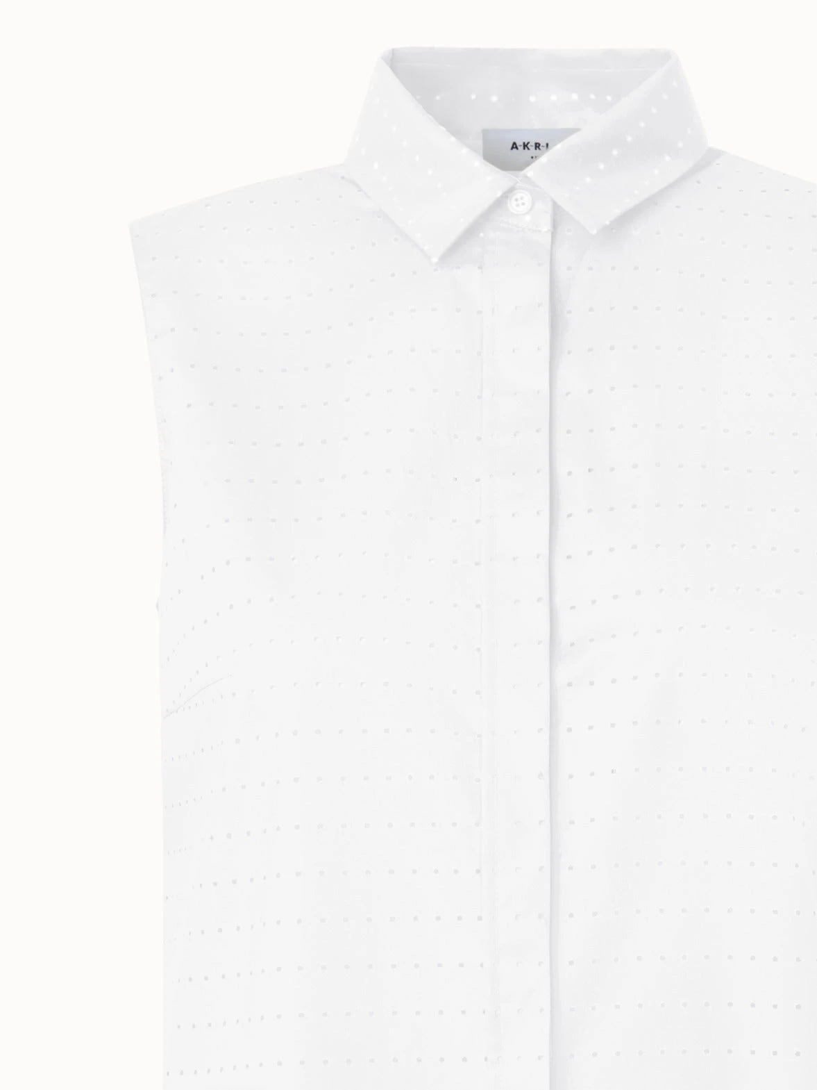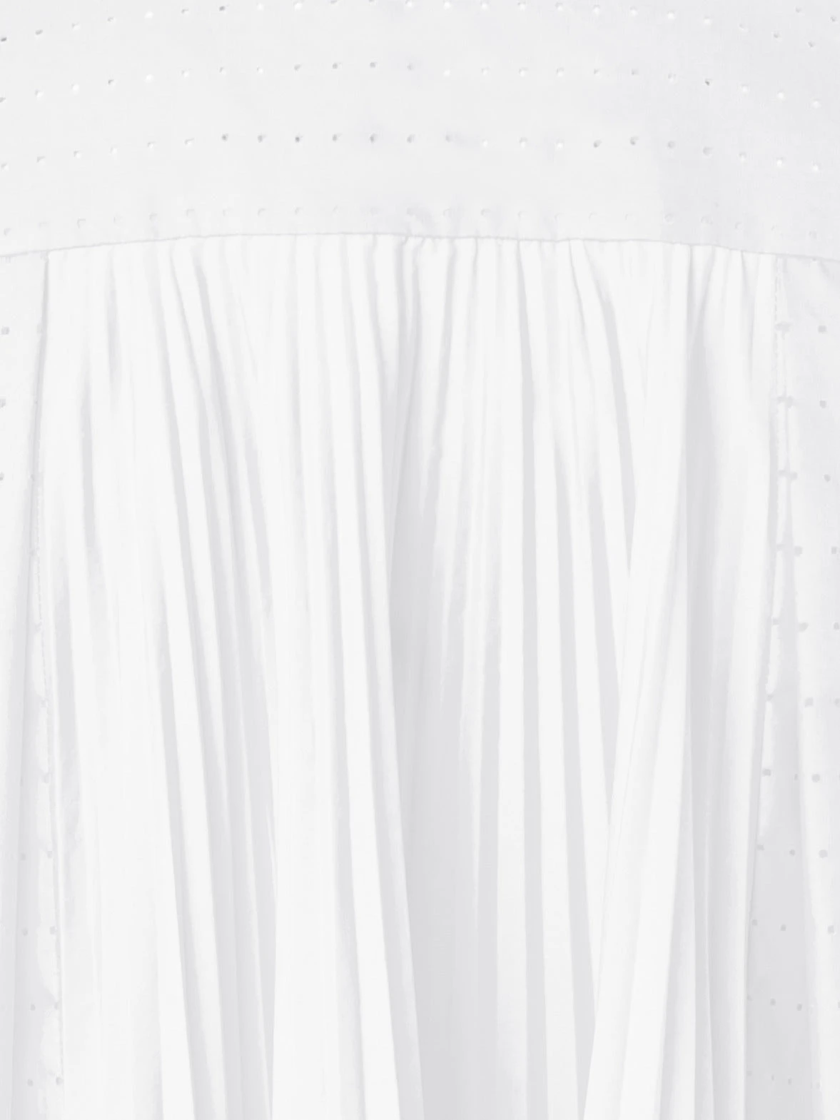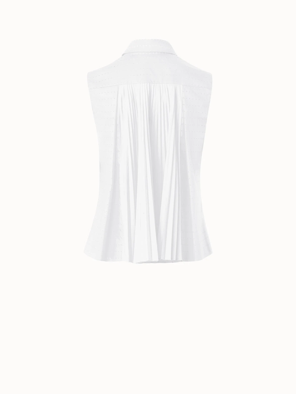 This Akris punto blouse is crafted in a perforated cotton poplin with a sunray plissée back that adds a beautiful structure and playful yet elegant movement to this style. The blouse features a kent collar and concealed button closure. The slight A-line creates a flattering silhouette.