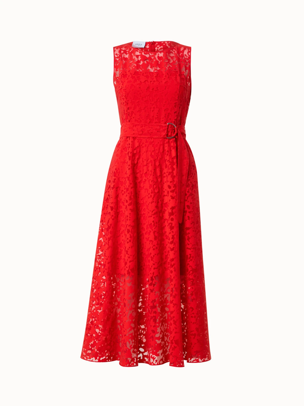 This Akris punto dress is crafted in a lightweight kaleidoscope organzino that plays with structure and transparency. The sleeveless A-line silhouette and boat neck create a feminine silhouette that is accentuated by the included belt. Side seam pockets add functionality. Closes with a back zip.