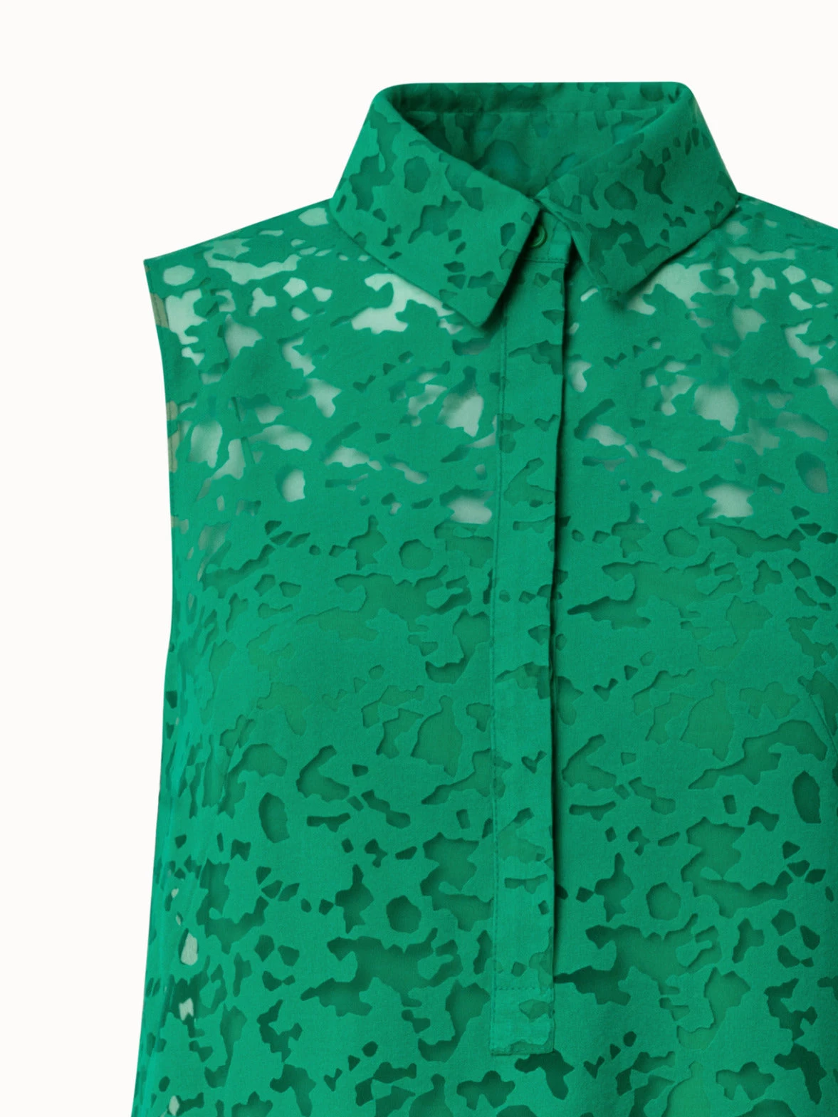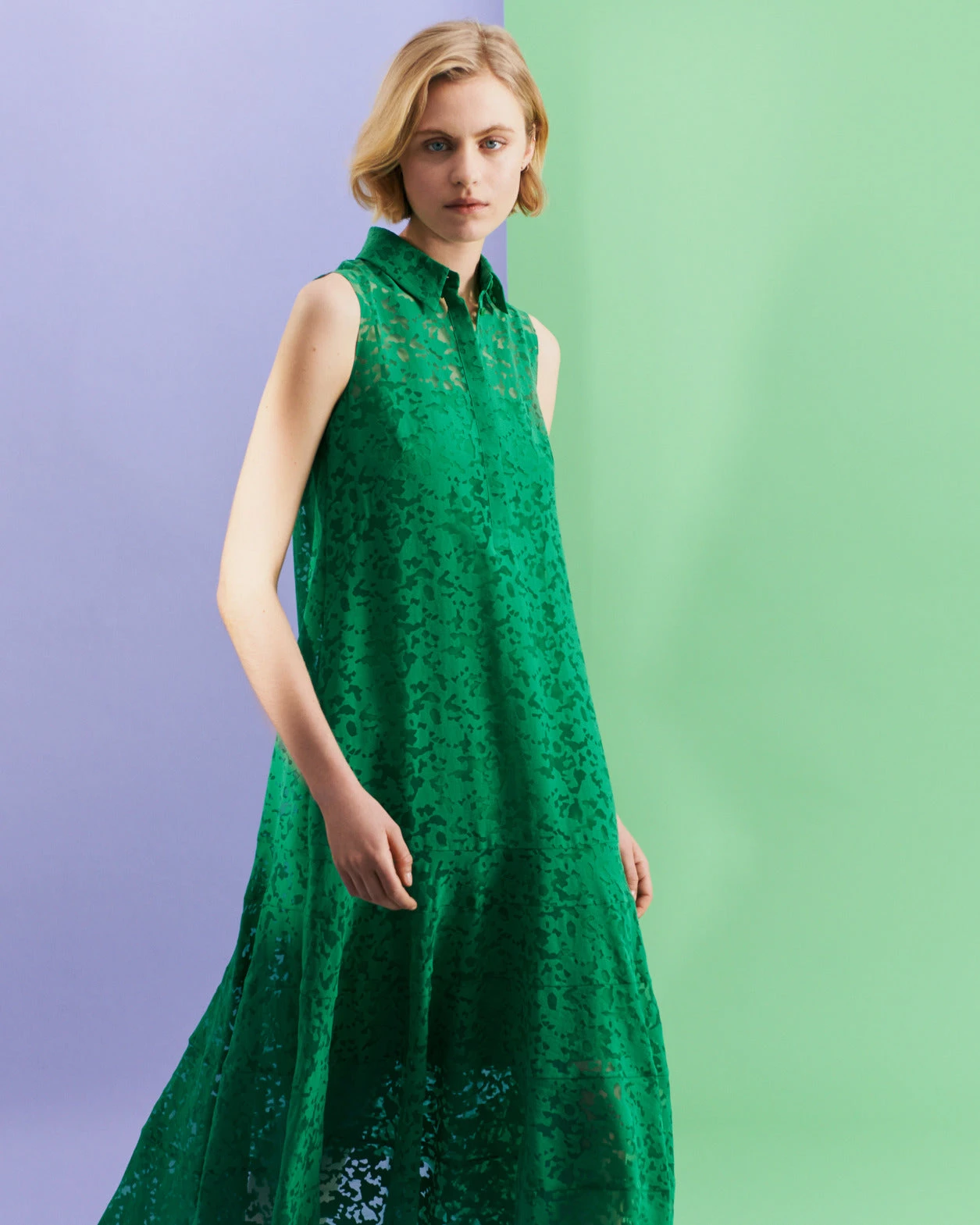 This Akris punto midi dress is crafted in a lightweight kaleidoscope organzino that plays with structure and transparency. The sleeveless top features a polo collar and a covered button placket that create a sleek look. The tiered A-line skirt creates a natural flow and completes this easy-going silhouette. Side seam pockets add functionality. Includes a slip dress.