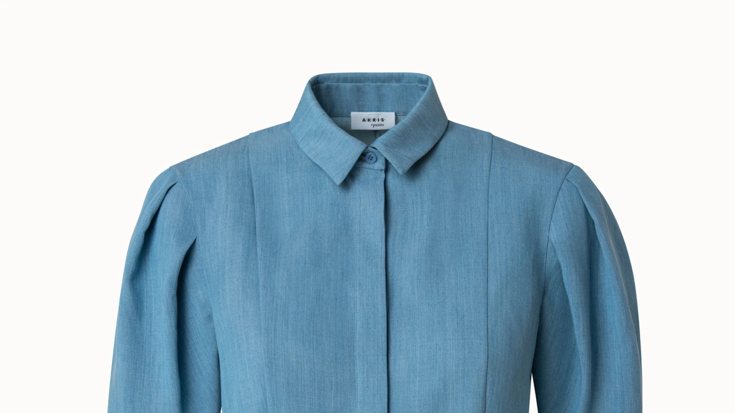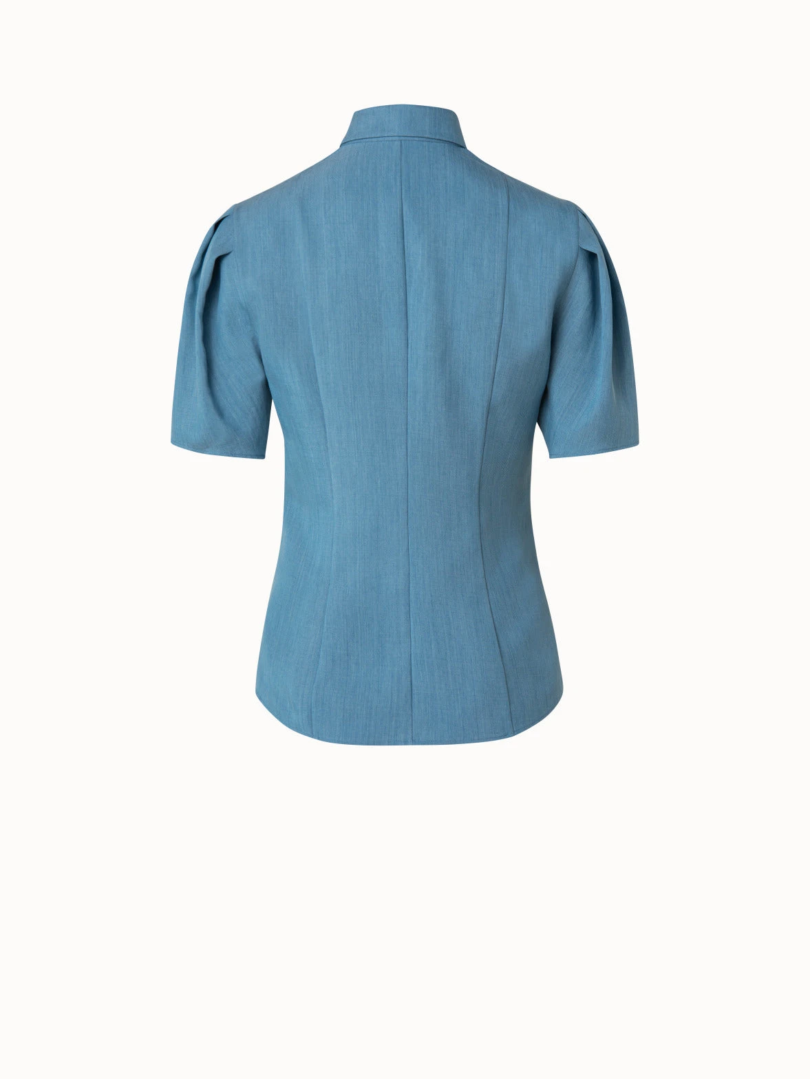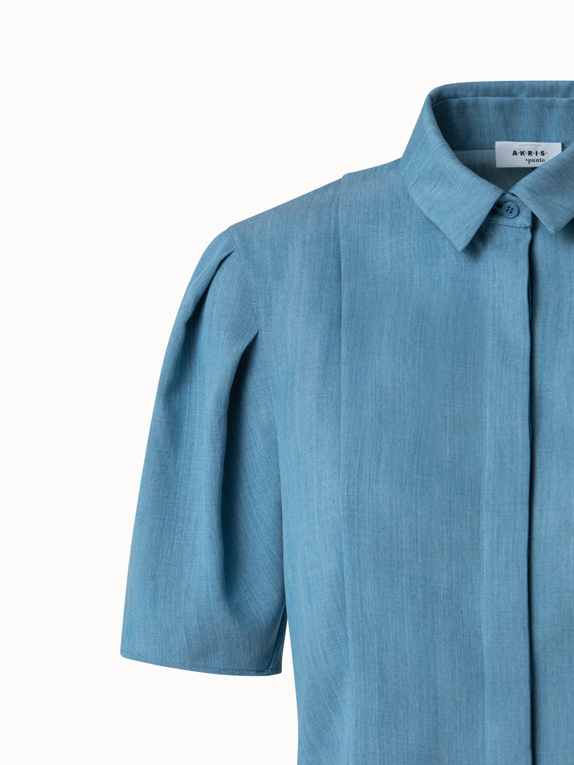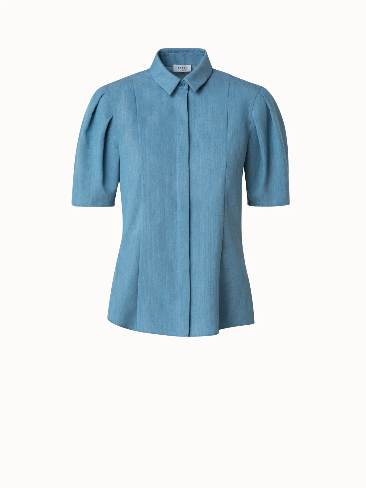 This Akris punto washed viscose denim blouse is fitted with a spread collar and concealed front button closure. The delightful detail lies in the sleeves: Three pleats puff sleeves giving a refined feel. With side slits, it becomes a comfortable silhouette for Summer.