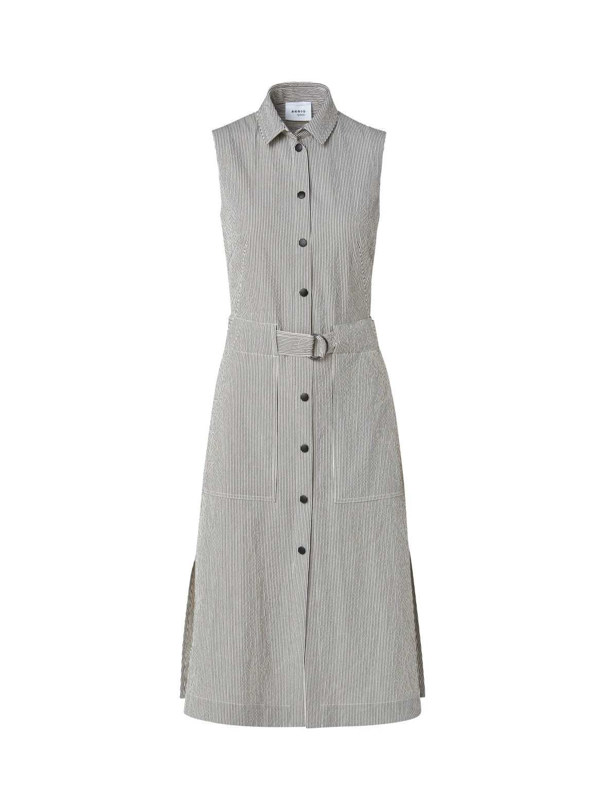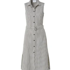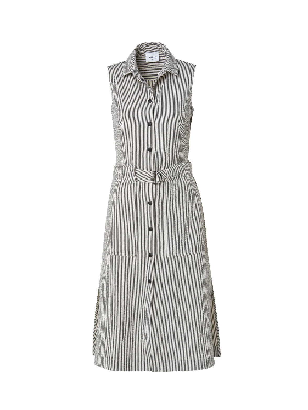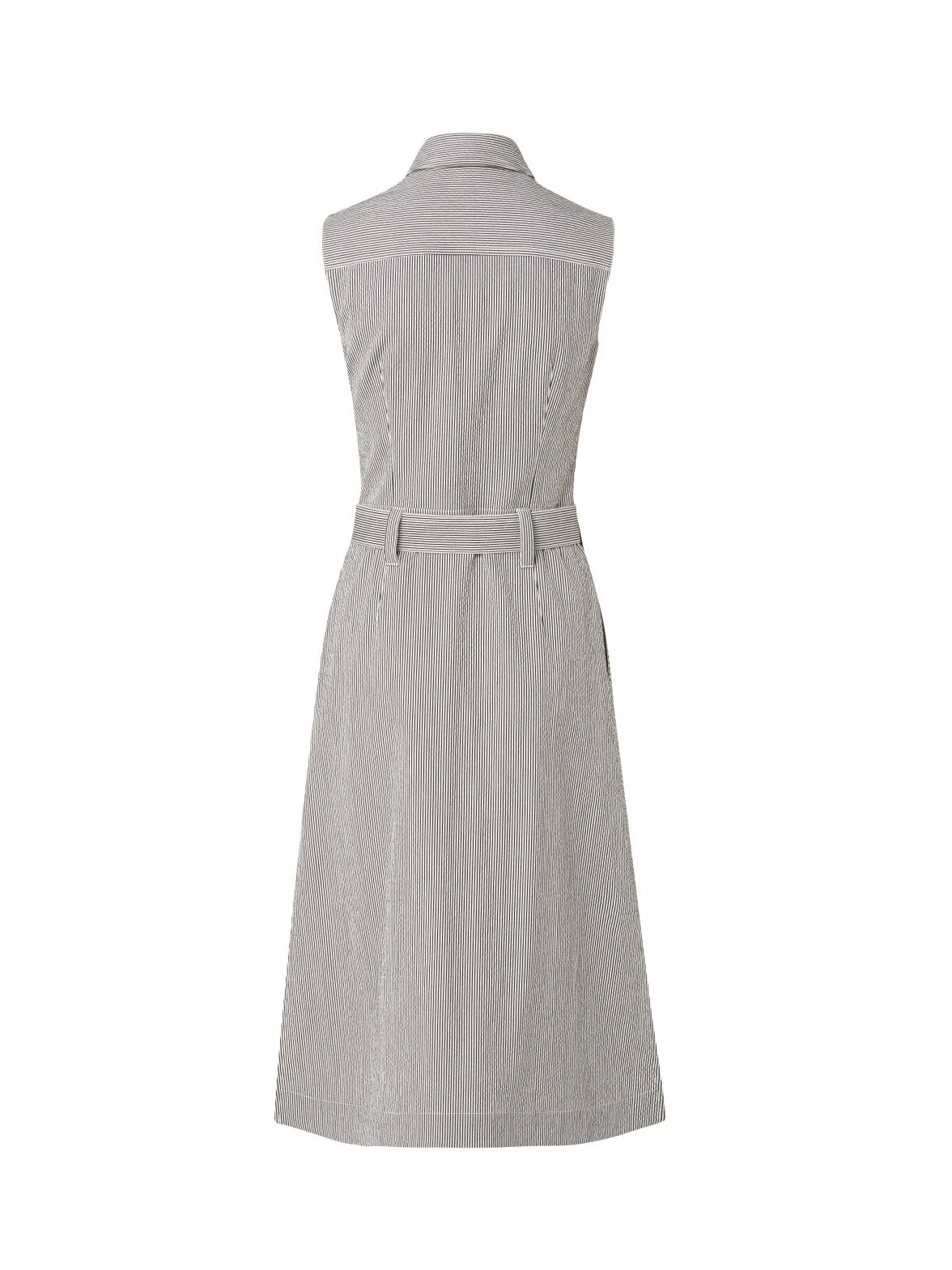 This lightweight midi dress is crafted from striped cotton seersucker that will keep you cool and stylish on hot summer days. The sleeveless silhouette features a spread collar, concealed button placket, and a matching belt to cinch your waist for more definition. The slightly A-line skirt is breezy and creates movement as you walk.