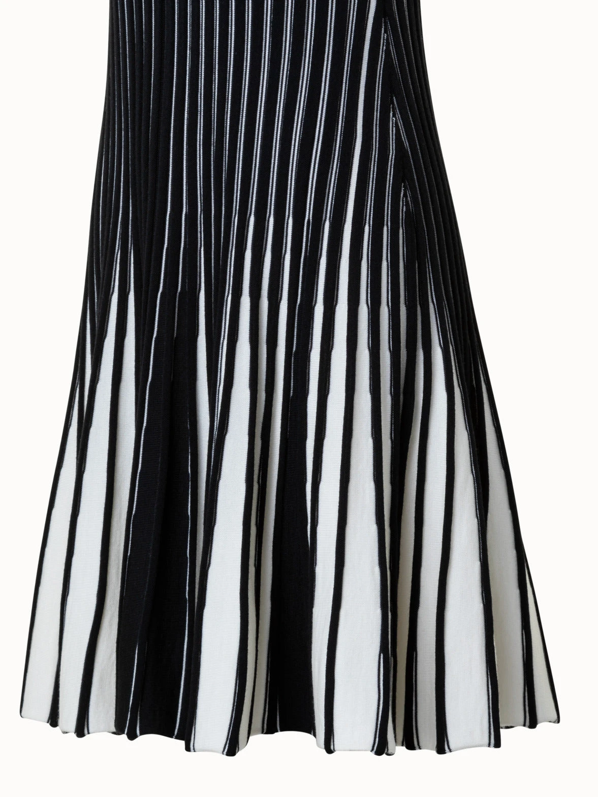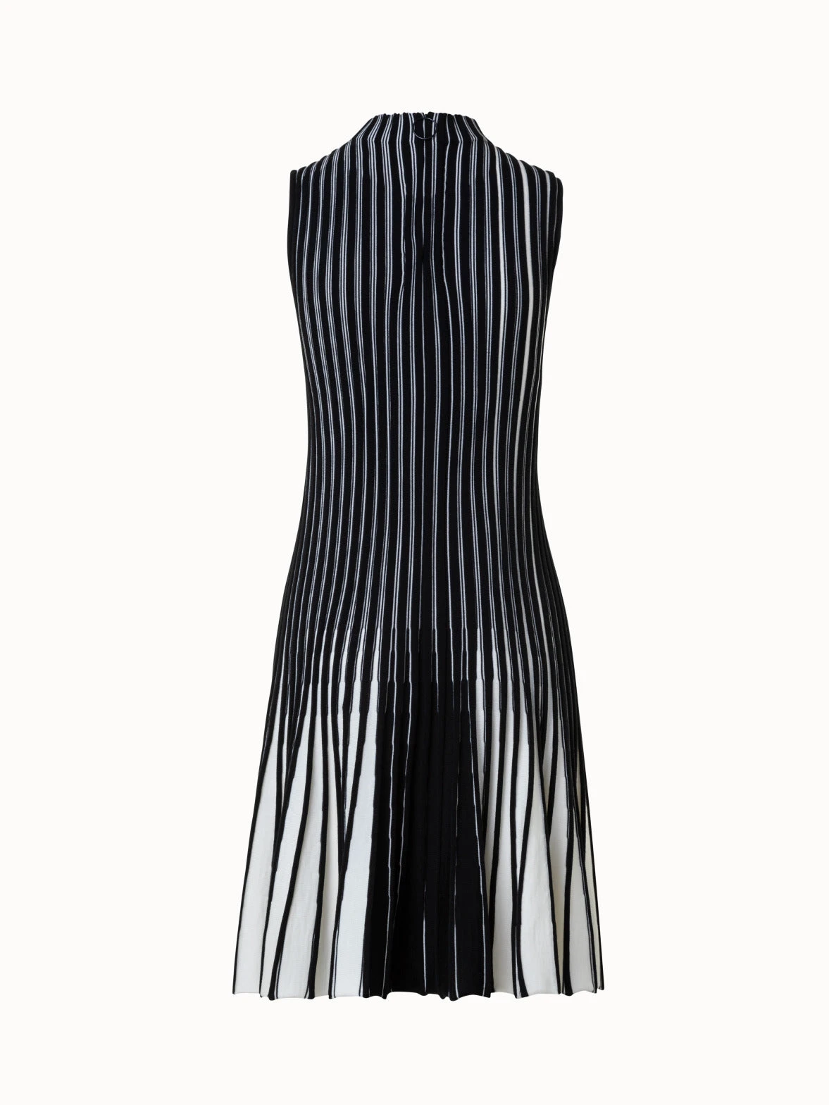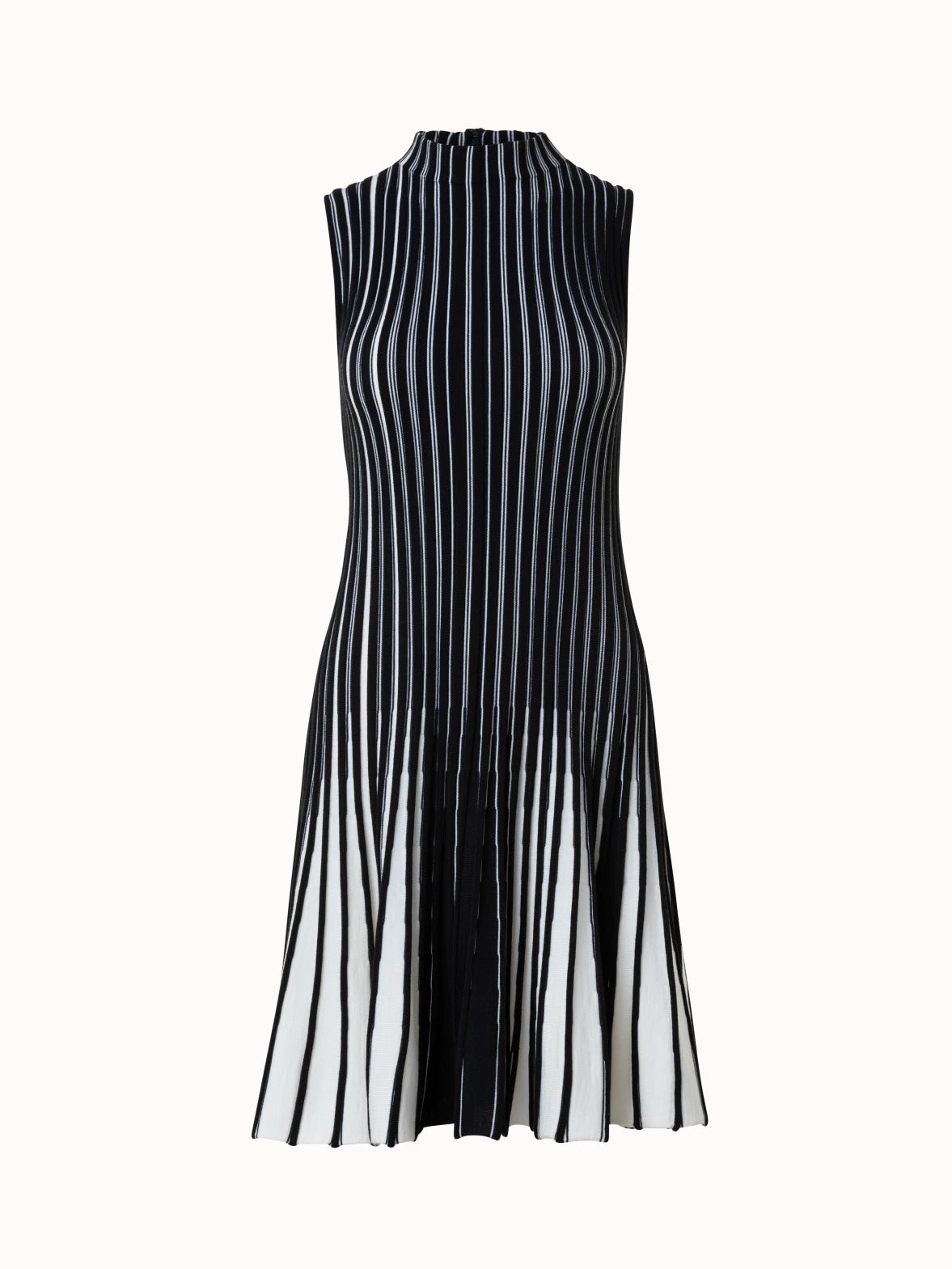 This Akris punto dress is crafted in a two-tone merino wool knit with a striped, ribbed structure. The fitted top and flared skirt create a flattering silhouette. Closes with a back zip.