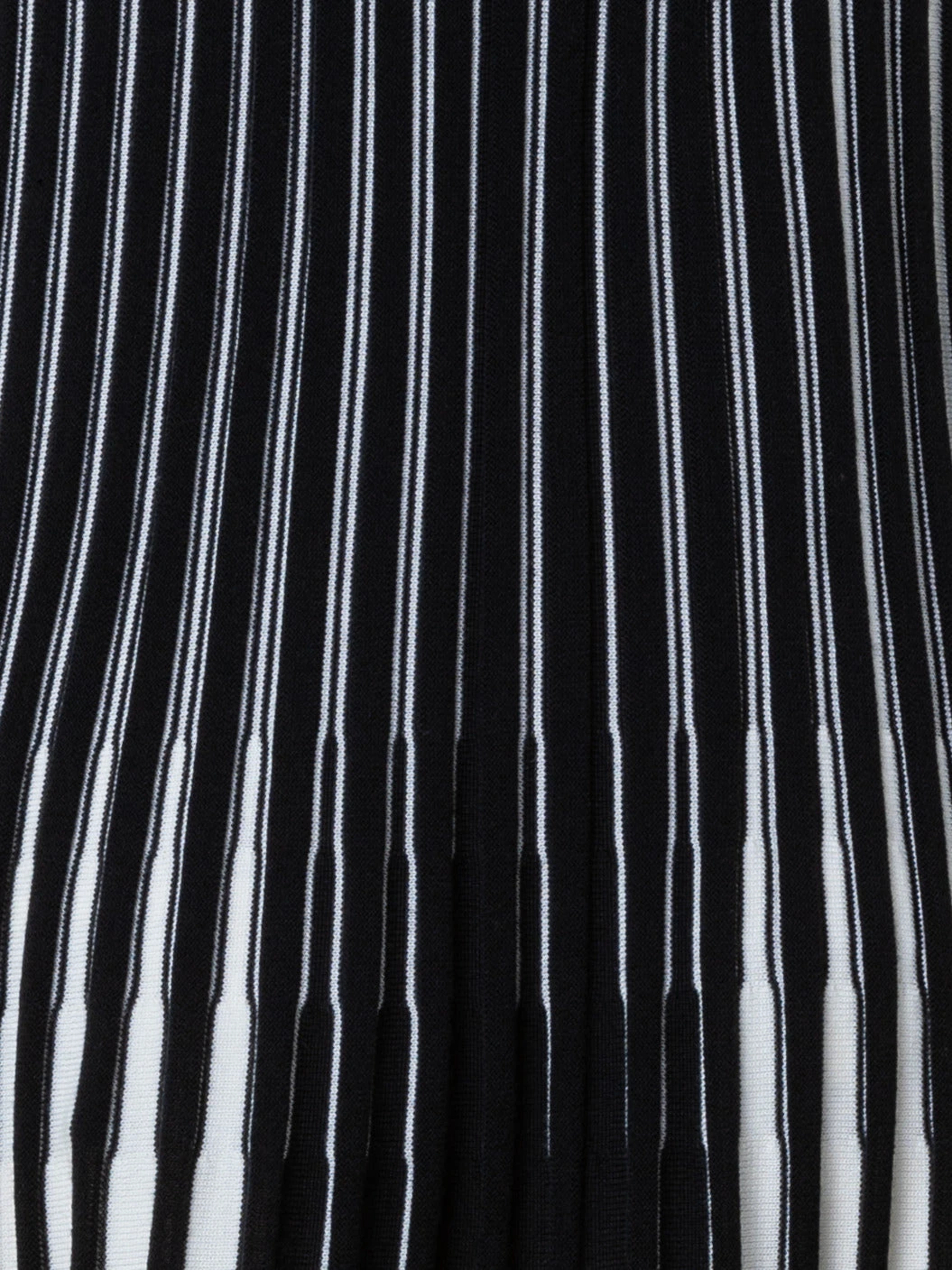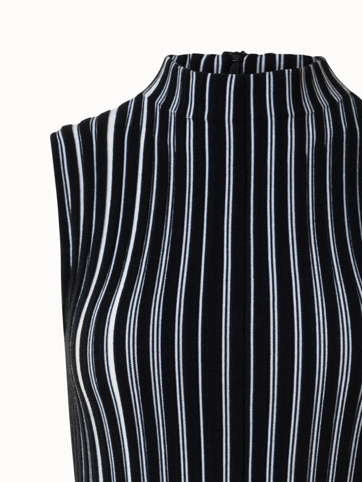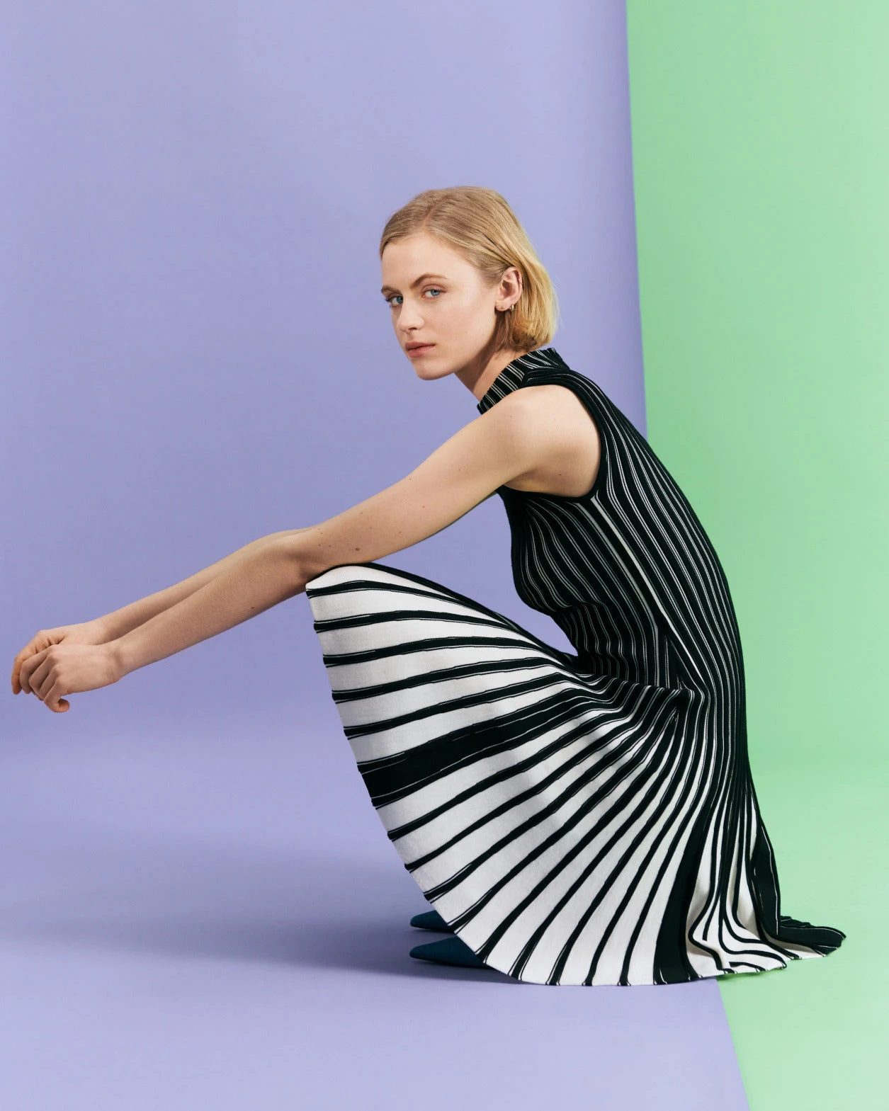 This Akris punto dress is crafted in a two-tone merino wool knit with a striped, ribbed structure. The fitted top and flared skirt create a flattering silhouette. Closes with a back zip.