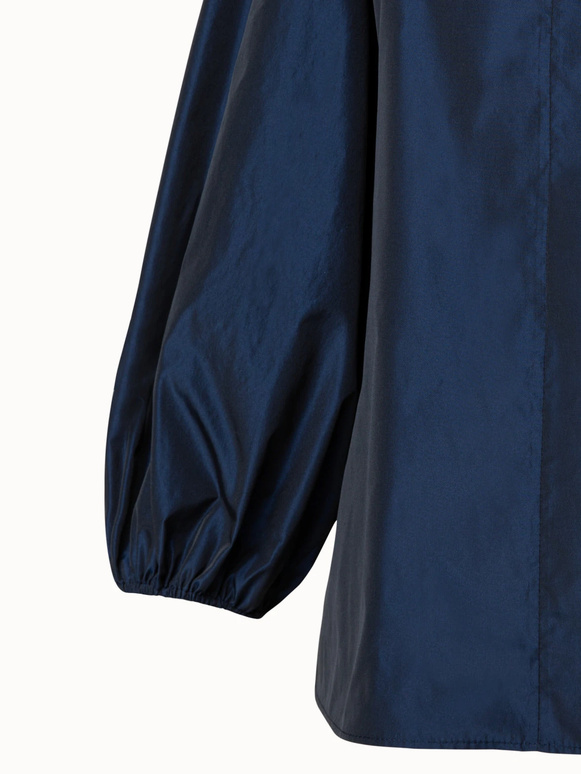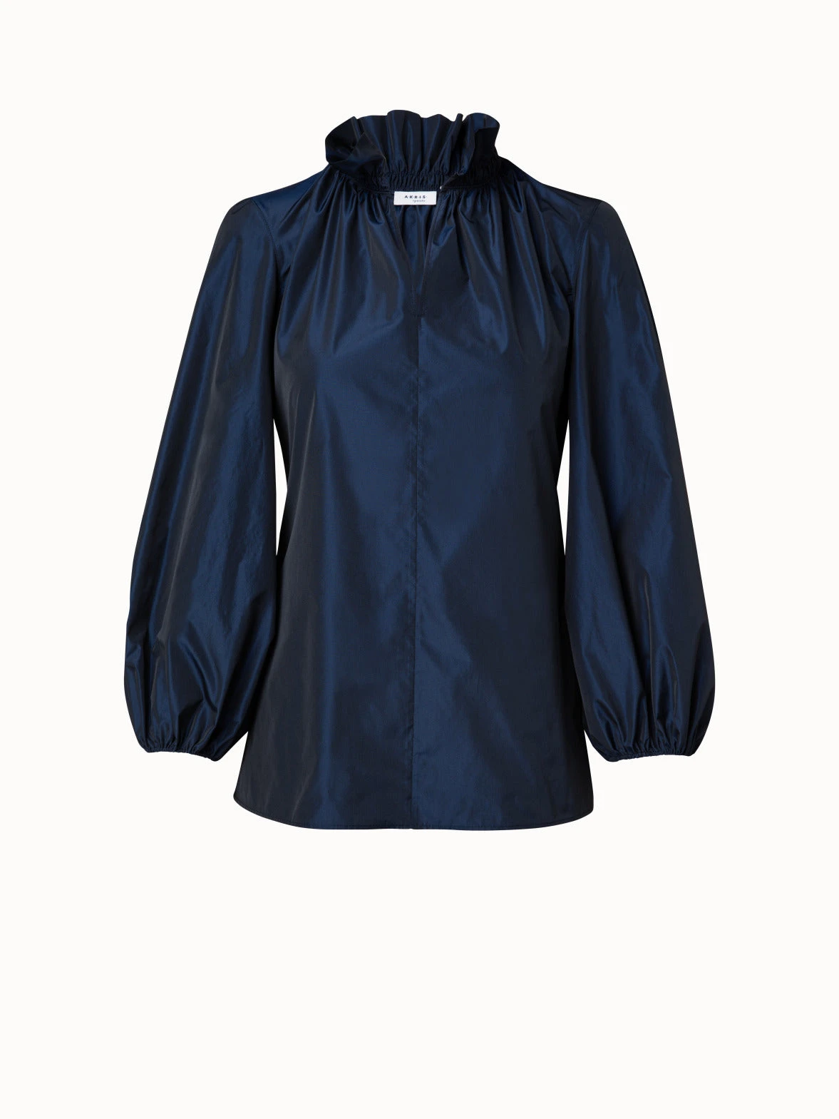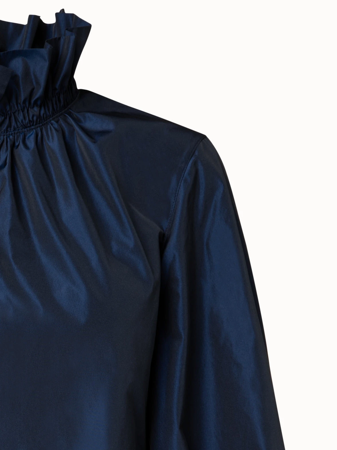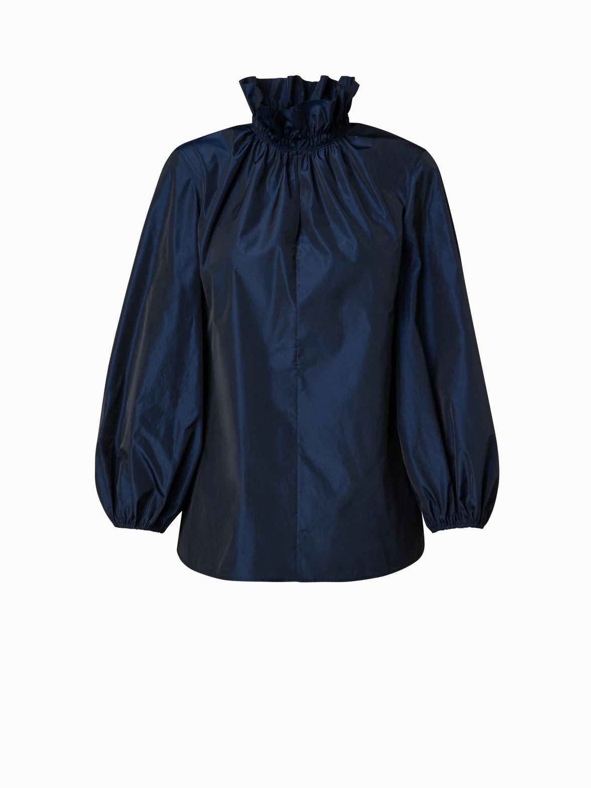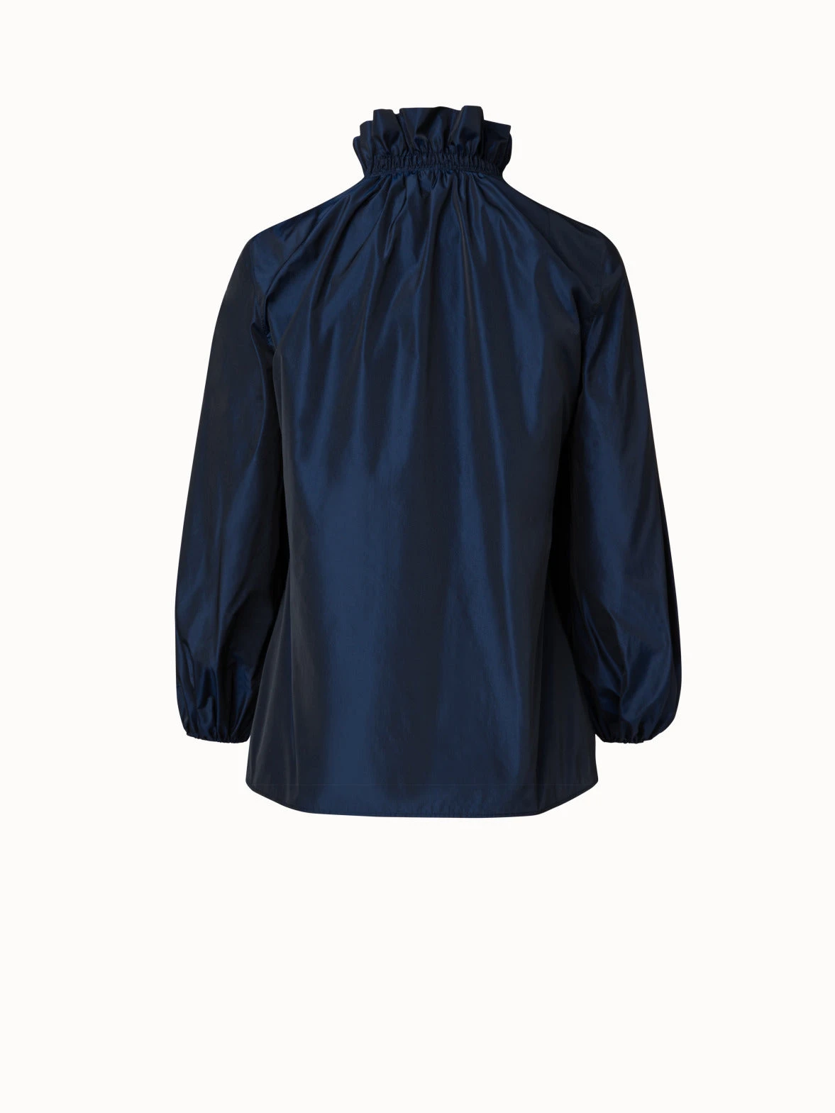This Akris punto blouse creates a stand-out look with exciting volumes and an elegantly shimmering techno taffeta fabric. It features a stand-up ruffle collar with hook closure, a relaxed fit body, and voluminous bishop sleeves.