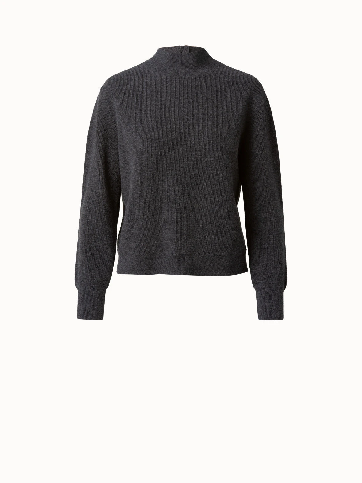 This Akris punto pullover is crafted in a refined wool and cashmere blend rib knit. It is cut for a modern silhouette with a mock neck, dropped shoulders, and a slightly boxy body. The back zip adds a signature Akris punto detail with a circle puller.
