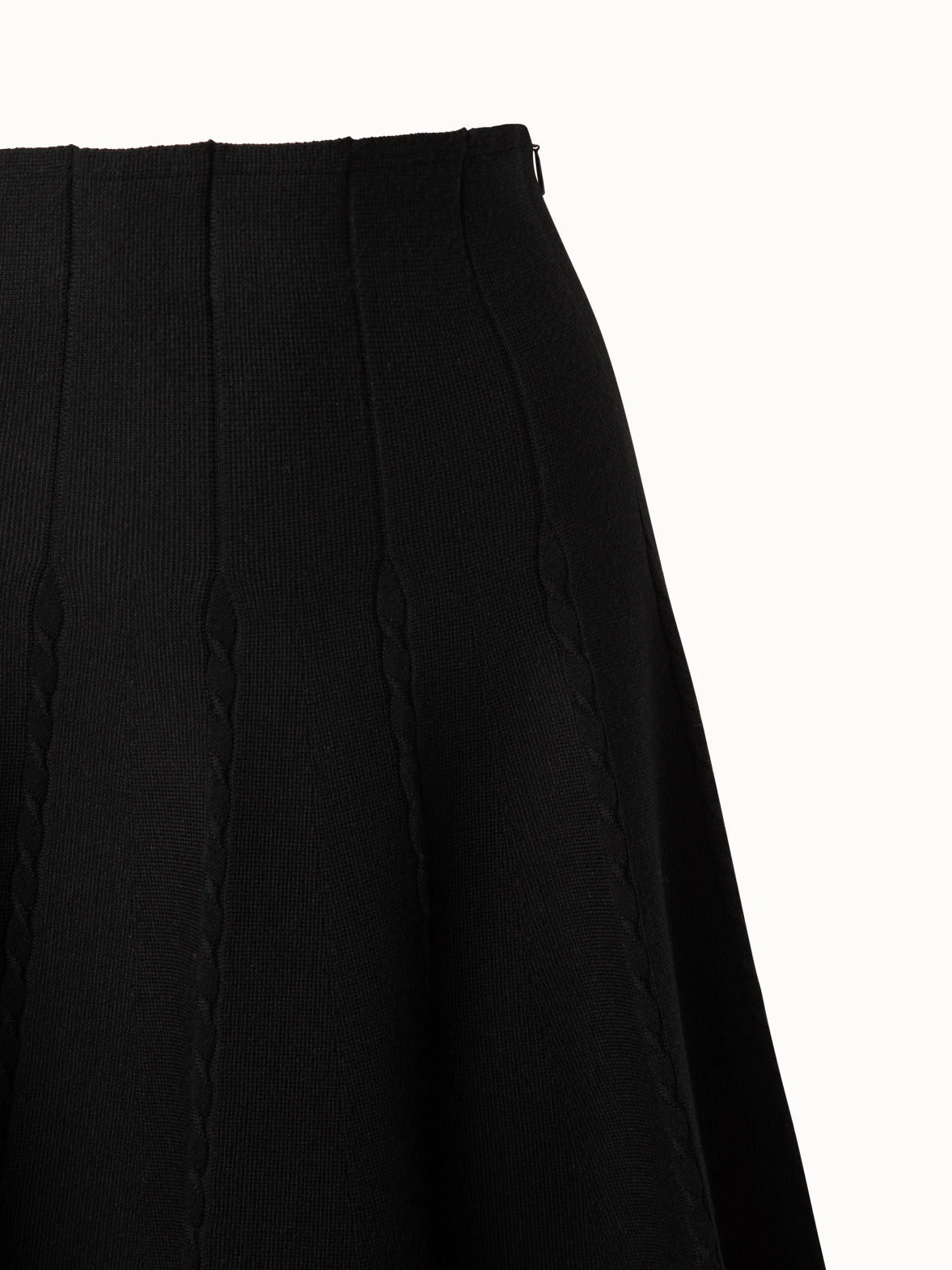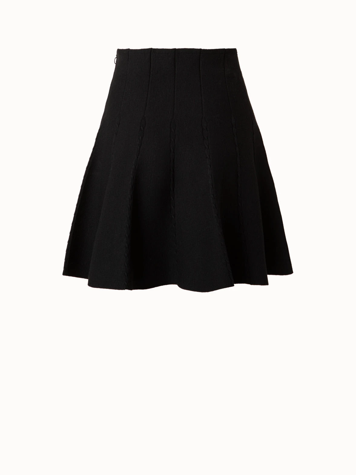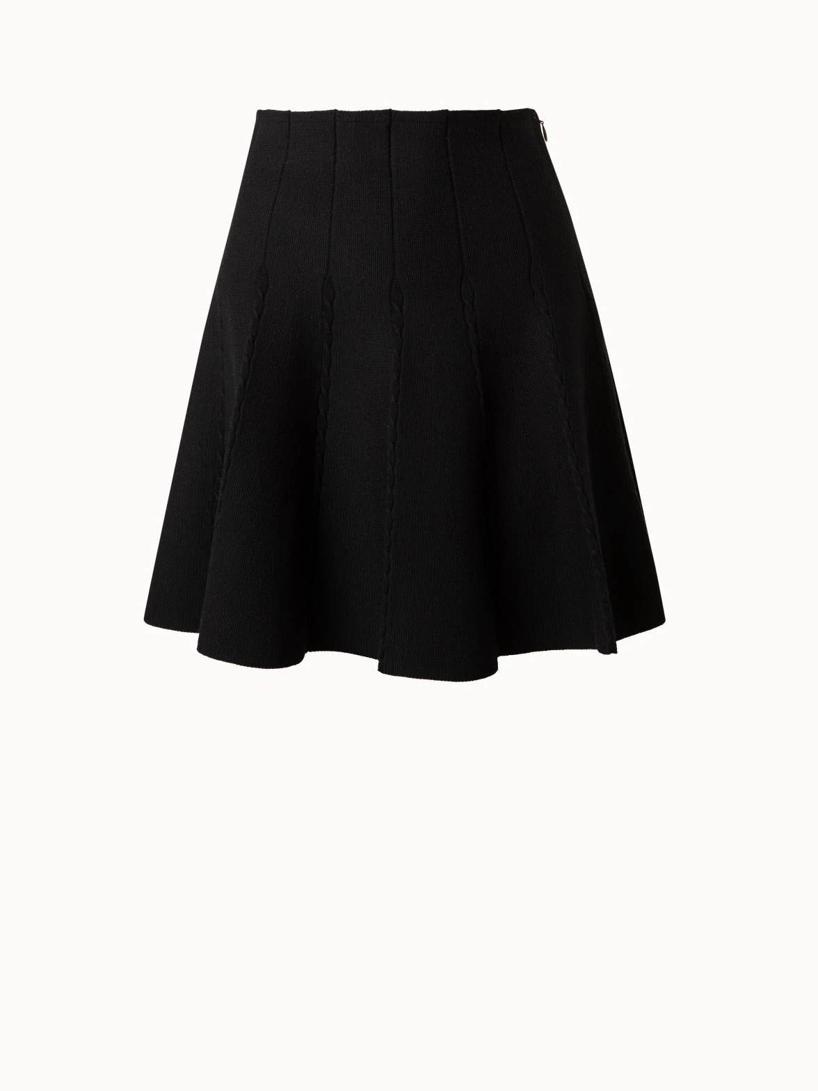 This Akris punto skirt presents exceptional craftsmanship in a modern form. The wool stretch knit features cable knit details at each pleat, creating a unique structure. It is cut to end over the knee and features a flared silhouette with a fitted waist. Closes with side zip.